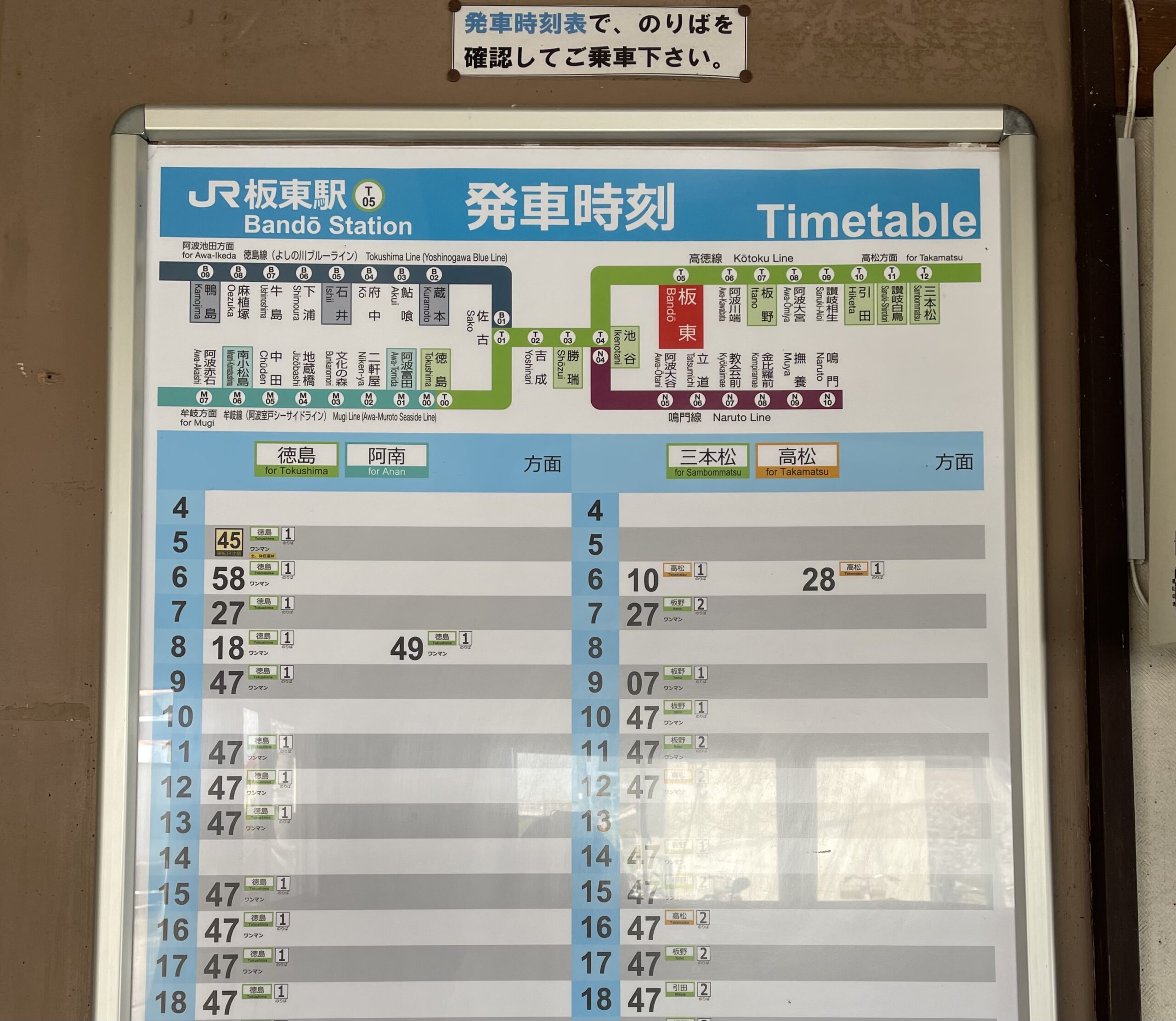 ・板東駅から電車に乗る時は、何番線のホームから出発するか要確認!(駅舎内の時刻表に記載あり)
