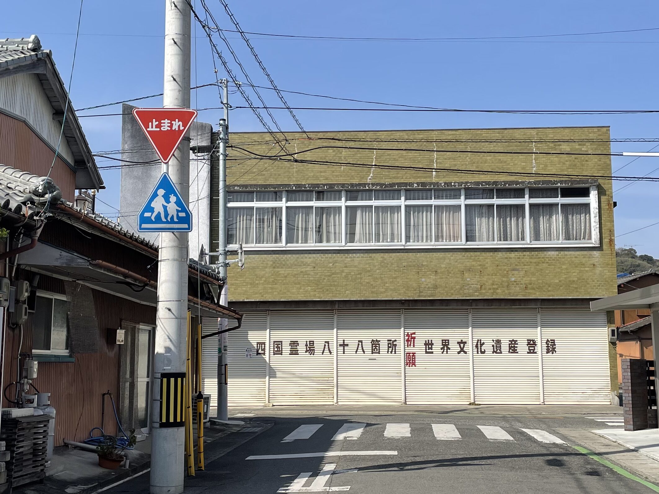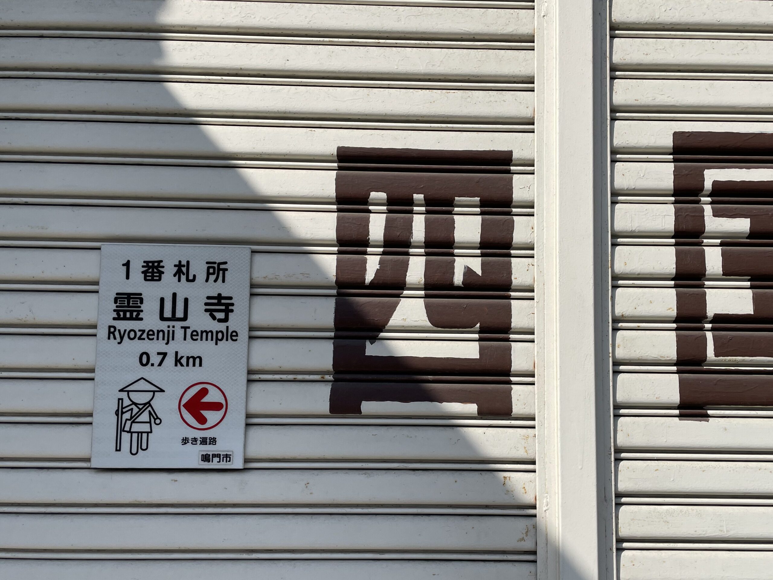 地図の示すとおり駅舎を背にまっすぐ進むと突き当たりに閉店した商店?があり、そのシャッターには「祈願 四国霊場八十八ヶ所 世界文化遺産登録」の文字が。それならまず駅にもうちょっと大きく矢印をください…。と思いながら近づいていくと、記念すべき最初の「歩き遍路みちしるべ」を発見!これから毎日、毎日このみちしるべに助けられながら(そして時には惑わされながら笑)歩くことになる。