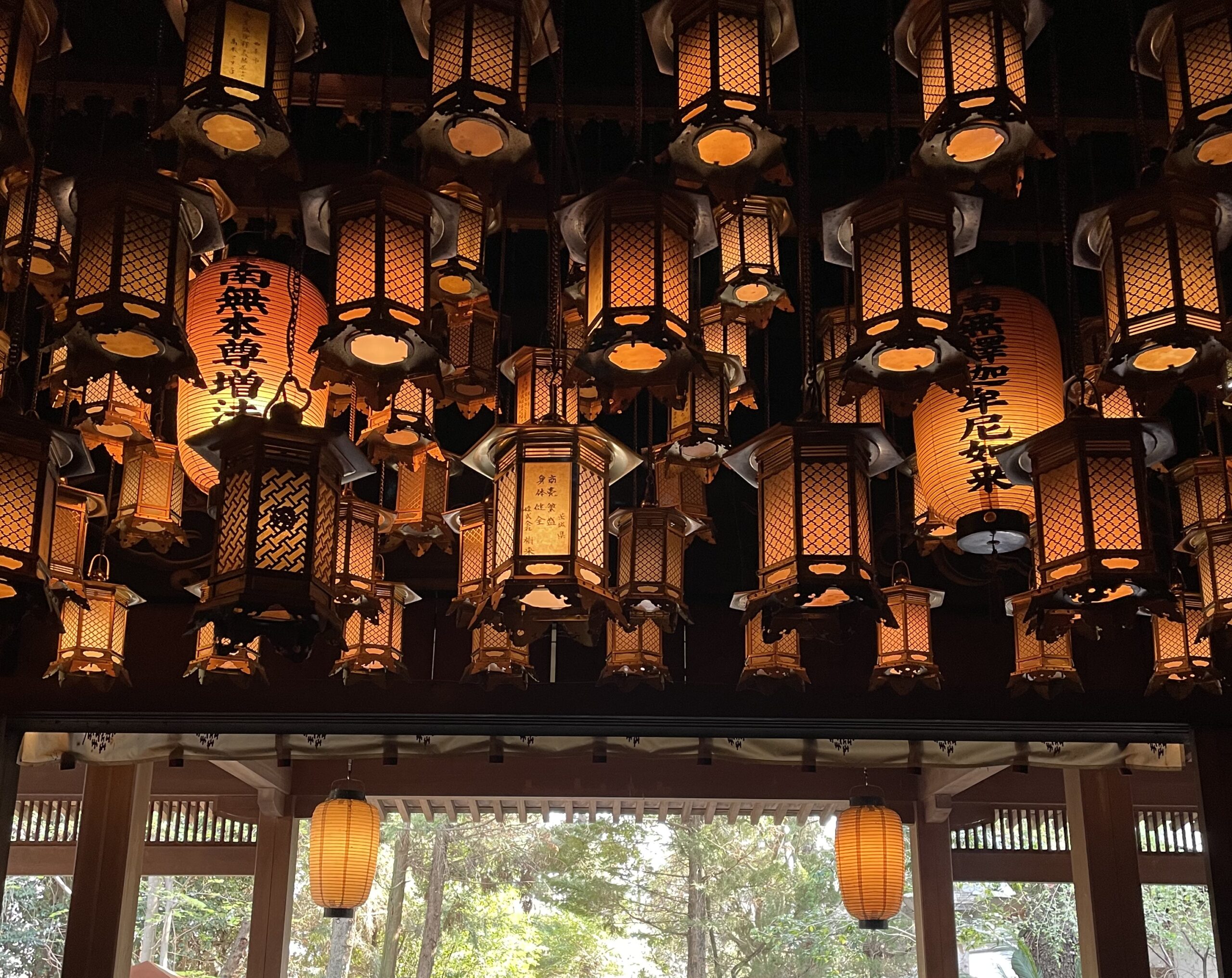 買い出しの前に、ご挨拶のお参りをした。山門をくぐると大きな池があり、境内には常に水の音がしてとても心地がよい空気だった。本堂は正面の松林の奥にあり少し薄暗く見えたが、近づいてみると広い堂内の天井一面が見事な吊り灯篭に埋め尽くされており、圧倒されてしばし見入ってしまった。…どうやら中まで入ってもいいみたい。恐る恐る堂内へ。