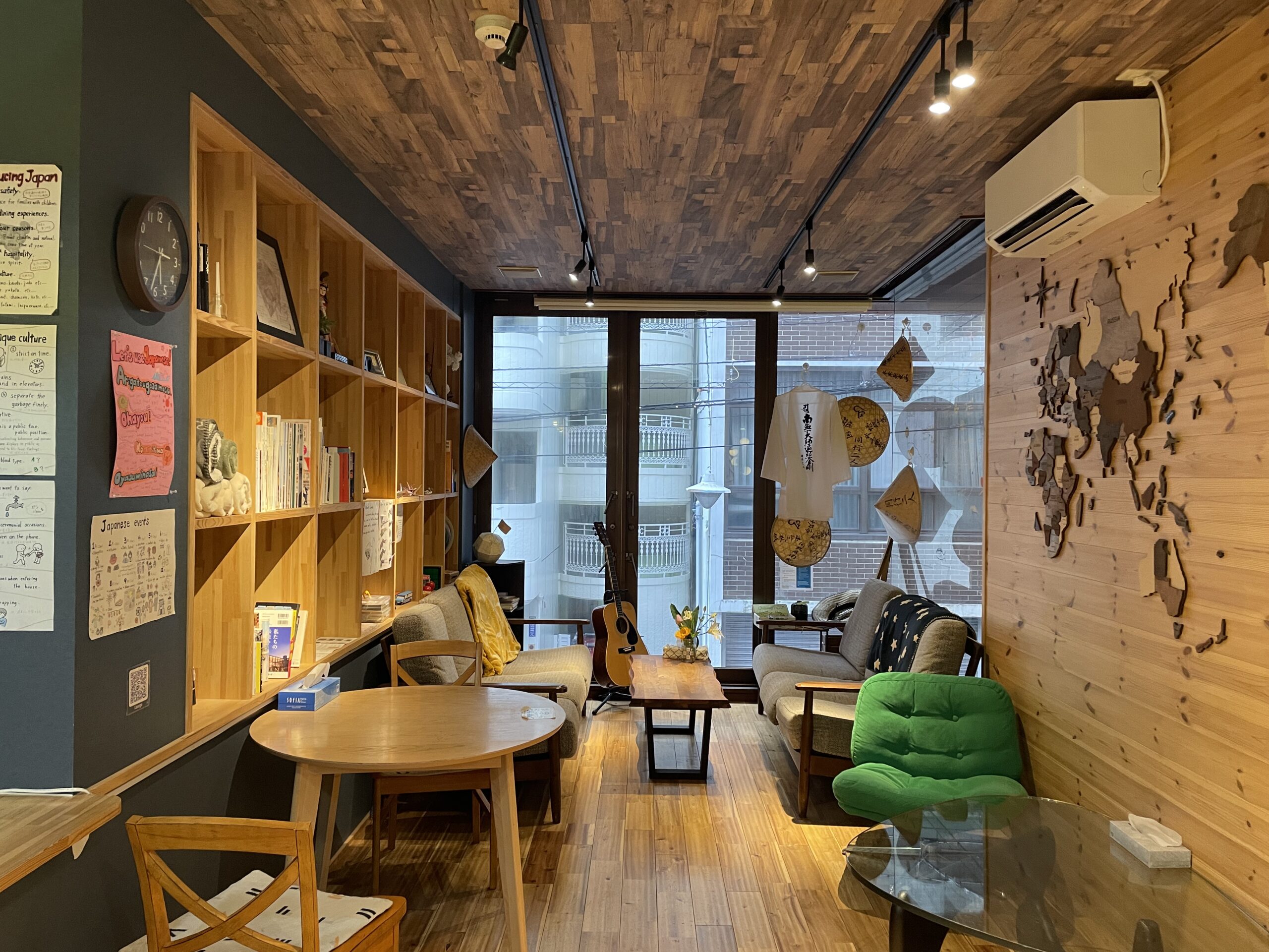 ホステルの共用スペース。ここでコンビニごはんを食べた。