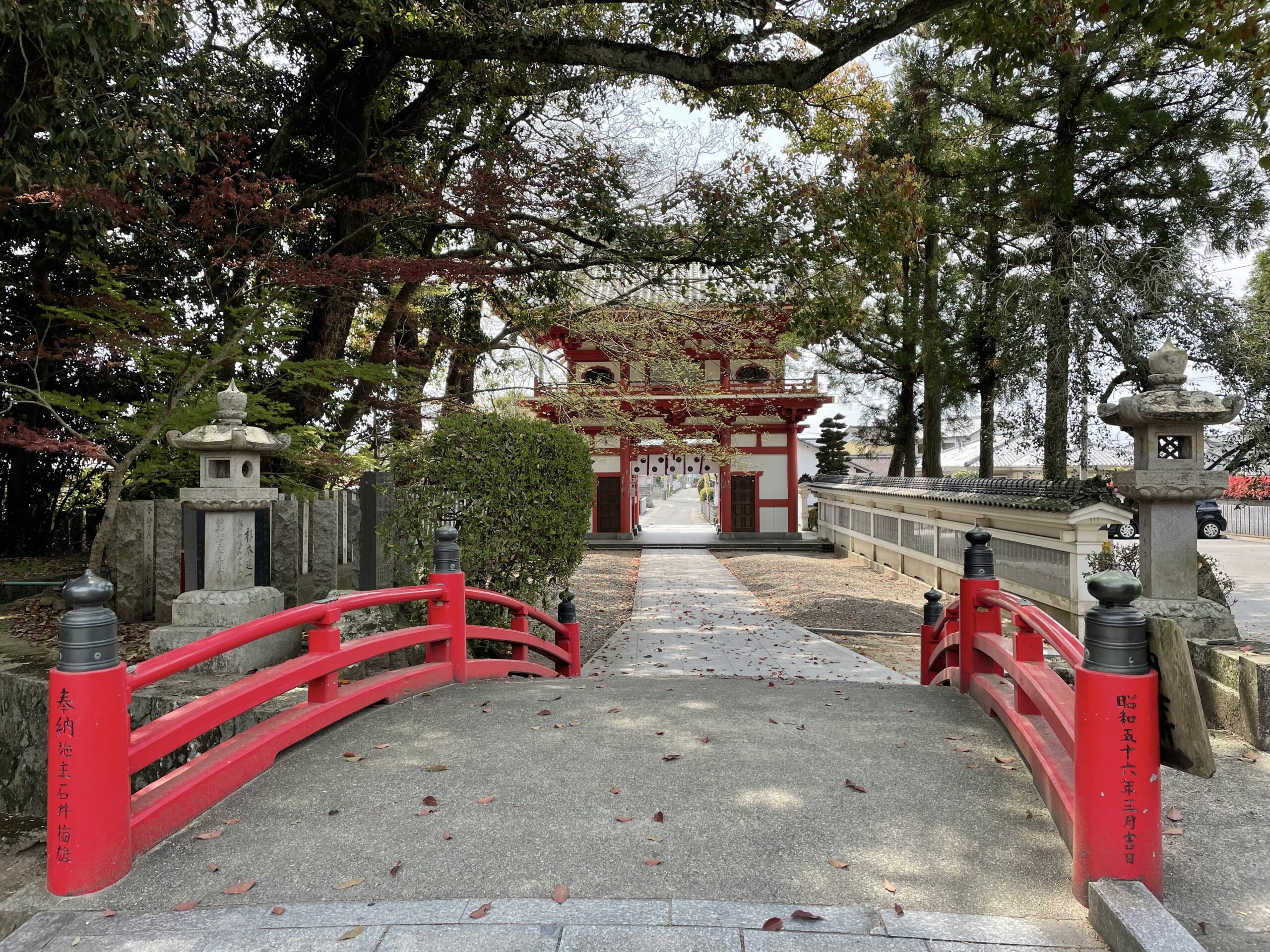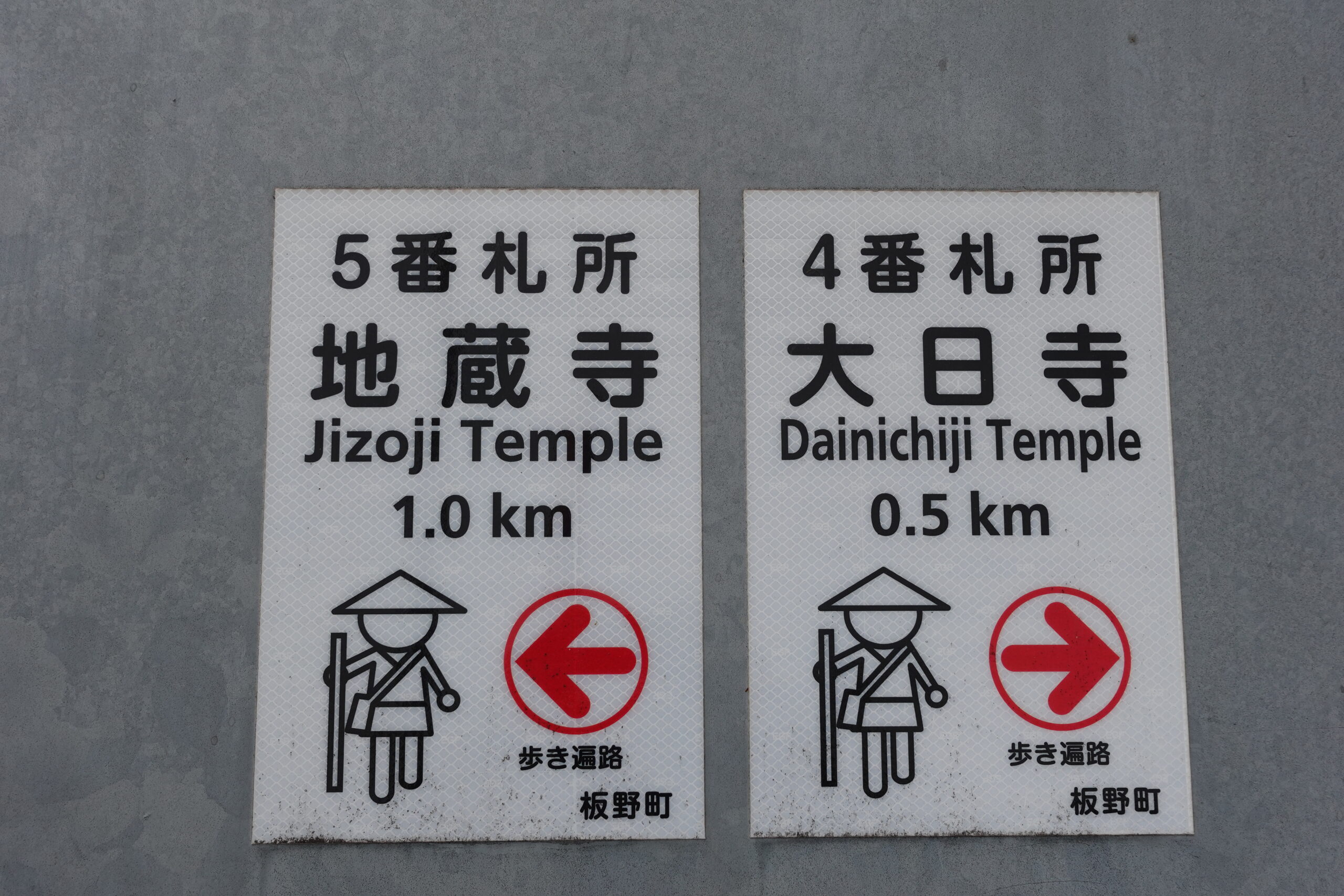 11:40、金泉寺を出発する。4番札所の大日寺までは今日歩く中では一番距離があり、ここから5kmほど。少し山手に登るようである(といっても標高は75m程度)。道中にもたくさんのお堂や神社があり、歴史を感じる道だった。徳島自動車道の高架をくぐると、板野町観光協会の設置した案内看板が出てくる。右折して4番大日寺への歩き遍路道に行くか、車道を直進して5番地蔵寺→4番大日寺の順で行くか。もちろん右折である。