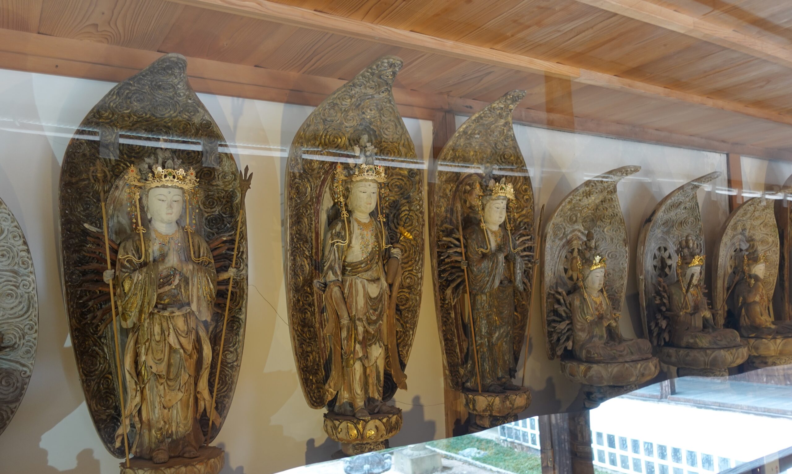 14:00ちょうどに大日寺に到着。大日寺は平成の末に大改修がされたとのことで、山門も真新しかった(2018年再建とのこと)。この山門は鐘楼門になっていて、写真では分かりづらいが、門の右手に下がっているロープを引くと鐘を撞くことができる珍しい形態のものだ。本堂と大師堂を結ぶ回廊には木造の三十三観音が安置されており、見事な細工が約250年前のものとは思えないくらい綺麗に残っていて見ごたえがあった。改修の際に導入されたのか、入口にも境内にも英語併記の案内が数多く設置されていて、ここにもインバウンドの波を感じた。