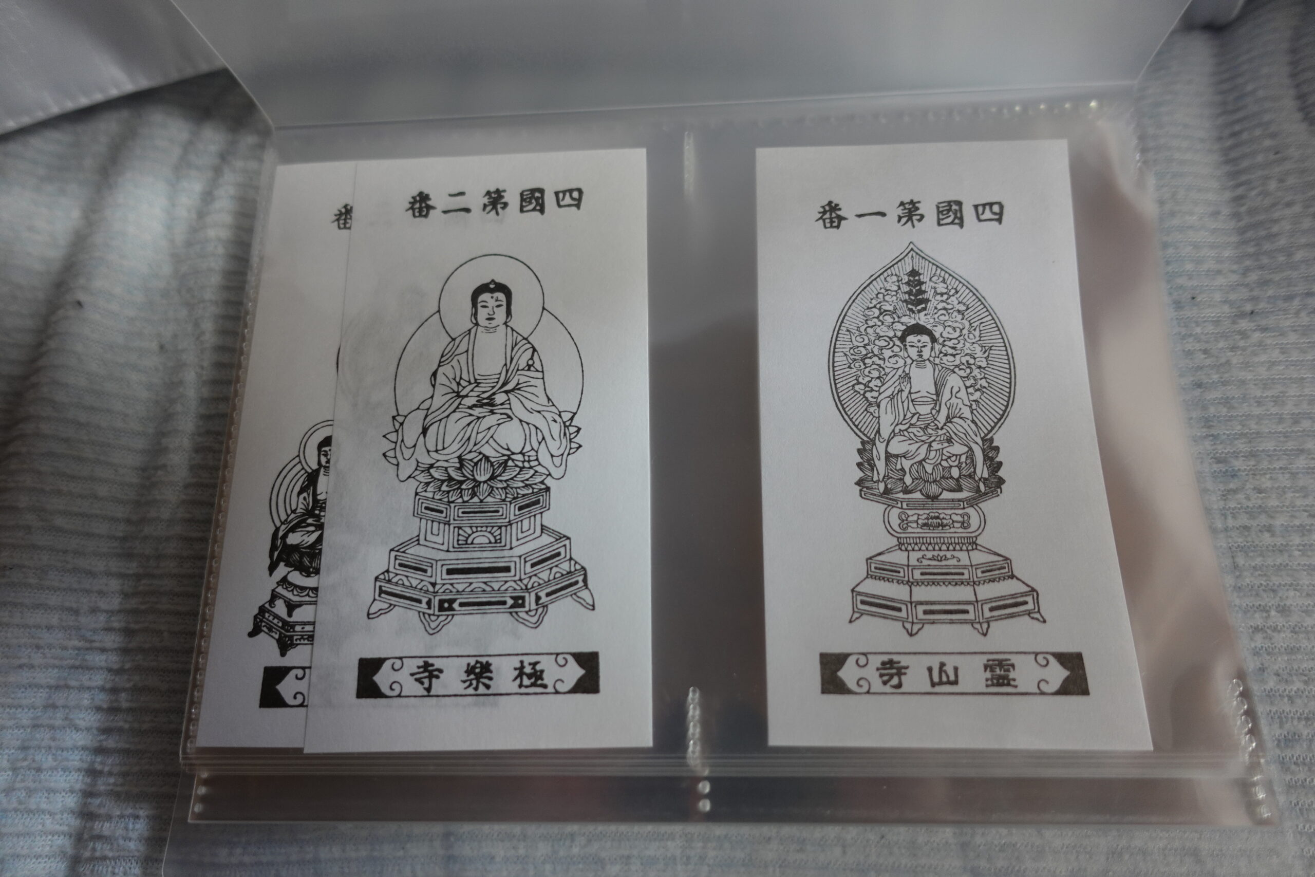 20時頃にはそれぞれの部屋に戻り、明日に備えて早めに寝ようということで、相部屋はほどなく消灯となった。カーテンは完全に仕切れたので、またもや個室電灯のもとで写真のデータをクラウドに上げながら荷物の整理をする。納経するといただける各札所のご本尊の「御影(おみえ)」を用意してきたDAISOのフォトアルバムに入れてみると、狙い通り完全にフィットした。思わずニンマリしてしまう。本物の御影帳は重量があるため、暫定的にどうやって保管しておくかでサイズを図りまくって辿り着いたのがこのフォトアルバムだったのだ。ご本尊ブロマイドの完成である。1ポケットに二体ずつ入れていく計算で、ご本尊たちも旅の間はドミトリーになってしまうが許してもらう。