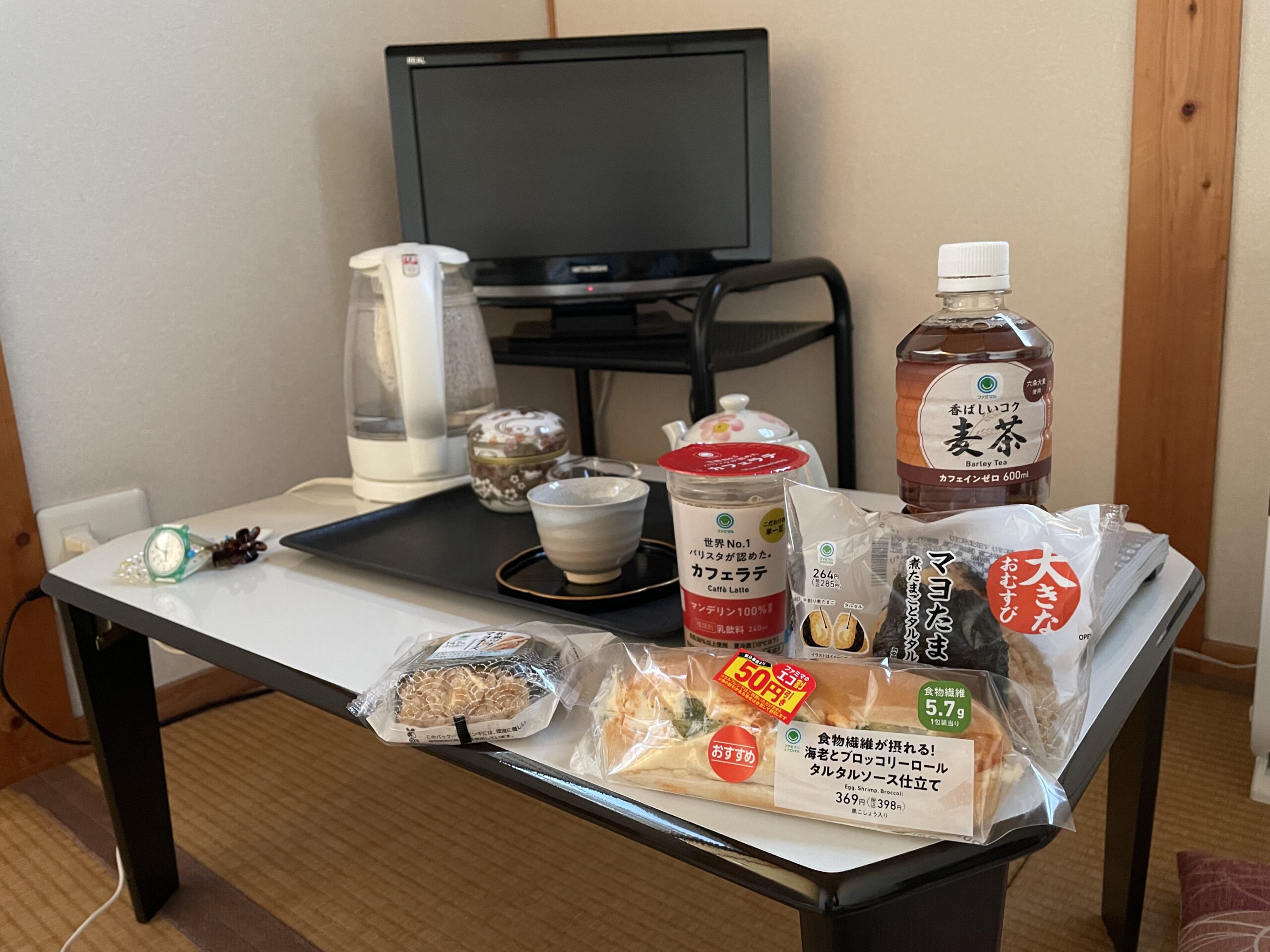 お宿から2kmほどのところにコンビニや銭湯がある。自転車を貸してもらえるとのことで、せっかくなのでお風呂に入りに行くことにした。食料はお宿で朝食用にパンとバナナを付けてもらえたので、荷物軽量化のために手持ちを食べ尽くすことにして、一路「鴨の湯」へ。階段とアスファルトで疲れきった膝を湯船で念入りにほぐす。明日は山登り…。帰りにはすでに暗くなっていて、行きに来た道を覚えているつもりだったが途中で迷ってしまった。Googleナビを起動するが、スマホのバッテリーが残り10%を切っており、電池がもってくれるよう祈りながらペダルを漕ぐ。帰りはお宿に向けてずっとなだらかな登りで、再び汗をかいてしまった(冷や汗もあったかも…)。