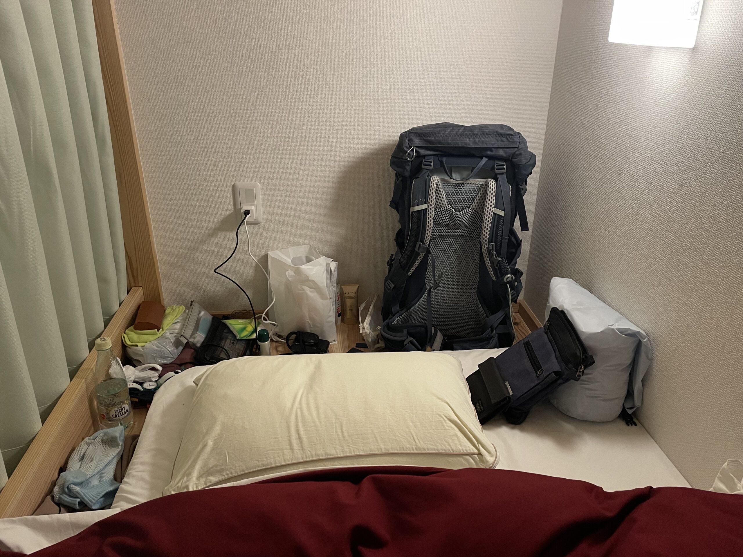 ブースのカーテンをしっかり閉めて電灯を点け、例によって写真をクラウドに上げながら荷物の整理をする。雨に備えて濡れたら困るものを防水バッグに包んでガードして、山谷袋(お参りセットと財布)も登っている間は使わないのでこの際ザックに突っ込むことにする。ちょっとパンパンになってしまい、どうやったら座りがよくなるのか試行錯誤、ブース内がカオスになり収拾がつくのか絶望したが、なんとか収まった。