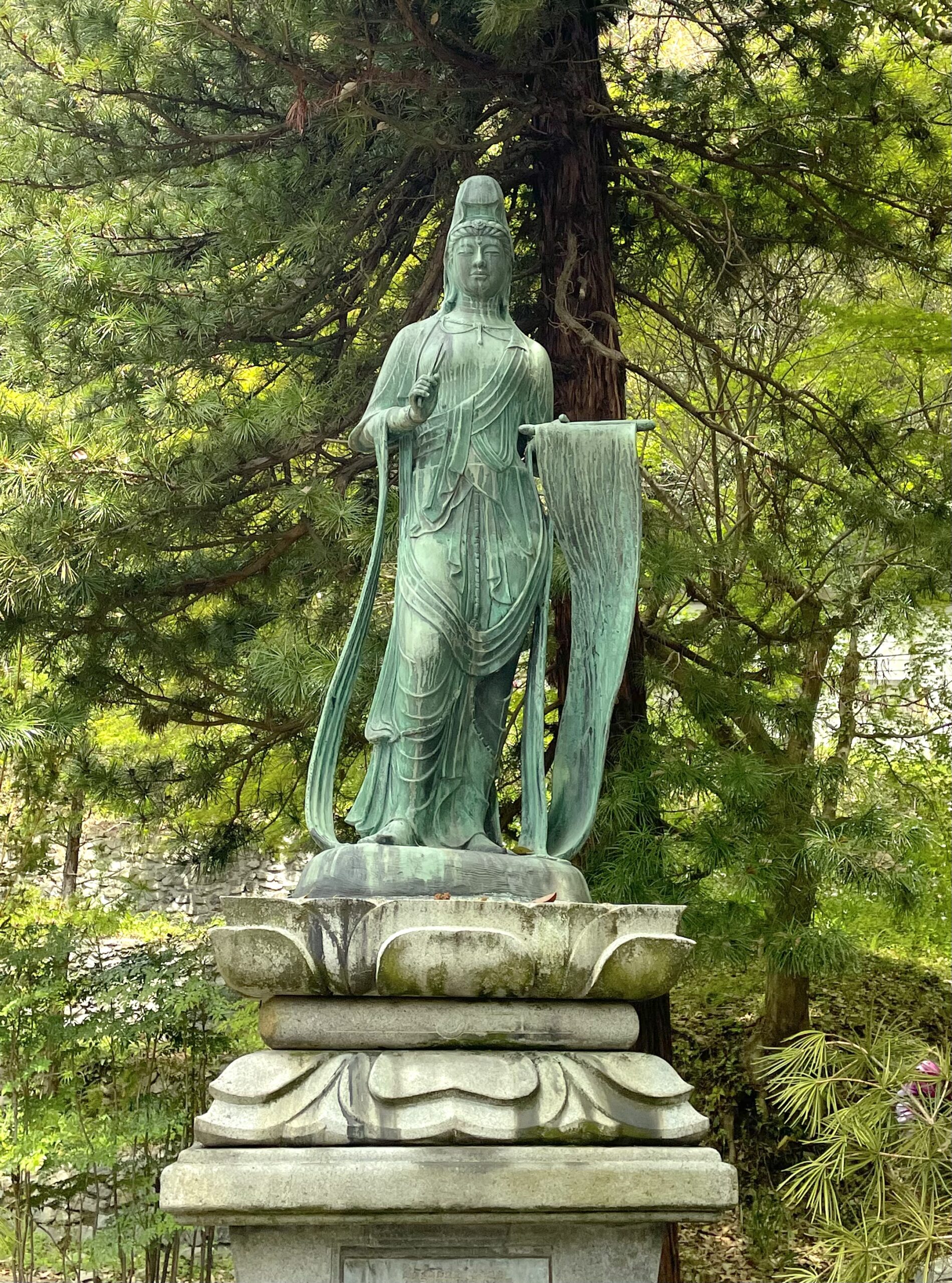 切幡寺は、機織りの娘さんがお大師さまに得度・灌頂を受けて即身成仏し、千手観音に姿を変えたという伝説があり、その観音さまが秘仏のご本尊となっている。本堂の横にも「はたきり観音」というきれいな観音さまの像があった(右手に鋏、左手に織った布を持っている)。本堂には大きな数珠が下がっていて、前の人の真似をして下に引いて回してみると、ガラガラガラっと思ったより大きな音がしてヒエッとなった。