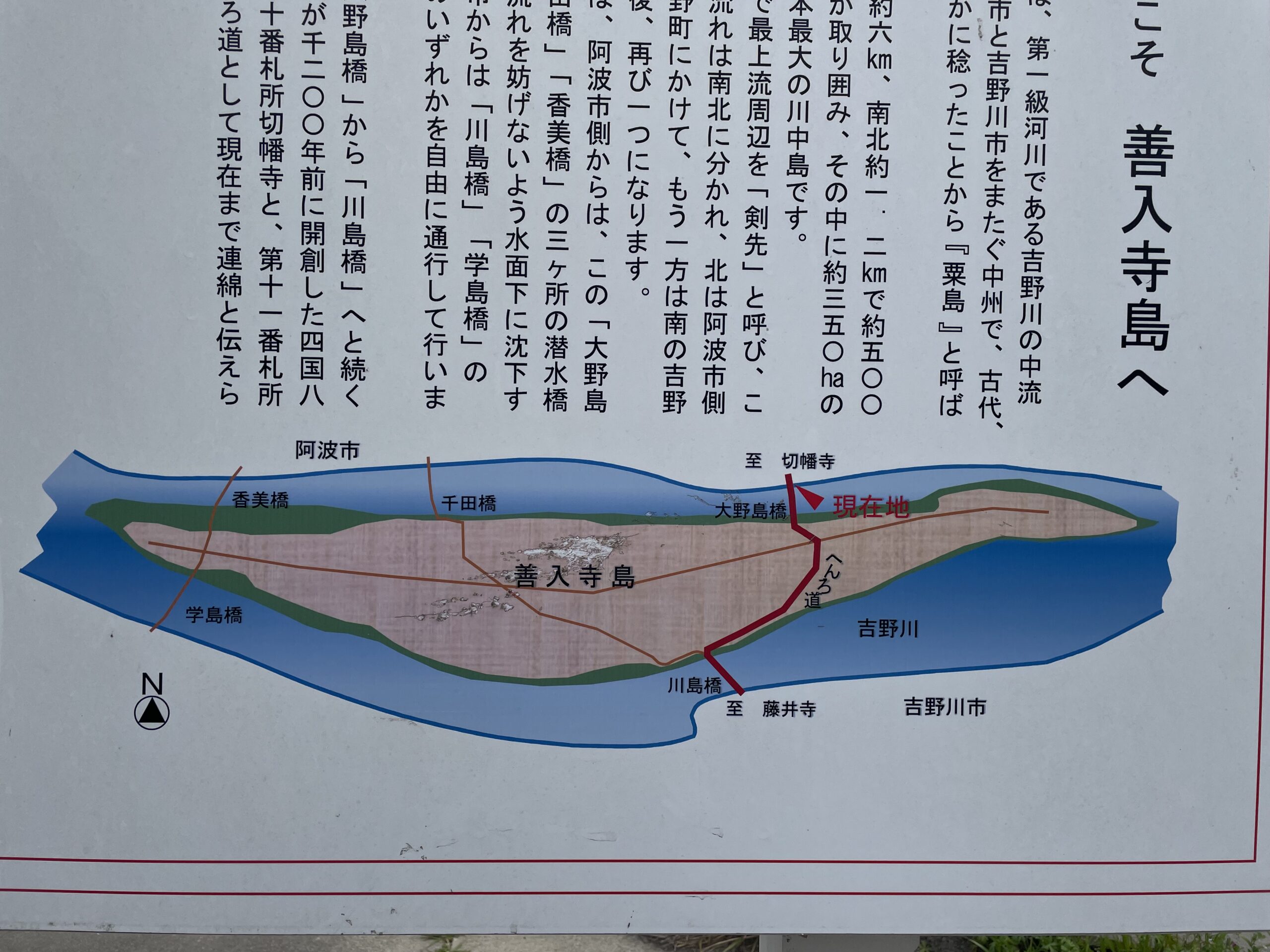八幡宮は、吉野川に向けての右折ポイントだ。ここから南に下っていくと吉野川の堤防に行き当たり、「善入寺島(ぜんにゅうじとう)」という大きな中洲を経由して向こう岸に渡る。島は阿波市と吉野川市の境界でもある。