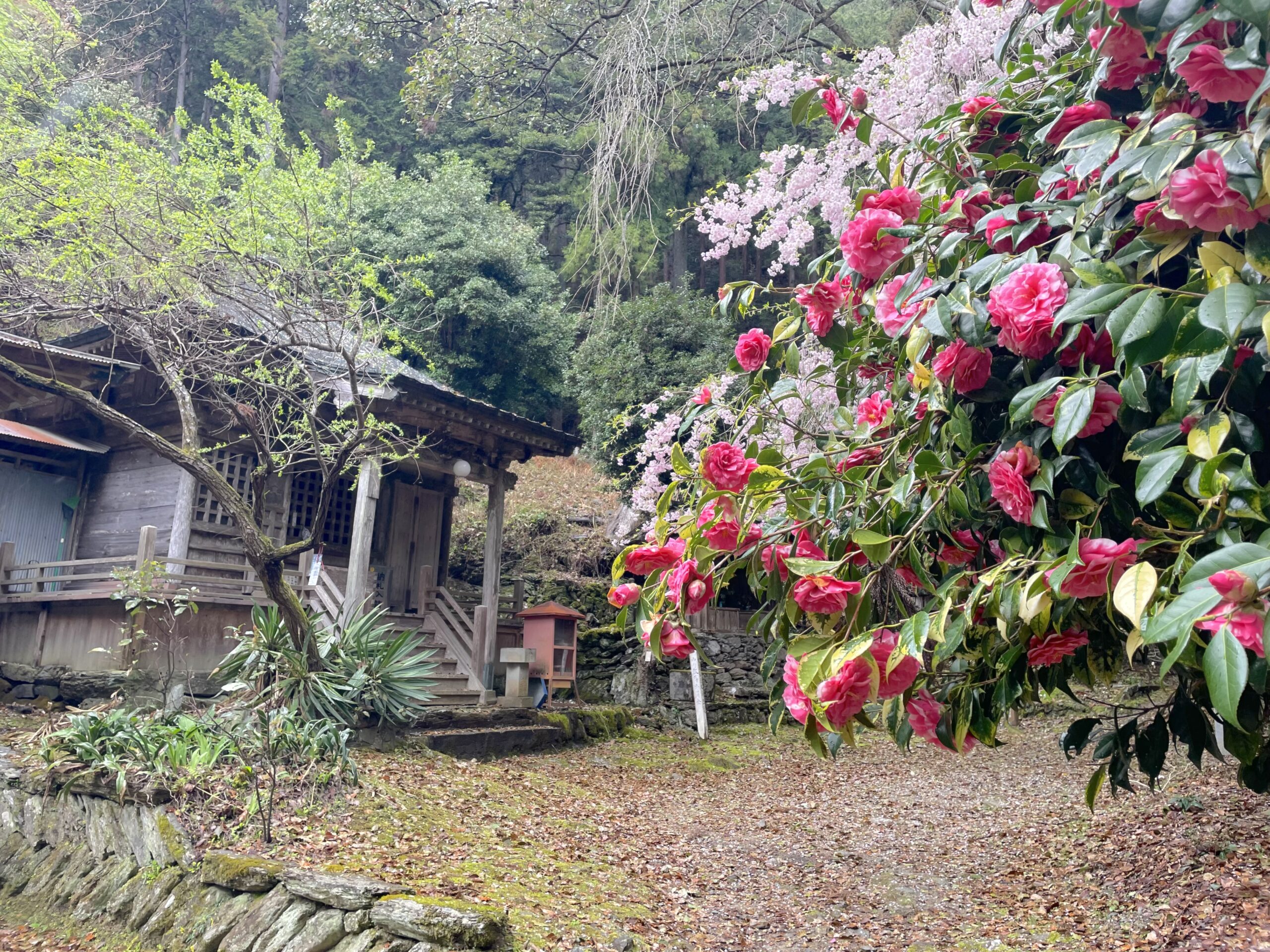 お参りを終えて、やっと境内をゆっくり見渡す余裕ができた。ここにも見事な椿が咲き誇っている。1本の株から濃いピンクに淡いピンク、白っぽい花も咲いていて、まるでブーケのよう。杉の大木に囲まれた重厚な雰囲気の境内で、こぼれるほどの花をつけたこの椿の可愛さが一層際立っていた。椿の花は、今日のハードな道のりを彩ってくれた「同行者」だ。雨に落とされてしまった姿でさえ凛としていて、華やかさと儚さの同居するその様子がなんとも言えず心に沁み入った。雨の椿を見たら、焼山寺を登った今日の一日のことを必ず思い出すことだろう。