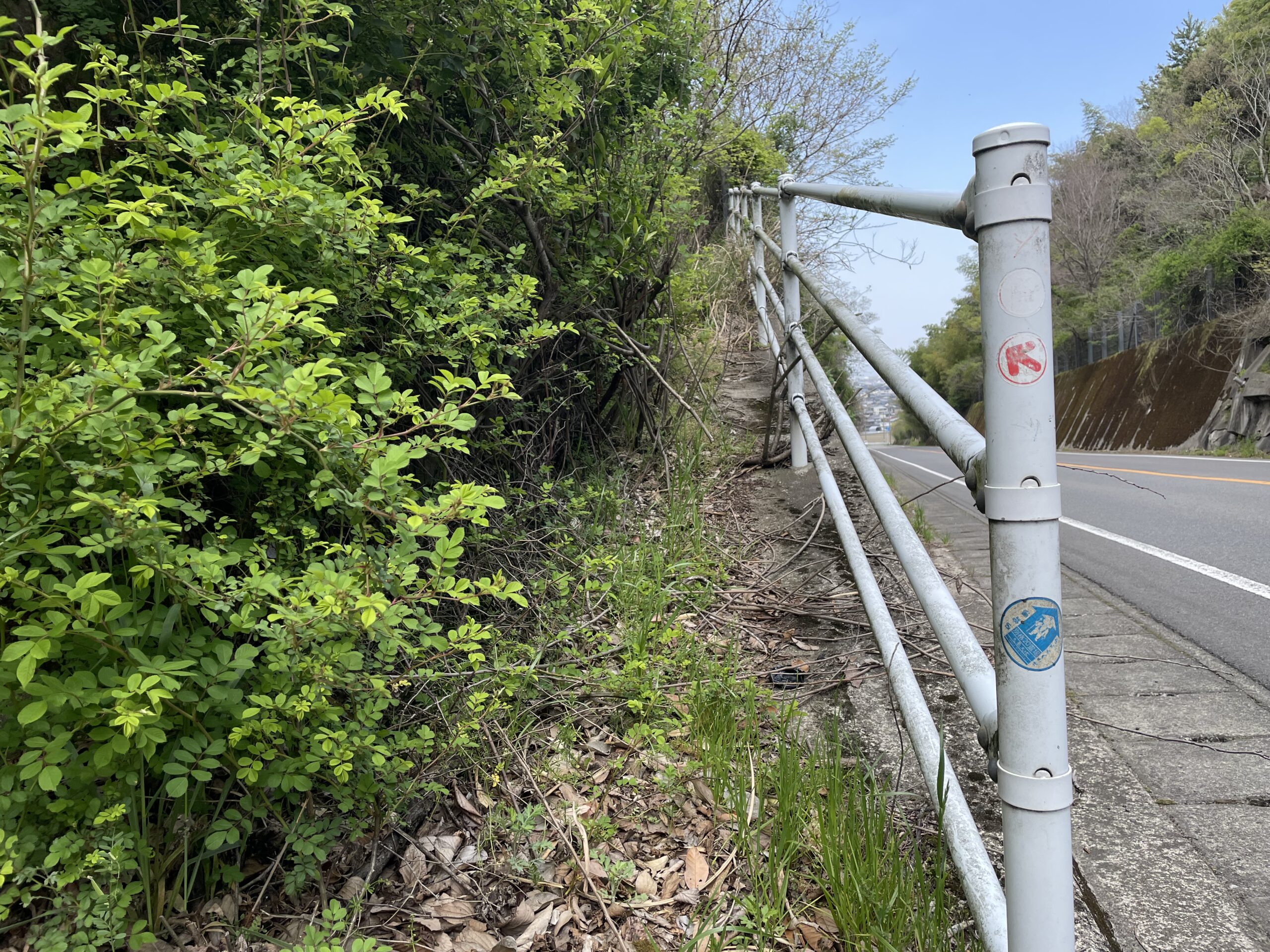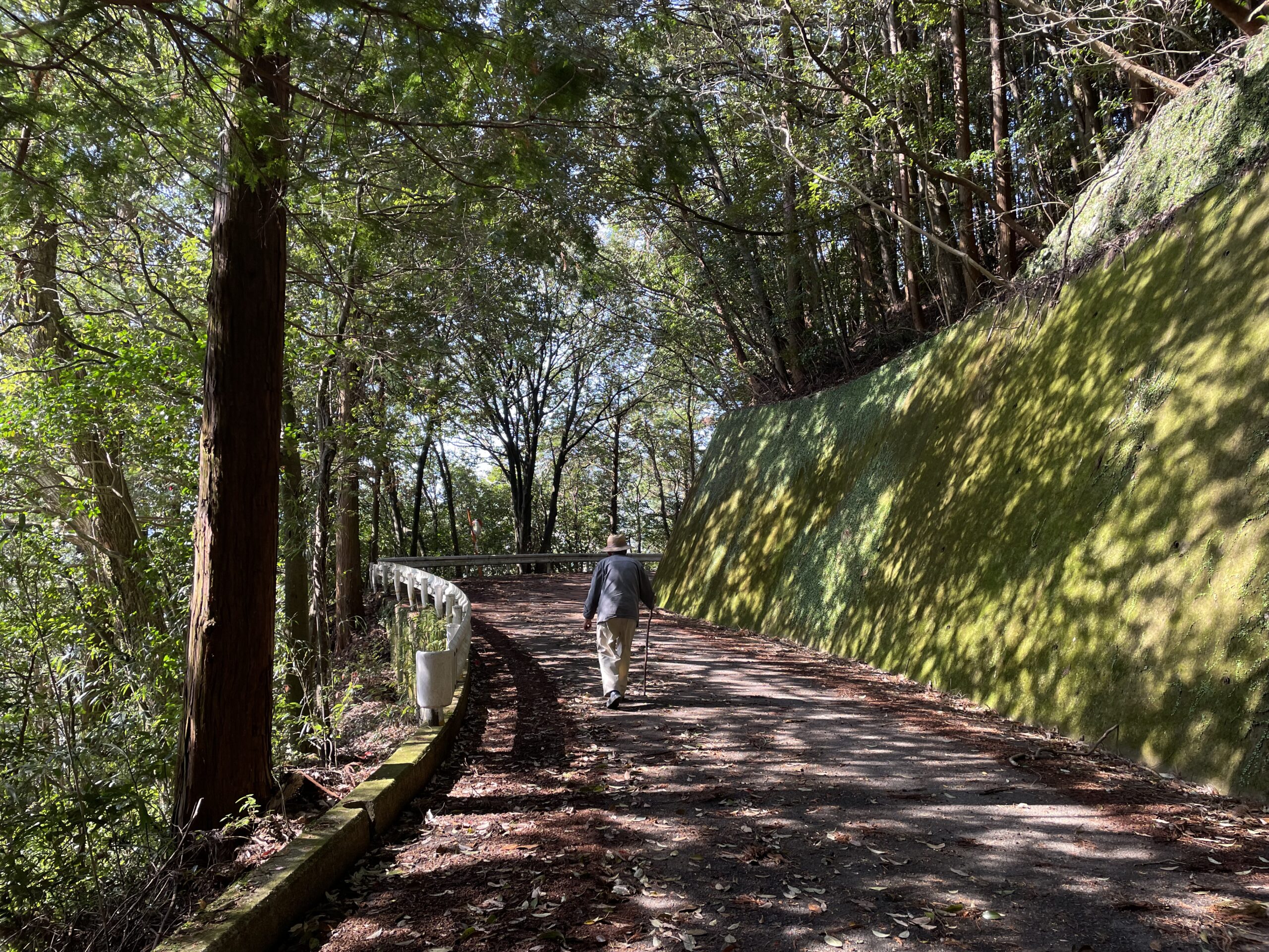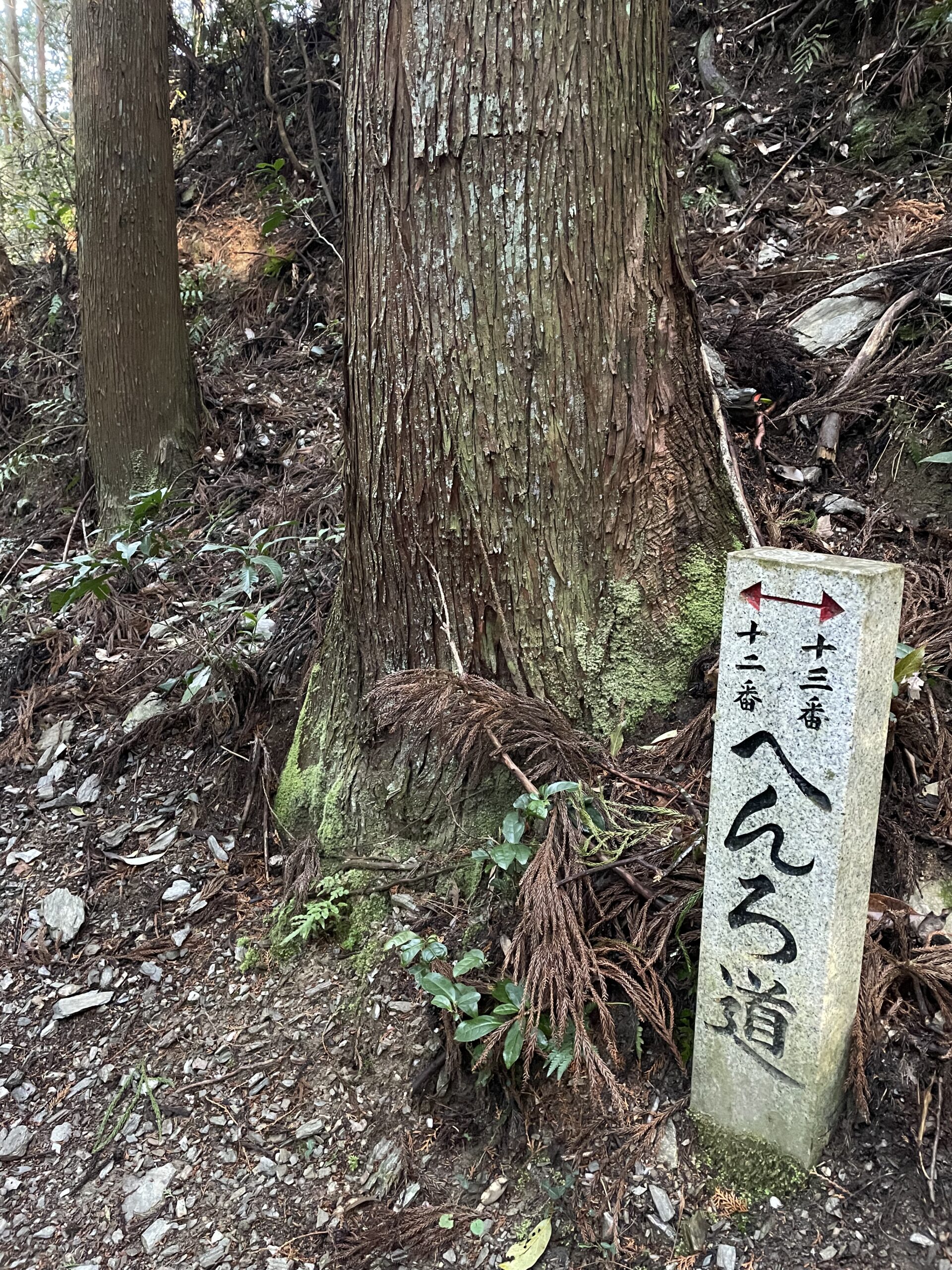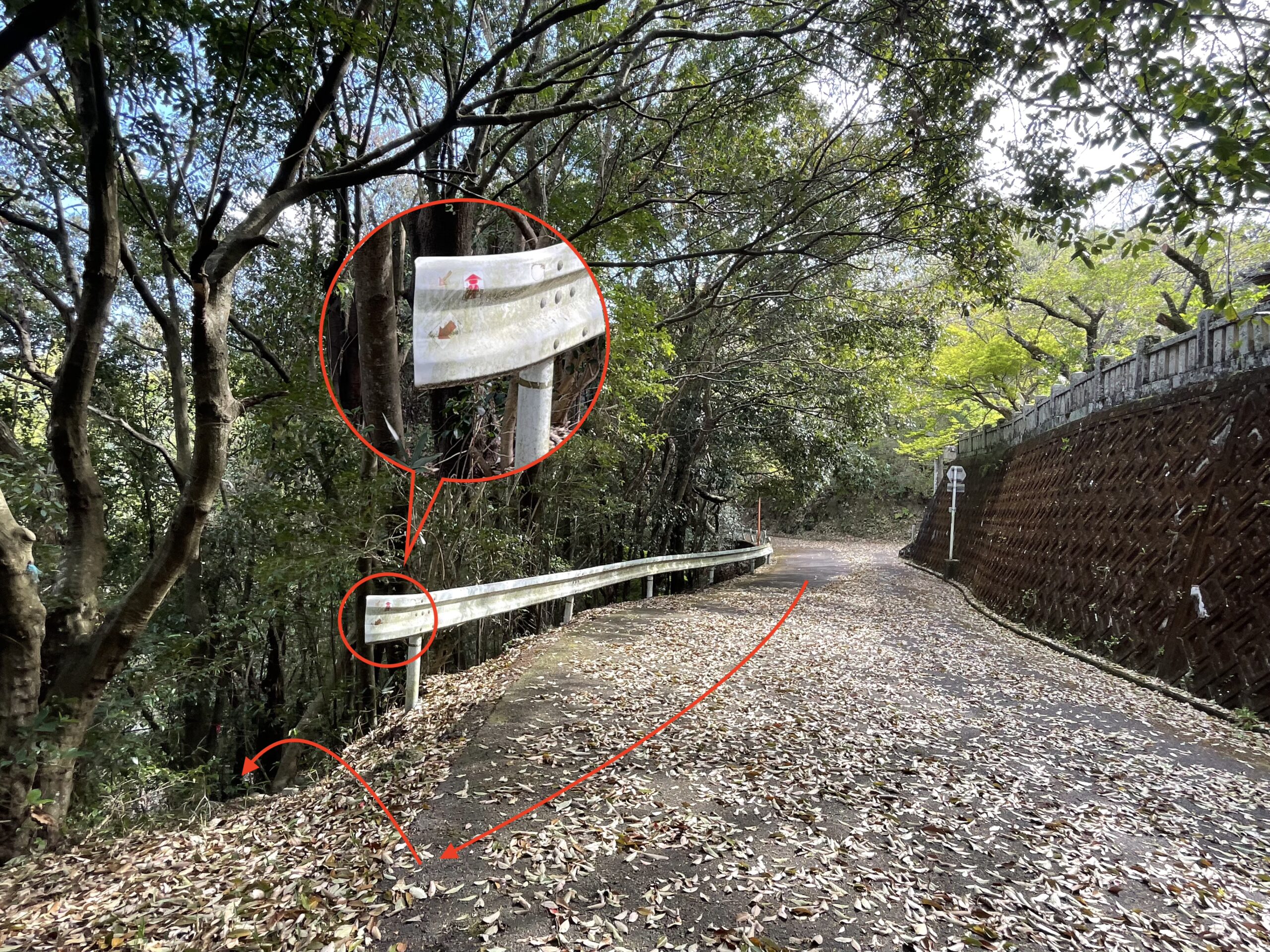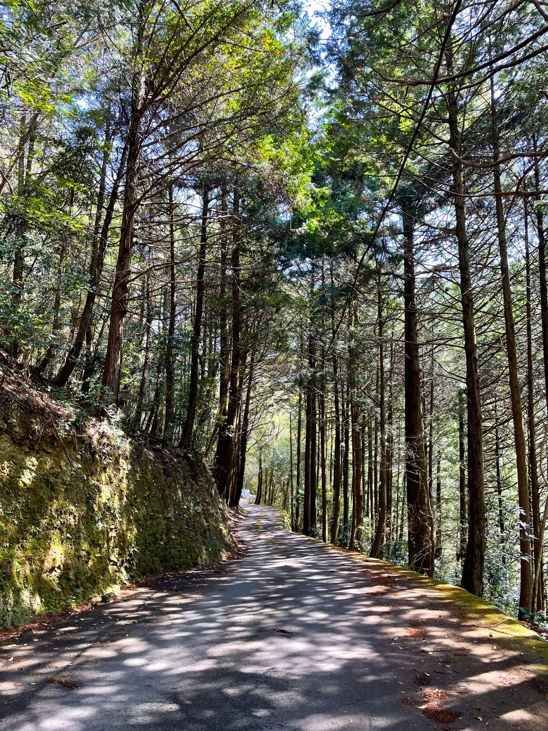 …のだが、ショートカットの遍路道はほとんど通る人がいないらしく、落ち葉がふっかふかに積もっていて、事前に知っていなければ道と分からないくらいだった。足を踏み入れてみると落ち葉の層が厚すぎて地面に届く感触がなく、踏ん張ろうとすると却って葉っぱ同士がスルスル滑って尻もちをつきそうだ。距離は20m足らずで下の道路は見えている。…えーいままよ、と地面を諦め、表層を泳ぐように一気に下りきる。「ふおおおおぉ」と変な声を出しつつ、ウォータースライダー状態で下の道路に着地した。