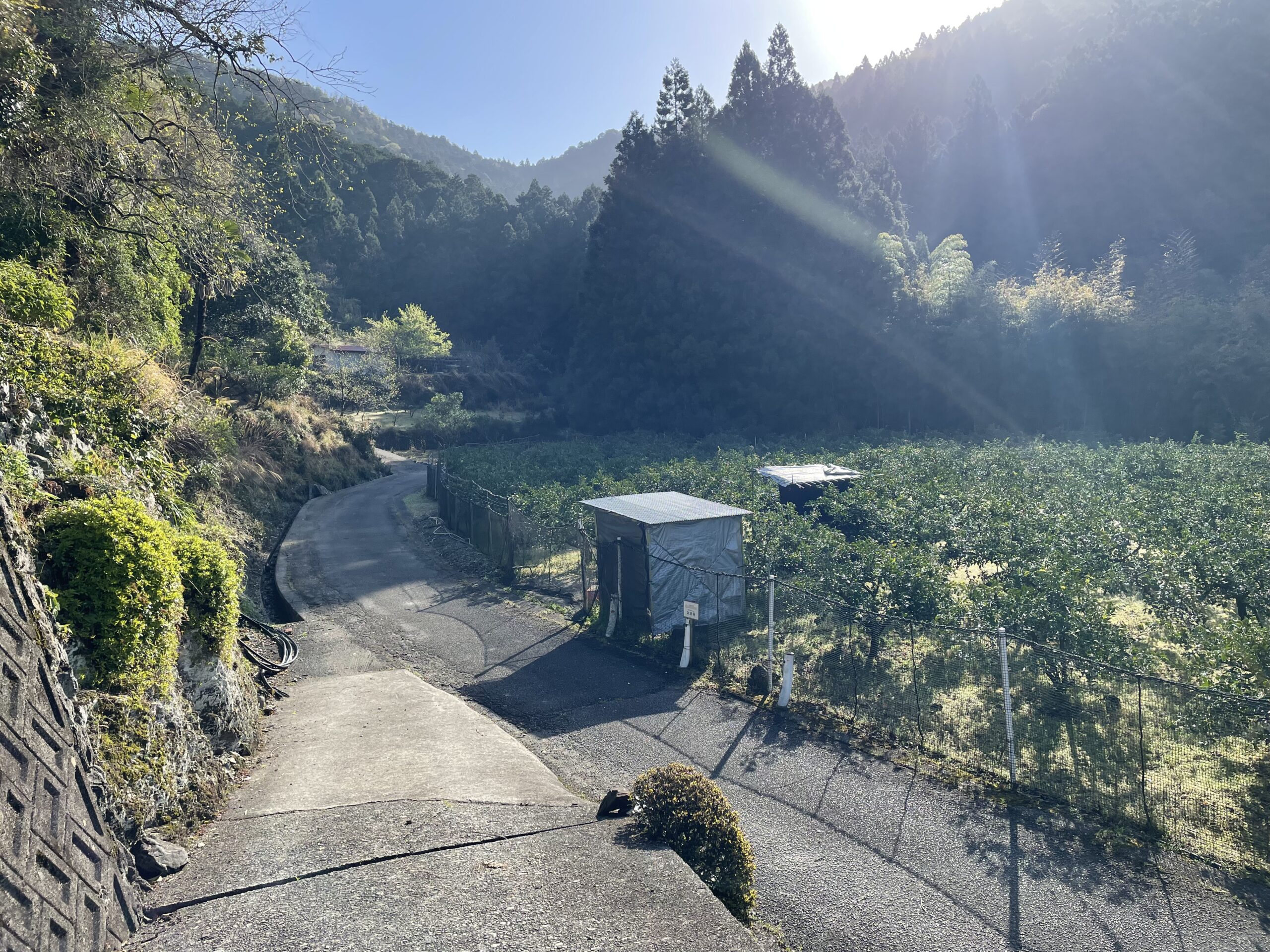 15分ほどで視界が開け、民家の裏手に出た。歩き遍路あるある、「山道を下りてきたら人の家の裏山(そして庭先を通る)」である。公道なのか私道なのか判別しがたい民家脇の道を下っていくと車道と合流、きれいに手入れされた果樹園を抜けて更に山の方へと向かっていく。