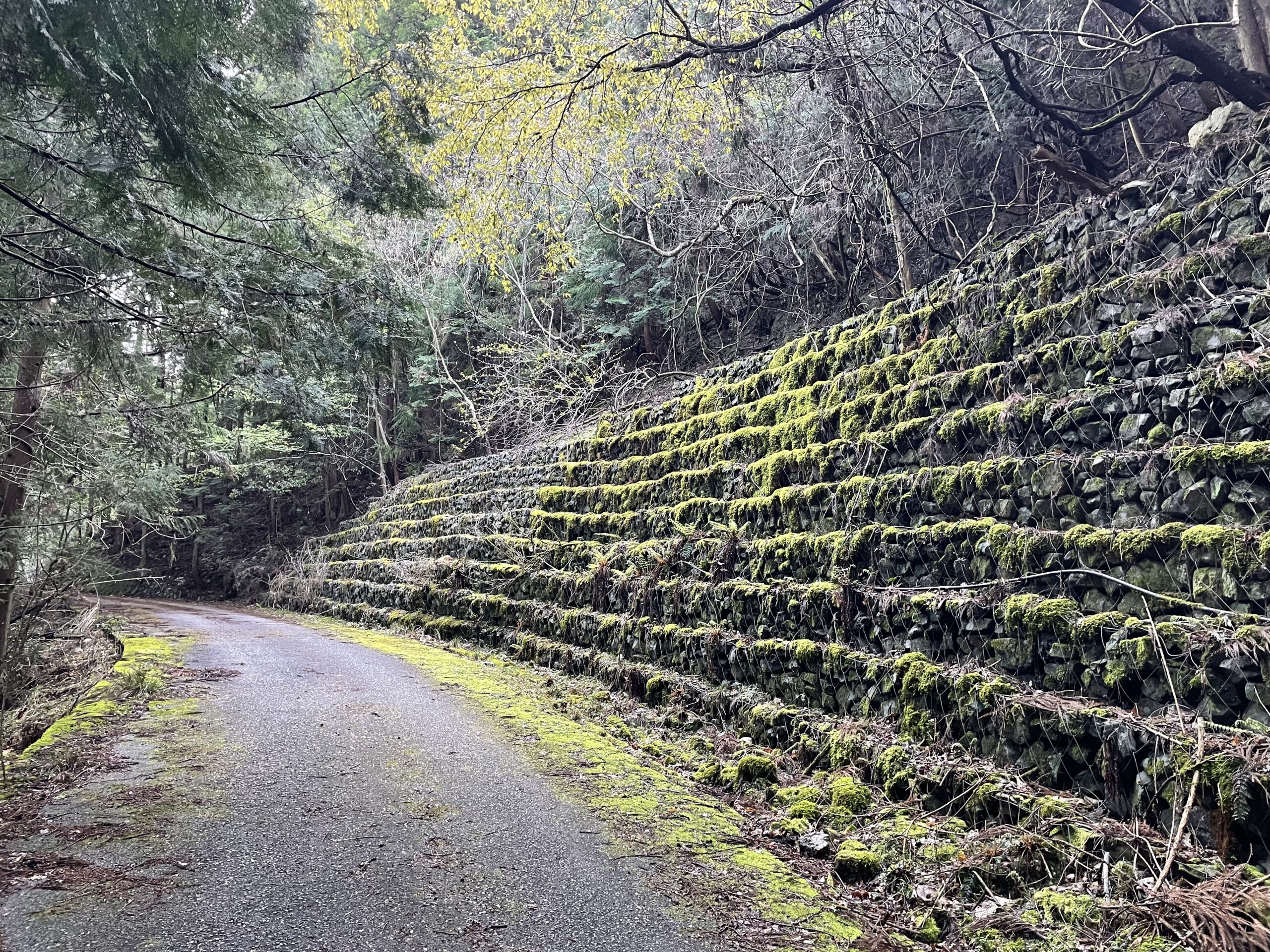 果樹園を過ぎてからしばらくは1.5車線のような車道が続く。この道はもうひとつ奥の民家で行き止まりになっているようで、ほとんど通る人がいないためか、路肩や擁壁は苔に侵食されてきていた。昔からの石積みはおろか、近代になってから造られたのであろう構造物ですら、圧倒的な緑に飲み込まれて自然に還っていきそうである。