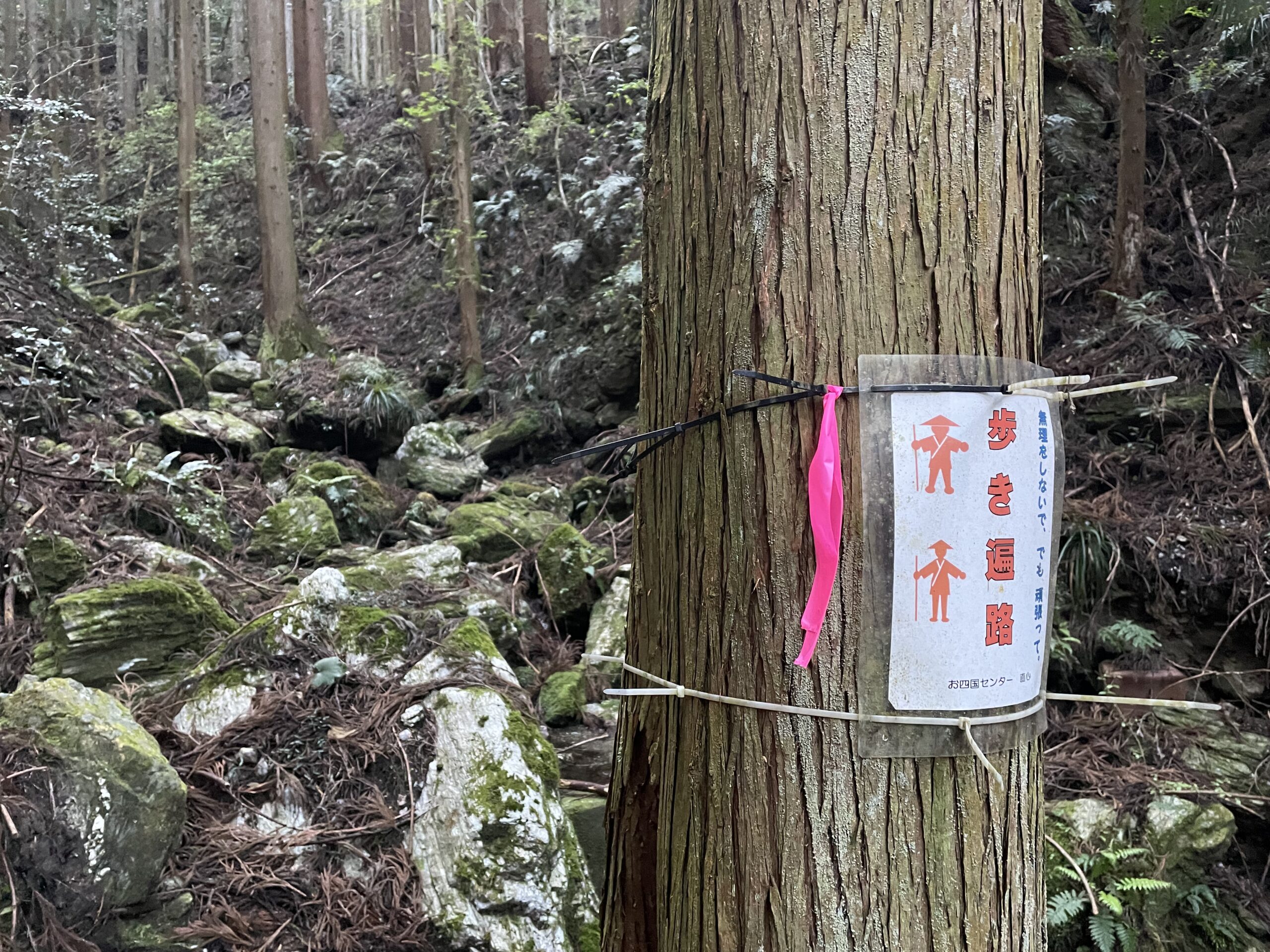 (※ピンクテープは沢を渡る時や道が崩れたりして迂回路ができている時など、ぱっと見で道が分かりにくい場合に進行方向を誤らないように結ばれている事が多く、何度も助けられた。しかし一般の登山道や整備用の林道でも使われるものなので、騙されたことも多い。ピンクテープや黄色テープだけをいつまでも追っていると遍路道を外れる恐れがあるため、基本的にはへんろ札を探したほうが確実)