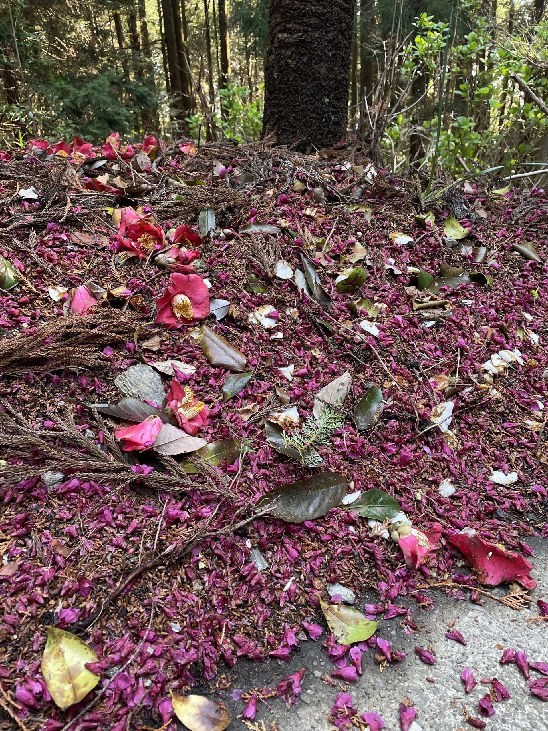 峠道があったとはいえ歩き出してまだ1時間だったので、もし椿の演出がなかったらここは写真を2、3枚撮ってスルーだっただろう。昨日と今日で椿の花が断然好きになった。それに、桜にしろ椿にしろ、花盛りよりも散った姿のほうがなんだかこのお遍路という内省の旅に似つかわしいように思われる。昔読んだ小説か随筆に「気分に合っている」という表現があったのだが、まさにそれだ。昨日の焼山寺への道も、スカっと快晴であるよりも気分に合っていたように思う(と言いつつ、晴れなら晴れでそれを楽しんだことだろう)。
