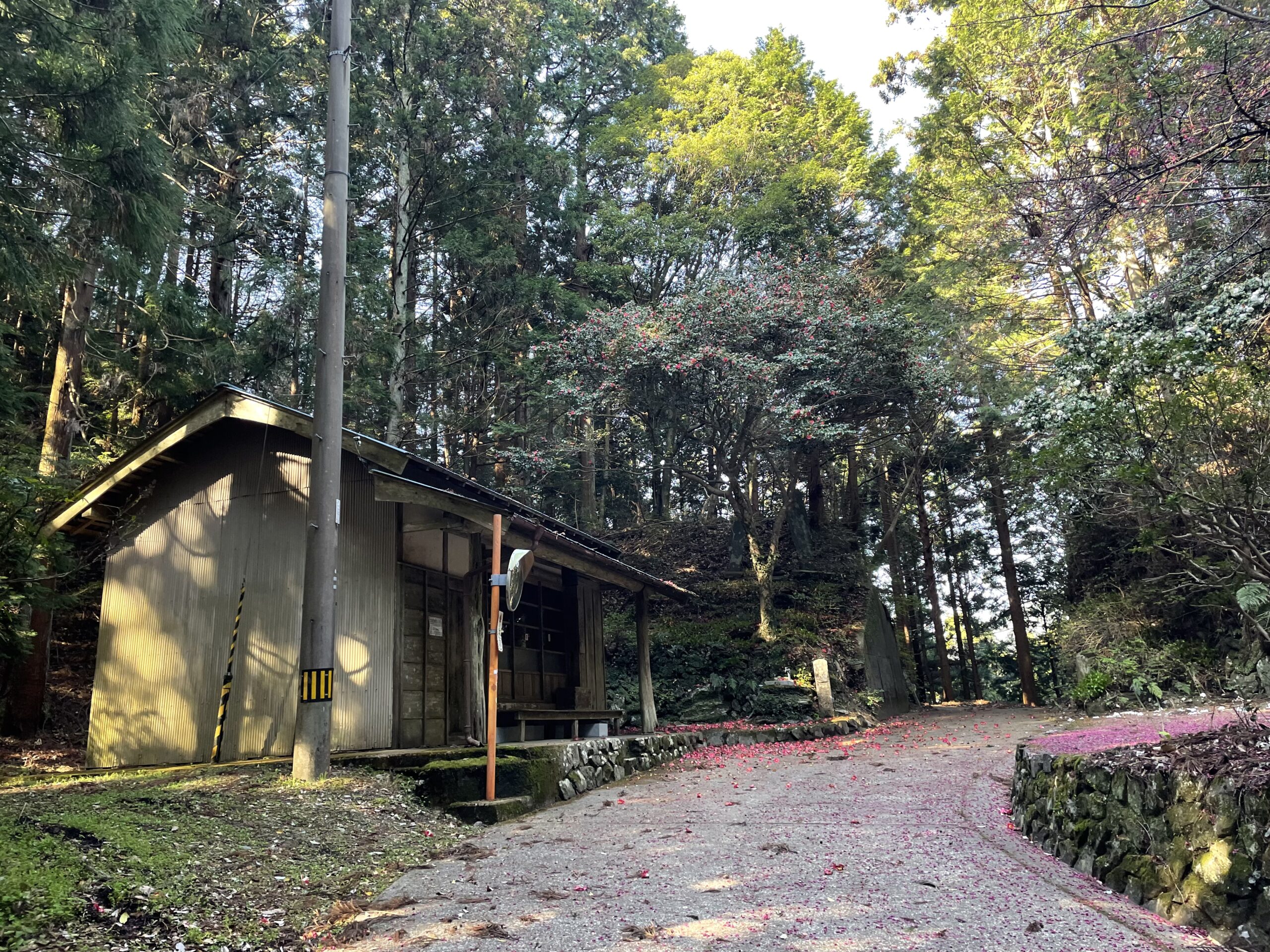 切り通しの先の道は明るく日が差して、その陽だまりにかわいいピンクの花がたくさん落ちているのが見えた。椿だ!またきれいな光景が見られるのではと期待しながら岩壁の間を通っていくと、一面の落ち椿に囲まれて小さな庵「玉ケ峠庵」があった。少し開けて広場になった対面にはお地蔵さまがたくさんいて、そちらは白い椿に彩られている。昨日の雨を含んだまま静かに佇むその様子は柳水庵にも似ていて、しばらく留まりたい気持ちになり、ここで小休憩をとることにした。