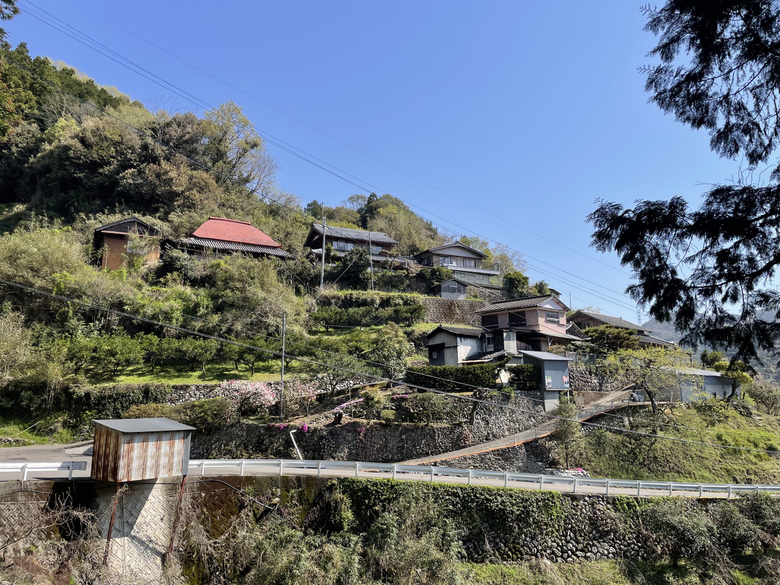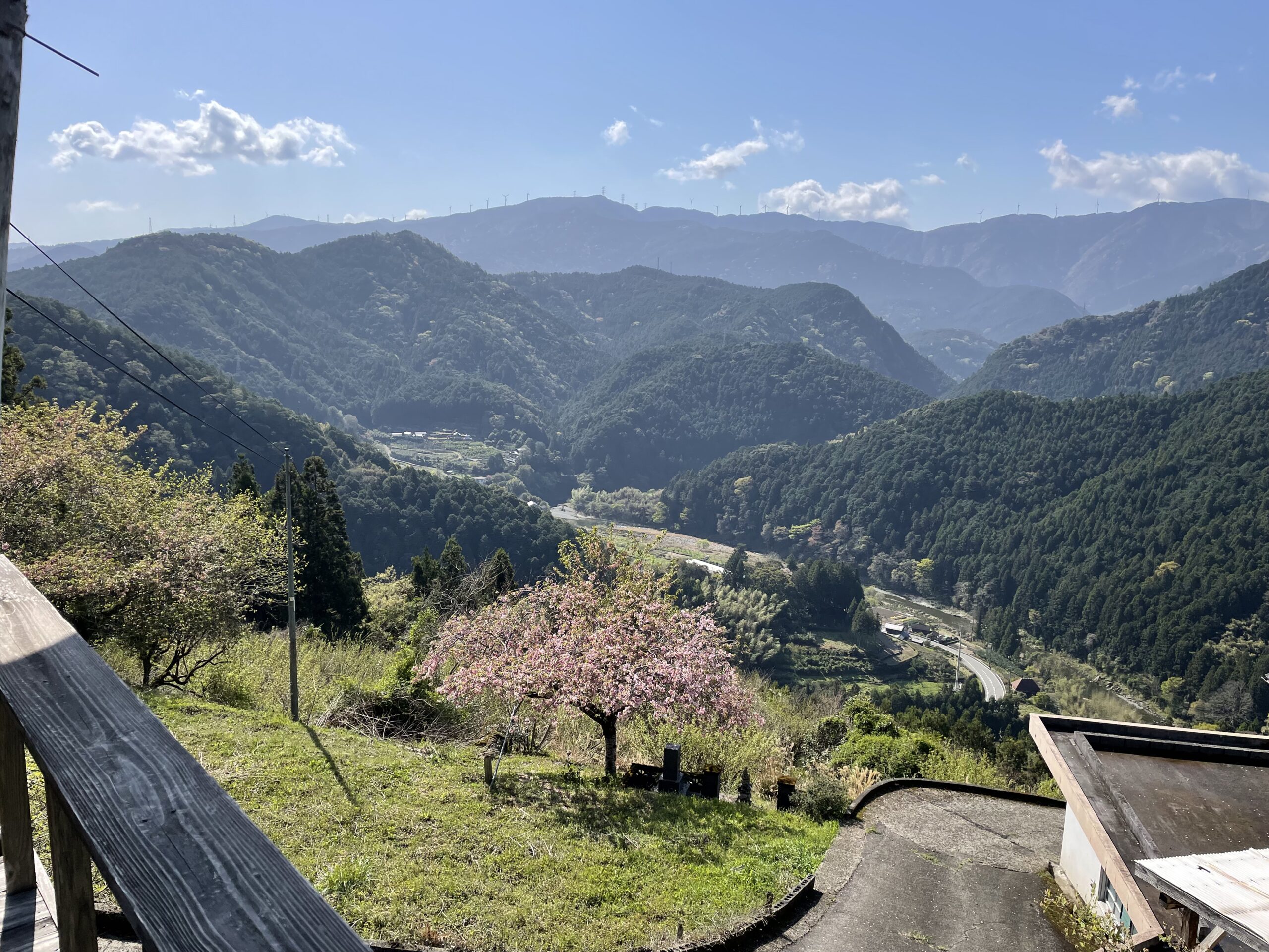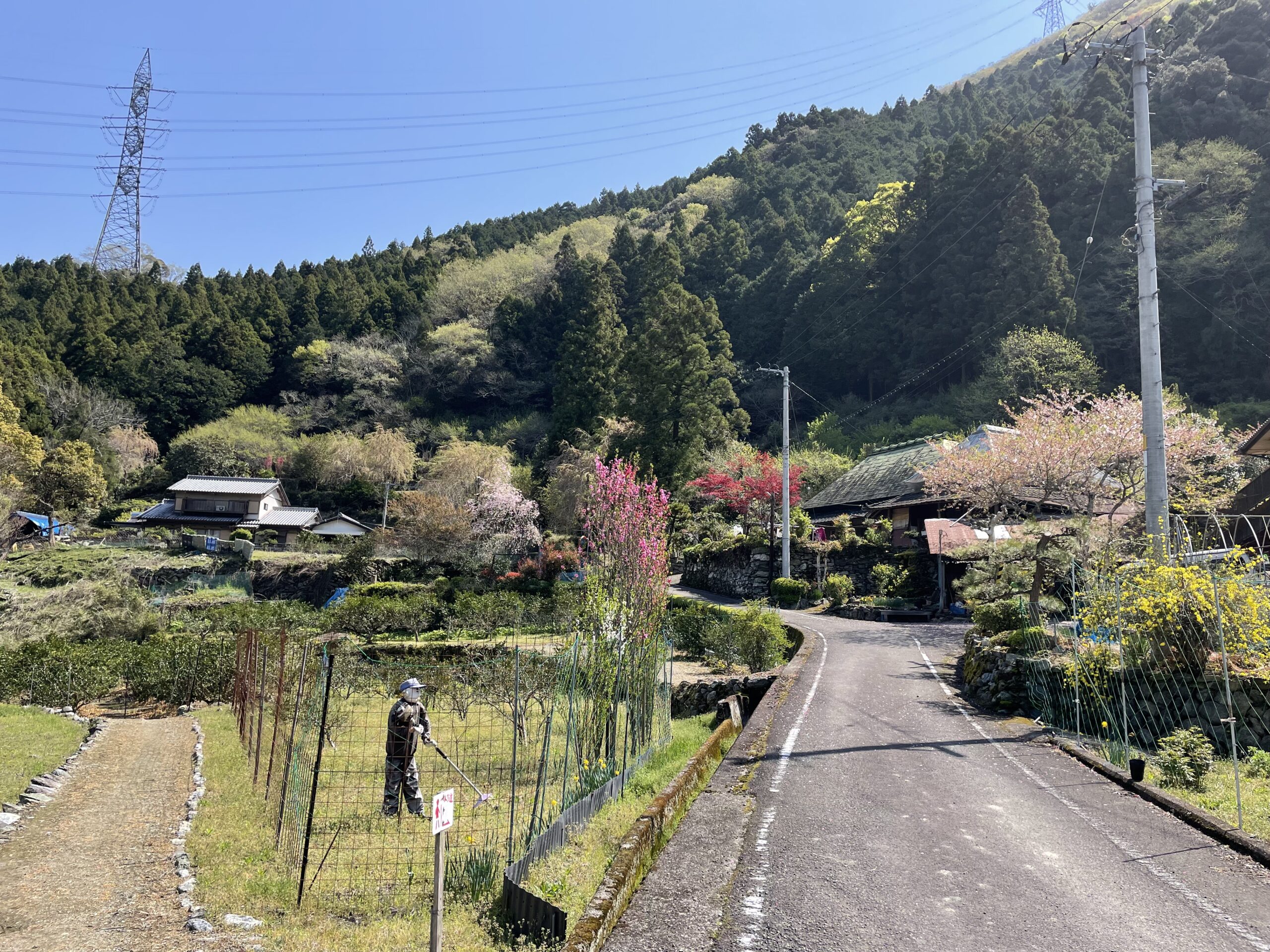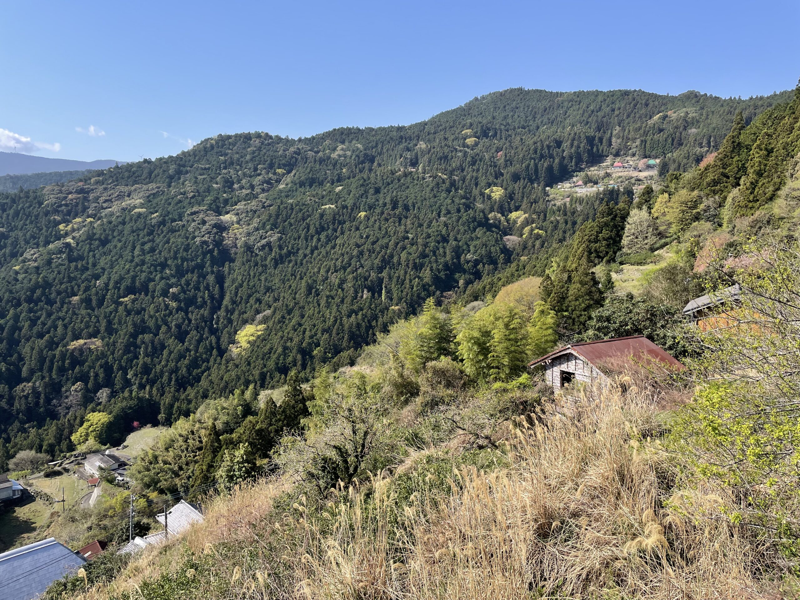 その後も杉林の間にぽつぽつと現れる集落に沿いながら、道はくねくねと下っていく。集落に出て視界が開けるたびに目に飛び込んで来るのは、遥か遠くまで連なる山々と、その斜面や谷間に点在する里山の風景だ。抜けるような青空と爽やかに吹き抜ける少し冷たい春の風も相まって、心の中までスカーンと洗われるようで本当に気持ちがいい。すだち庵のオーナーさんがおすすめしてくれた理由がよく分かった。ここを「天空の遍路道」と呼ぶ人もいるというが、それも頷ける。