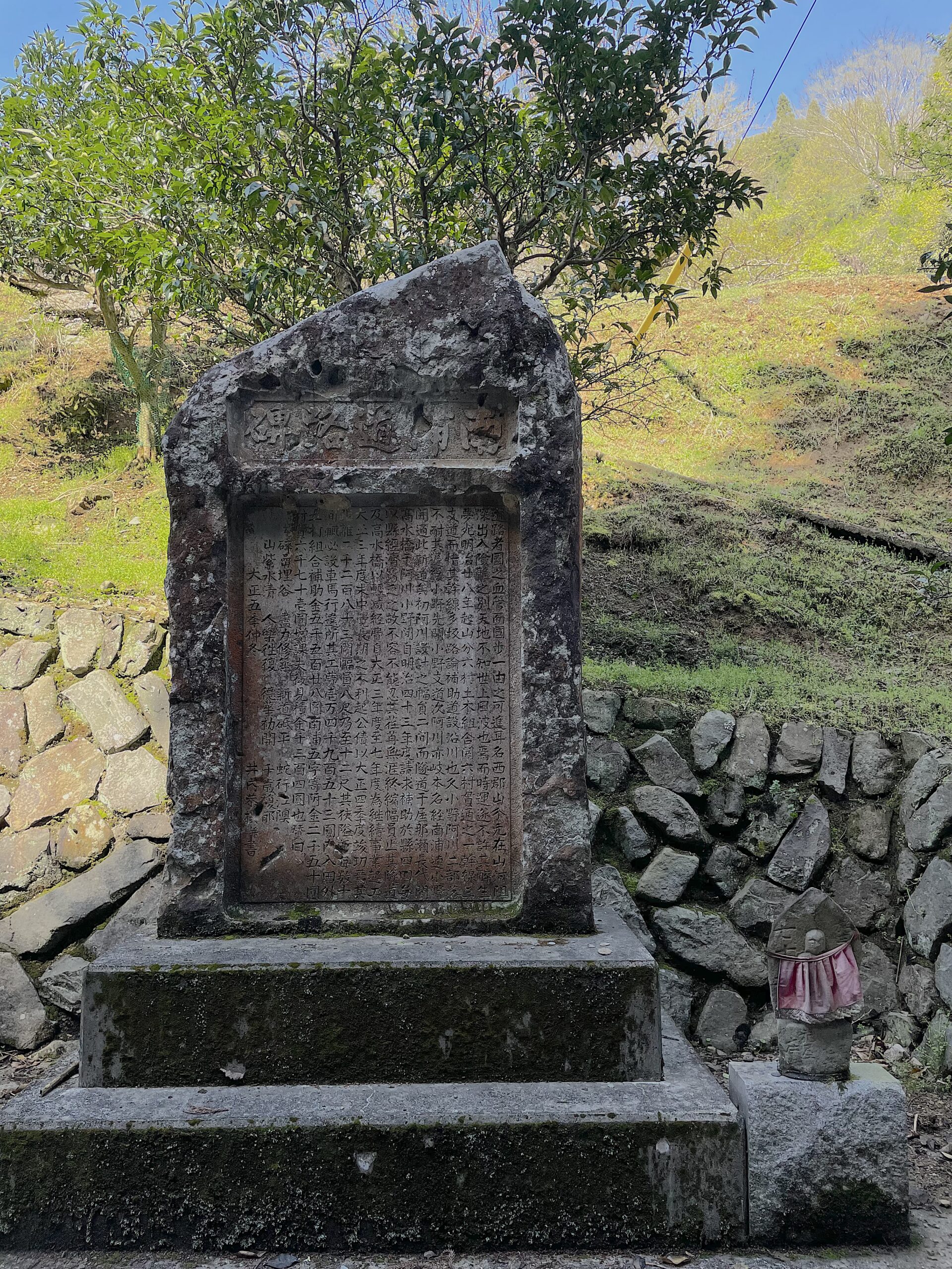お地蔵さまとともに立派な道路記念碑が建っていた。明治の終わりから大正にかけて、このあたりの村々が協力して道を拓き、拡張してきた経緯がびっしりと刻まれている。書き出しは「道路は国の血管である…」から始まっており、悲願のさまが伺えた。そのすぐ先には「鏡石」と刻まれた石碑があり、そこから少し森の中に下ると「鏡石大師」のお堂があるらしいのだが、下を覗いてみるとなかなか急そうな山道だったため(またこの道路まで上がってこなければならない)、道端から手を合わせるだけにして先へ進んだ。