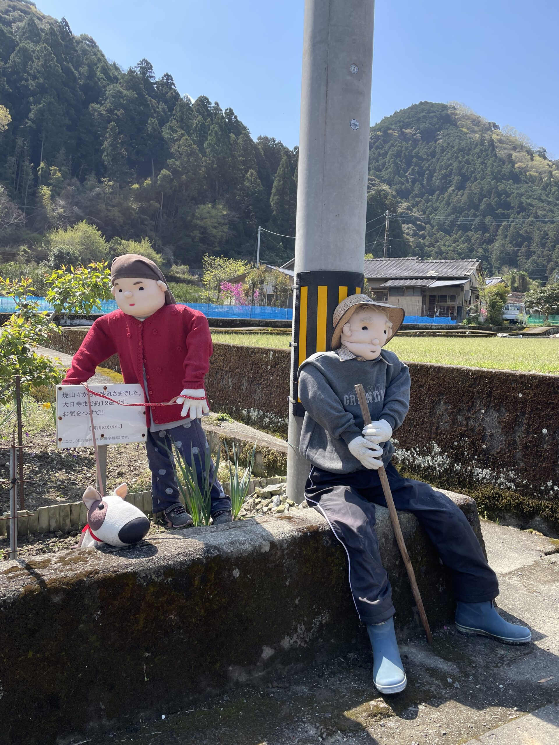 その後も民家の軒先などにちょいちょいかかしが現れ、その度に驚いたり感心したり。お遍路さん姿のかかしもいた。