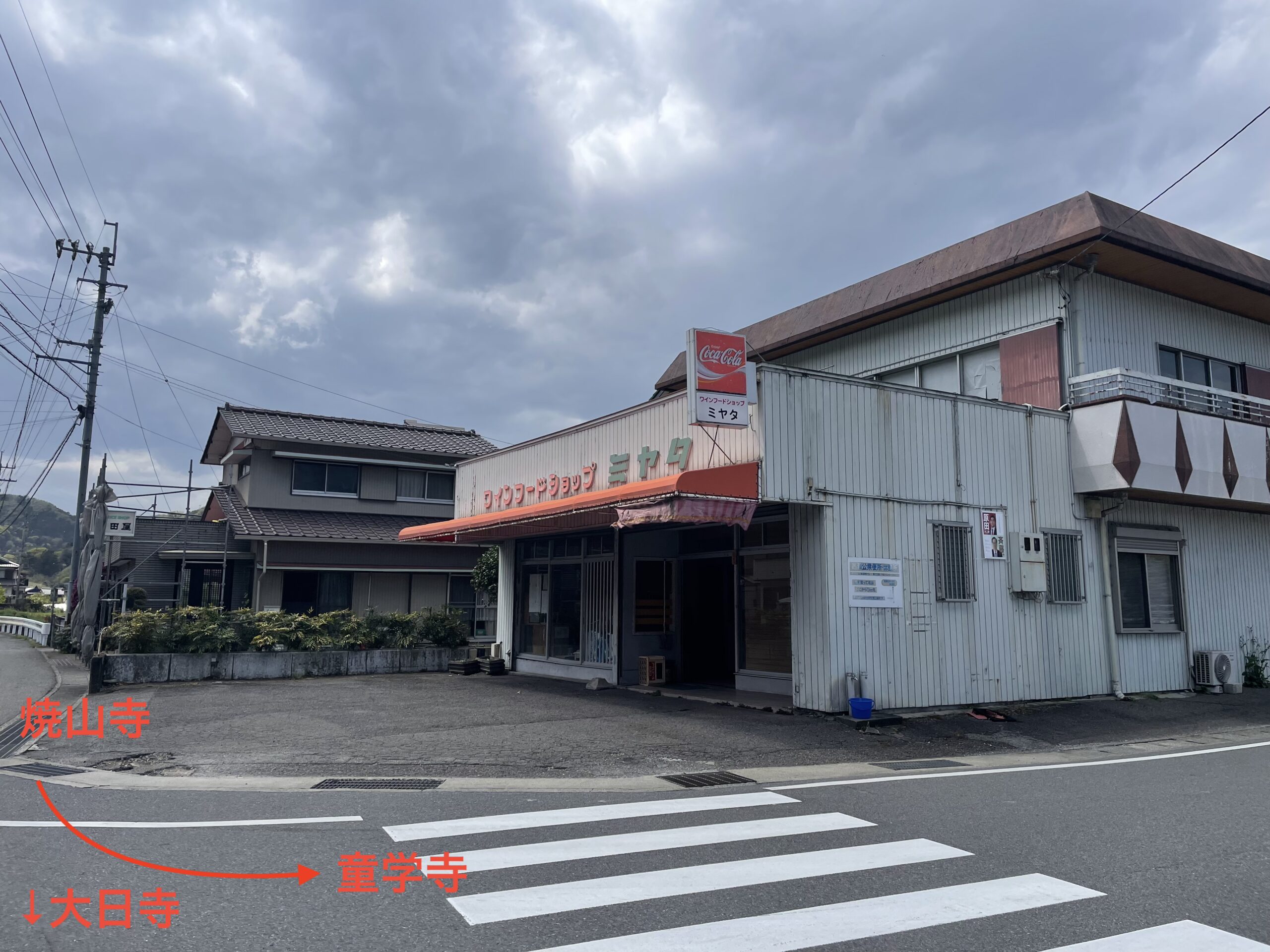 2日目(大山寺〜安楽寺)の経験から何となく予想はしていたが、案の定この分岐ポイントに「童学寺方面」を示す案内は何もなかった。強いて言うならワインフードのお店が目印である。「黄色い地図」と「Henro Helper」で道が合っていることを確認(前述したが、YAMAPには別格霊場のルート表示はない)、よし、ここで間違いない。何の矢印もない橋を渡ろうとしている私を、先を行く中国ご夫婦が不思議そうに振り返っていた。大丈夫、お互い迷ってないです(笑)。