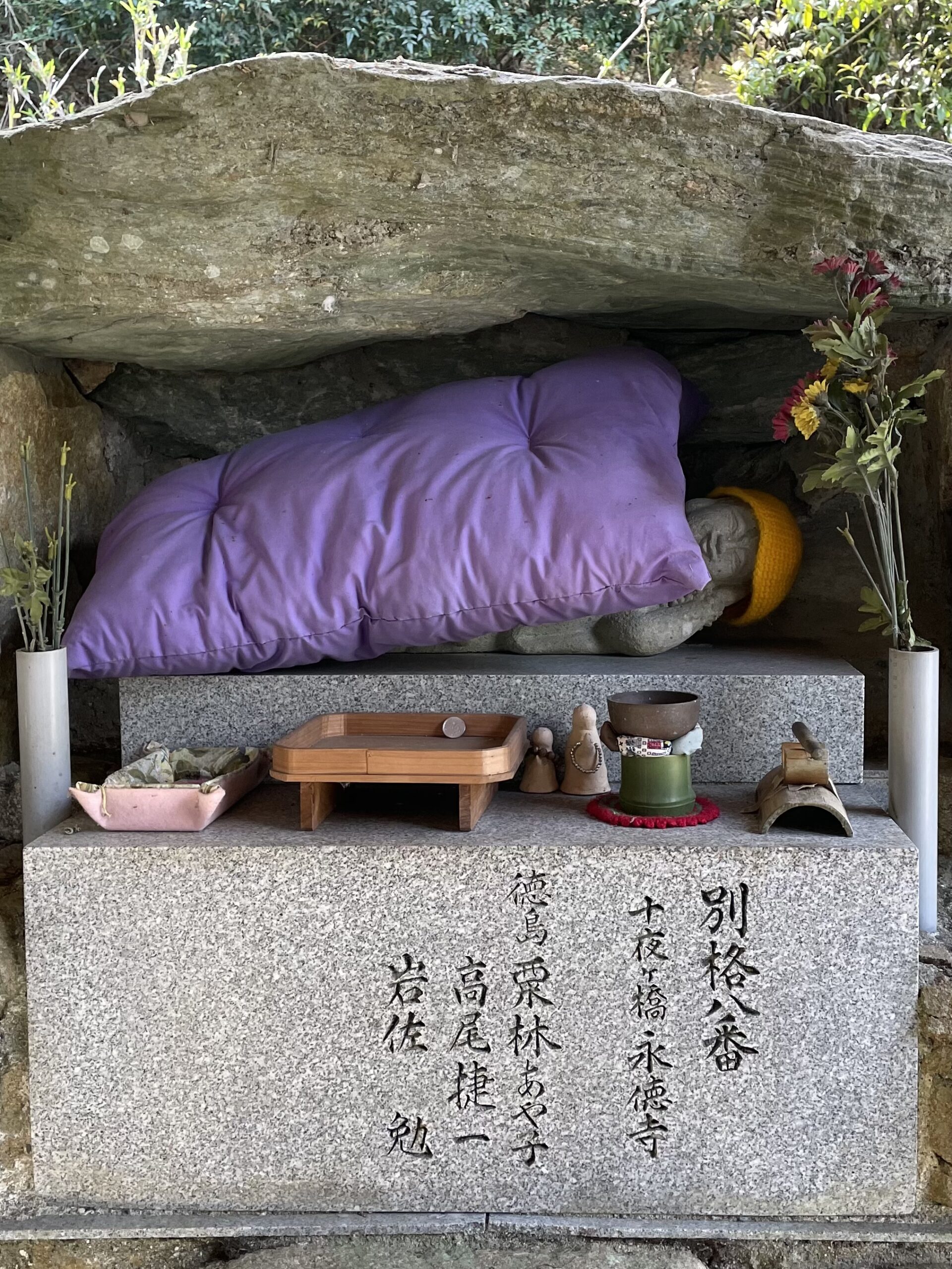 ちなみに童学寺への道については、二日前に泊まった「お宿イレブン」のオーナーさんが教えてくれた攻略ポイントがあった。「行きはトンネルを越えたら左に農機具置き場が見えてくるのでそこで曲がり、更に左に見えてくる黄色い札に従って竹林を通る」、「帰りは歯ノ辻神社の前から下の車道へ下りる遍路道がある」のふたつだ。前者は900m✕2(往復)、後者は450mほどショートカットできる。歩き遍路にとっては見過ごせない距離だ。