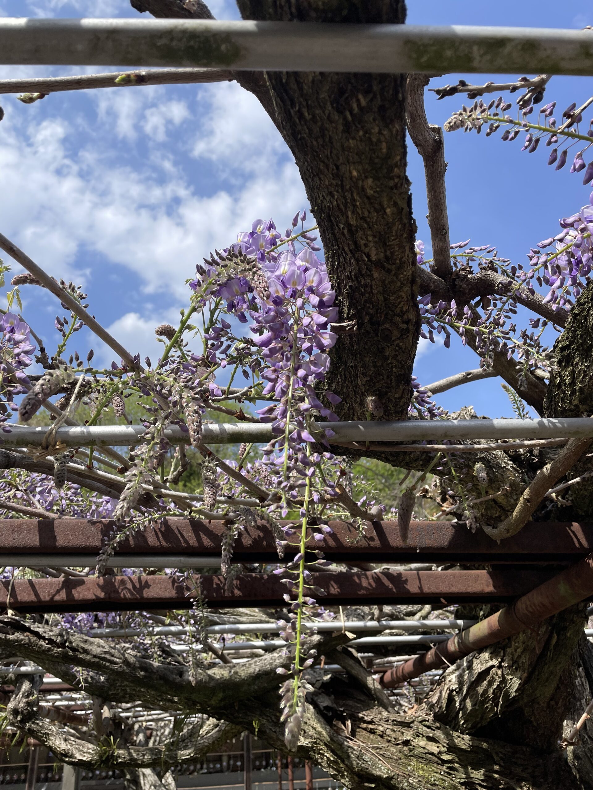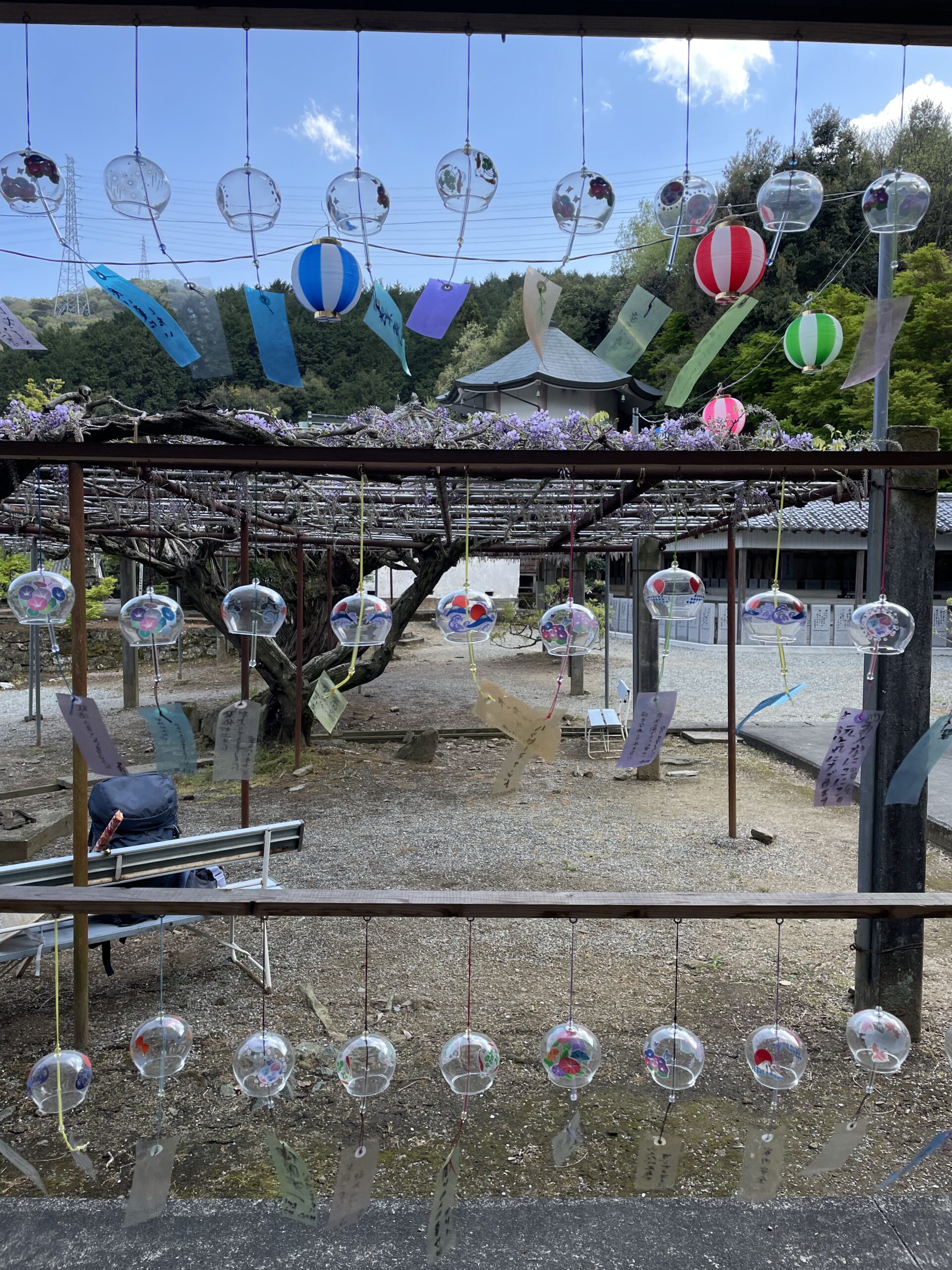境内には三十三不動尊、別格二十霊場、八十八箇所霊場とお砂踏みが3箇所もあって、ご利益てんこ盛りである。このうち、一番奥の八十八箇所霊場のお砂踏みの回廊が風鈴回廊になっている。 順番に巡っていって、藤棚の向こうにいよいよそれが見えてきた。立派な藤棚はまだ咲き始めで、残念ながらもう一週間早いという感じ。藤の写真を撮っているおじちゃんがいて、割れ物の様子を見に来たお寺の方に「花瓶が落ちちゃってるよー」と話しかけていた。どうやらご近所の方のようだ。