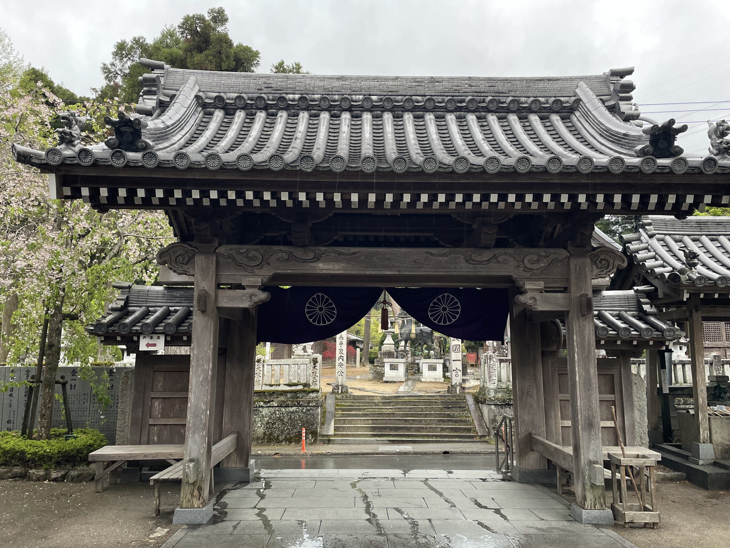 橋を渡ってすぐ雨が降り出した。そういえば16時頃から雨予報だったか…。予定ではもう大日寺に着いているはずだったのだが、おかしいなあ(←童学寺で遊びすぎだ)。それにしても、ついさっきまで青空が見えていたというのに、四国の天気は本当に急に変わる。改めて予報を見てみるとこれから1時間は止みそうにもく、雨足も強まりそうだ。諦めて、閉まった店舗の軒先を借りて雨支度をする。せっかくザックカバーを乾かしたのに、また被せることになった。そして歩くこと30分、車道沿いのカーブを曲がった先に大日寺の山門が現れた。16:20到着。