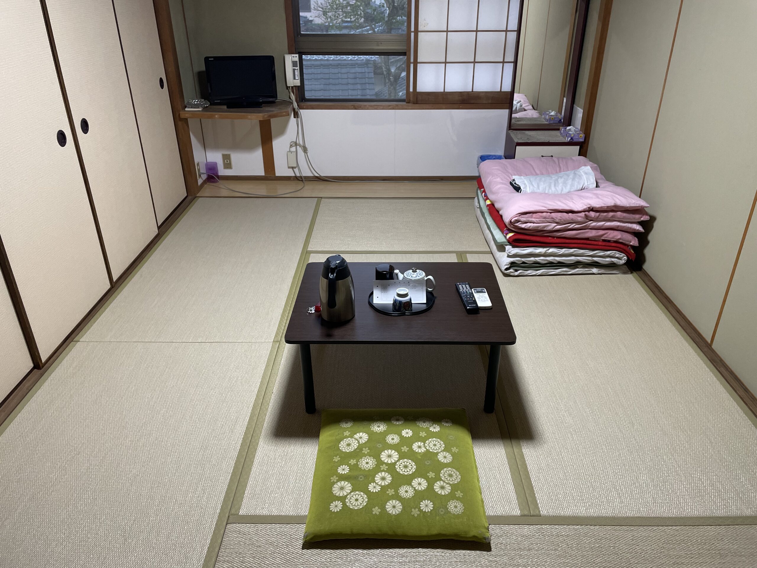 今日のお宿「かどや旅館」さんは大日寺から徒歩30秒、道路を隔ててすぐ隣である。16:45、チェックイン。三階建ての建物は階段も広くしっかりしていて、ヨレヨレの足にはありがたかった。案内してもらった「梅の間」は六畳に板の間もあって、今までのお宿で一番広い部屋である(そういえば、二階に上がるというのも初めてかも)。
