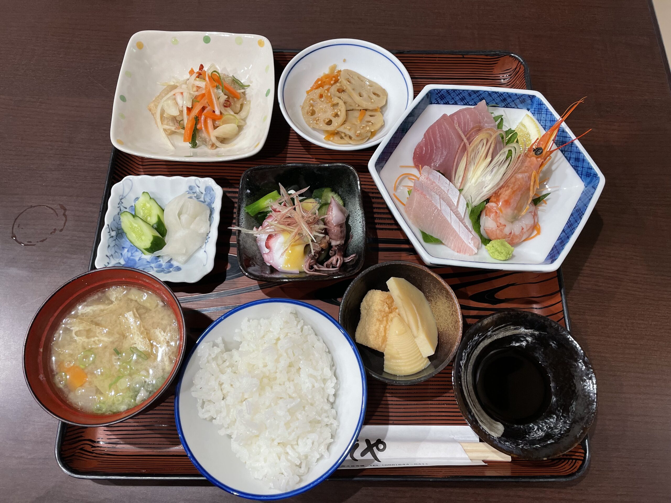 18:00、お待ちかねの夕ごはん。食堂には男性お遍路さん3人と自分の4人、ほかには飛び込みの海外からの宿泊客が1組あるようだった(飛び込みは素泊まりになる)。こちらの息子さんは日本料理の料理人とのことで、こだわりの食材のオンパレードにご飯が進む。地元のものというお米がおいしすぎて、おかわりを2回。おかみさんはご飯をよそいながら、長らくお米を仕入れていたところが店じまいしてしまって次を探すのに苦労した話や、宿泊事情の変遷など色々な話をしてくれた。