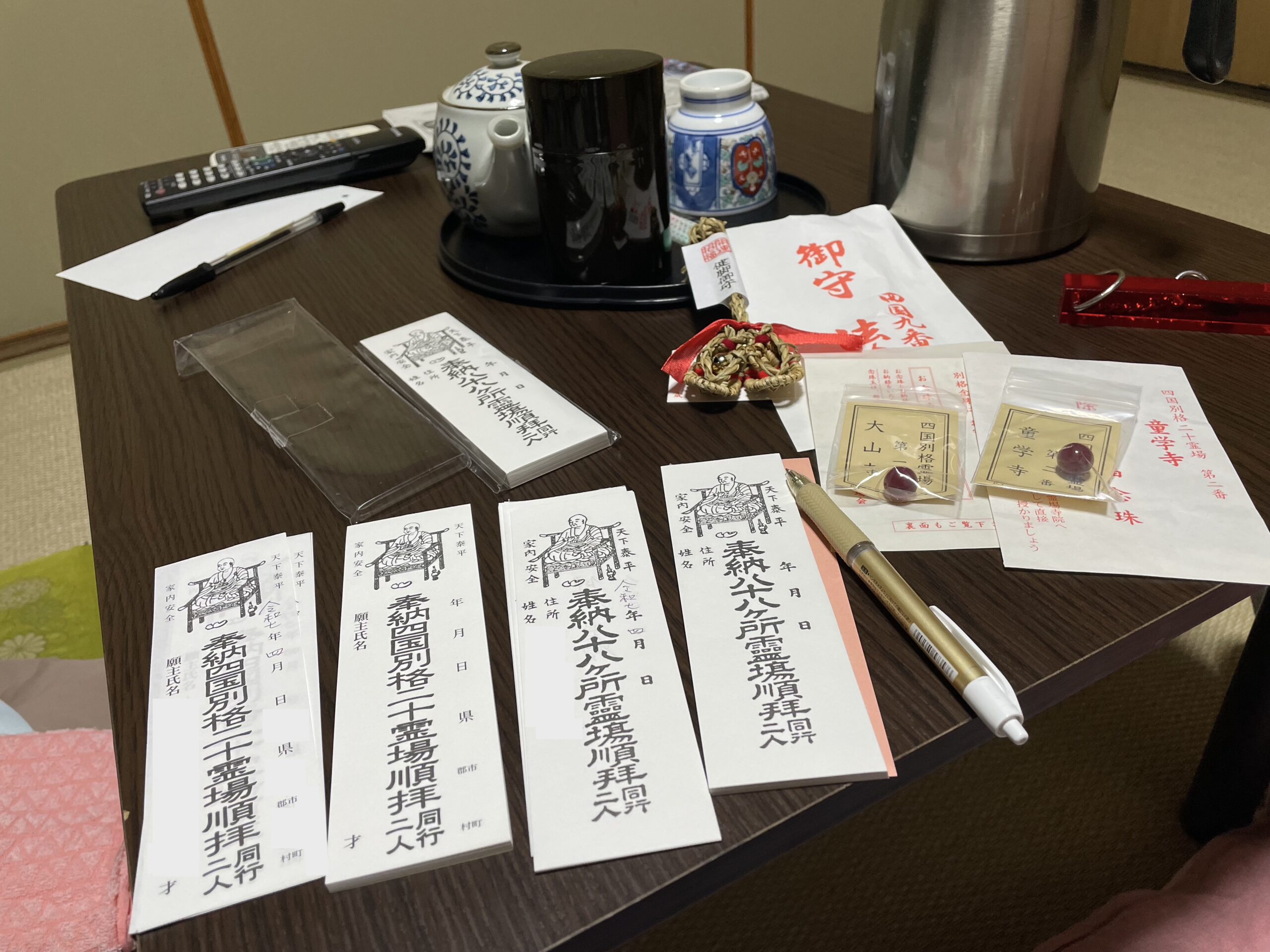 部屋には浴衣を用意してくれてあり、せっかくなのでそれに着替えてゆったり過ごした。気温は8℃と寒く、羽織が役に立った。明日は札所4箇所、例によって納め札を量産しておく。余裕をもって5セット、10枚書くと地味に大変だ(納め札は出発前に家で全部書いておく派と、毎日翌日の分を書いていく派に分かれるらしい。私は後者)。今日は写真が多すぎてクラウドへのアップがなかなか終わらなかったので、寝ている間にスマホちゃんに頑張ってもらうことにして、人間のほうは早々に眠りについた。