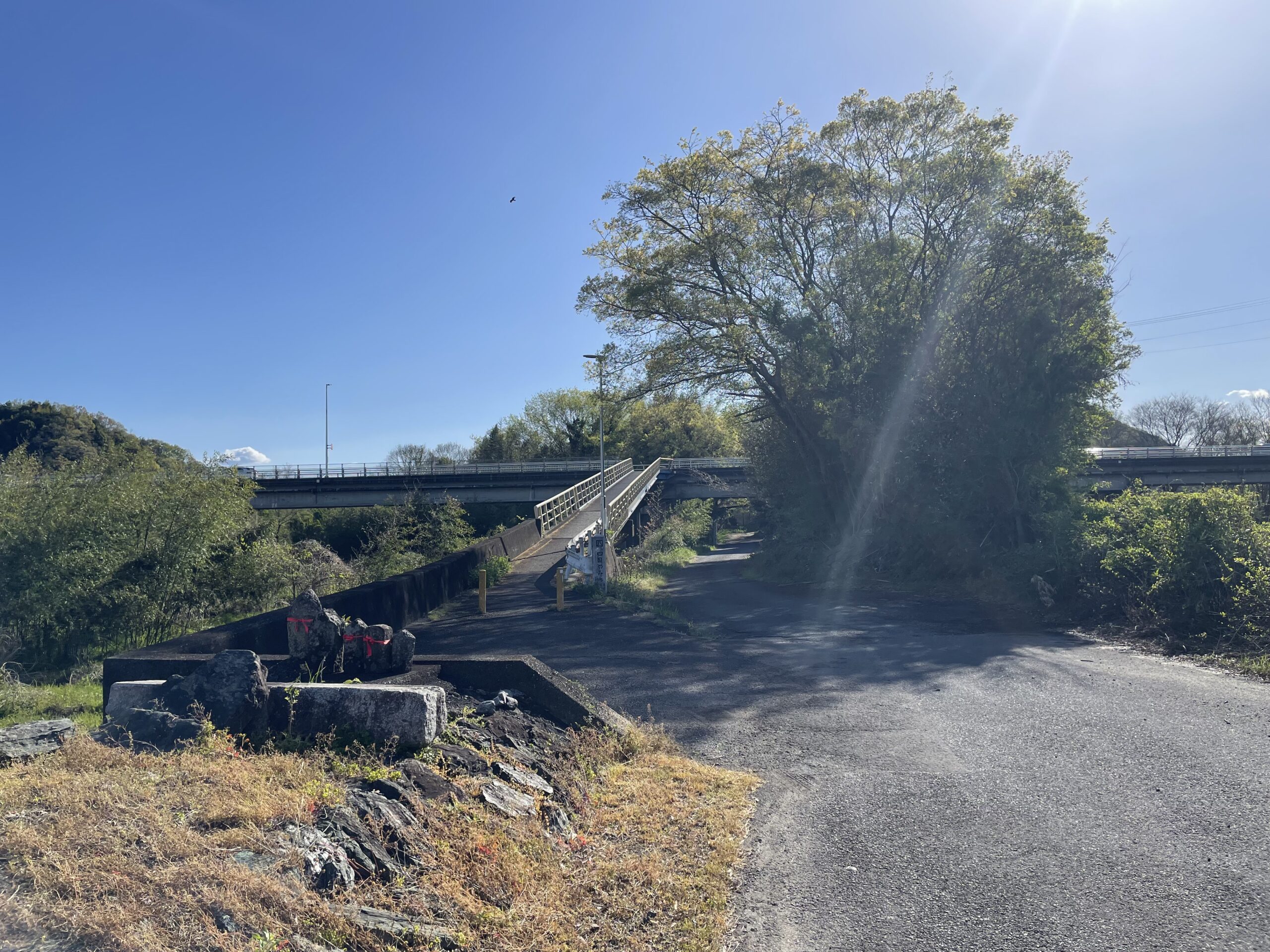 堤防沿いを進んで町工場の倉庫の前を通り過ぎると、前方に「一の宮橋」に上るスロープが見えてきた。この橋は車で渡ろうとするともっと長さがあるが、歩行者はこのスロープを上って橋の真ん中あたりから歩道にアクセスできるようになっている。橋の上に出て、昨日から旅の道連れになっている鮎喰川をまたまた渡る。ここまで来るとだいぶ河川敷も広くなっていて、川の上より河川敷の上を渡っている区間のほうが長い。