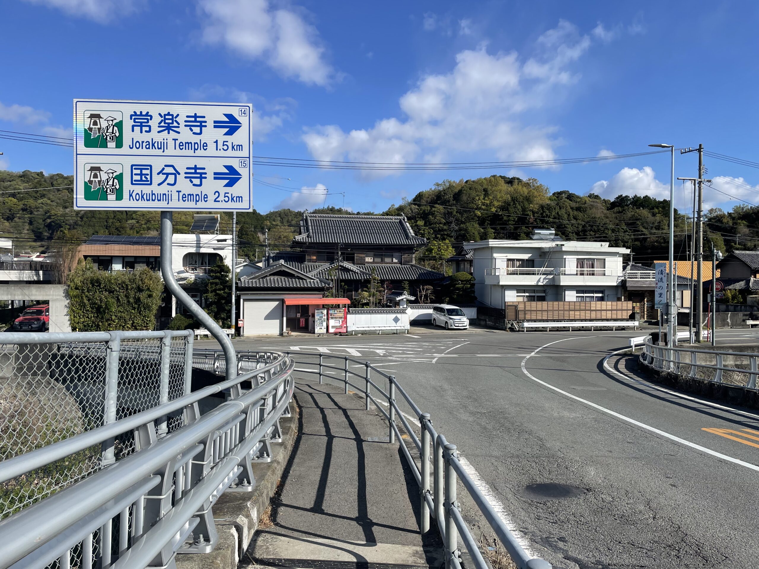 9:00ちょうどに常楽寺を出発した。次の15番札所・国分寺までの距離は0.8km、なんとたったの800mである。2つの札所が同じ敷地にあるという68番神恵院&69番観音寺(香川県)を除けば、おそらく最短の部類に入るだろう。すぐ着くだろうと高を括っていたのだが、その油断が災いしたのか、道しるべがなかなか見つけられなかったり、見つけても読み間違ったりして、お寺の敷地から一般道路に出るまでにけっこう時間がかかってしまった。