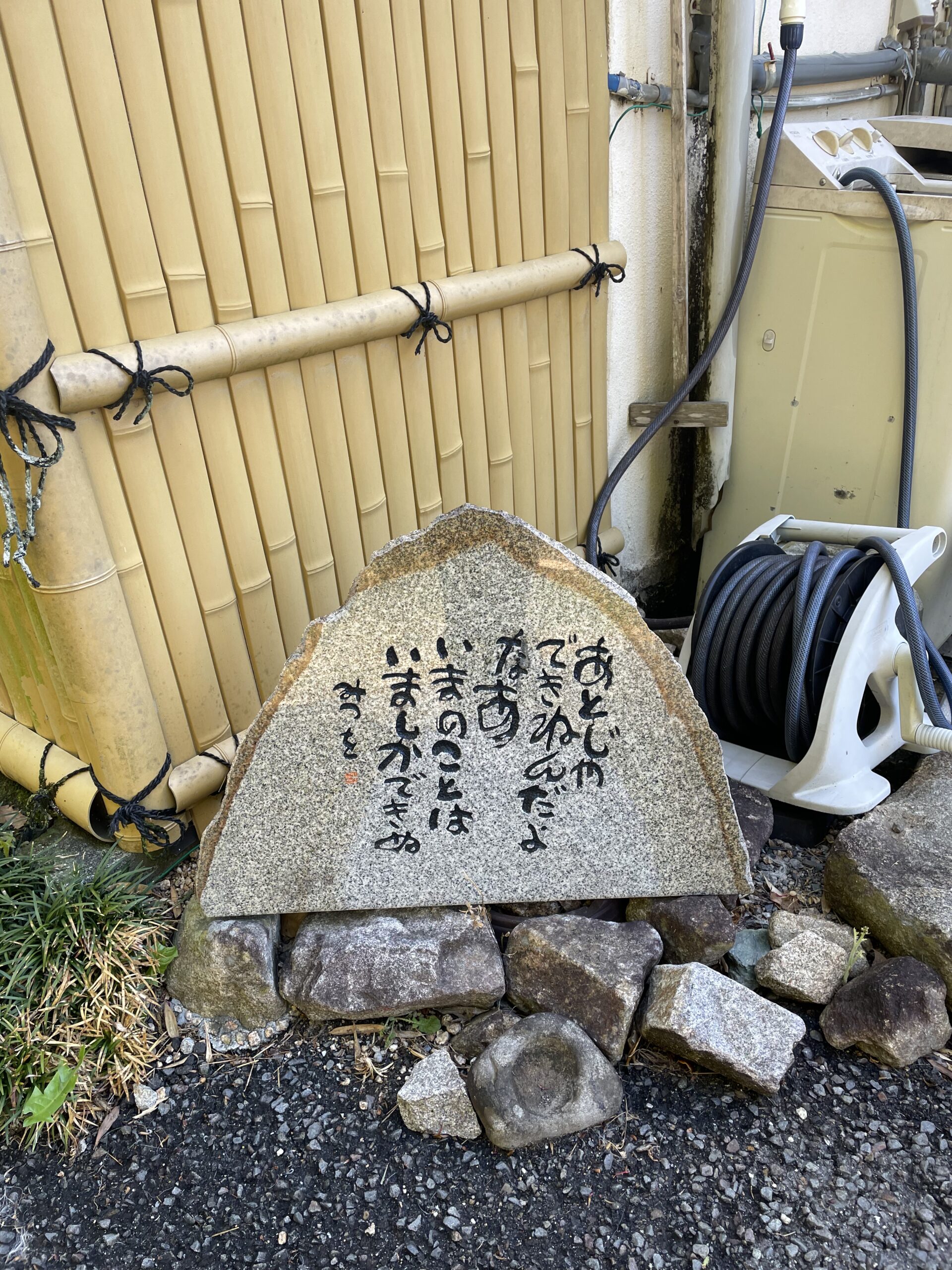 橋を渡りきると、14番常楽寺、15番国分寺の方向を示す巨大な案内看板が出てきた。矢印が豊富ってすばらしい!!とひとりで喝采する。道沿いのおうちには七福神の石像とともに相田みつを氏の詩が刻まれた石板が置かれていた。ここを通る遍路に向けての呼びかけなのだろうか、巡礼の途上にいると、なおさらその言葉のひとつひとつが心に沁み入る。スペインでもそうだったが、沿道の個人宅に時折こうして歩き巡礼たちに向けたディスプレイがあって、それを見るとテンションが上がる。