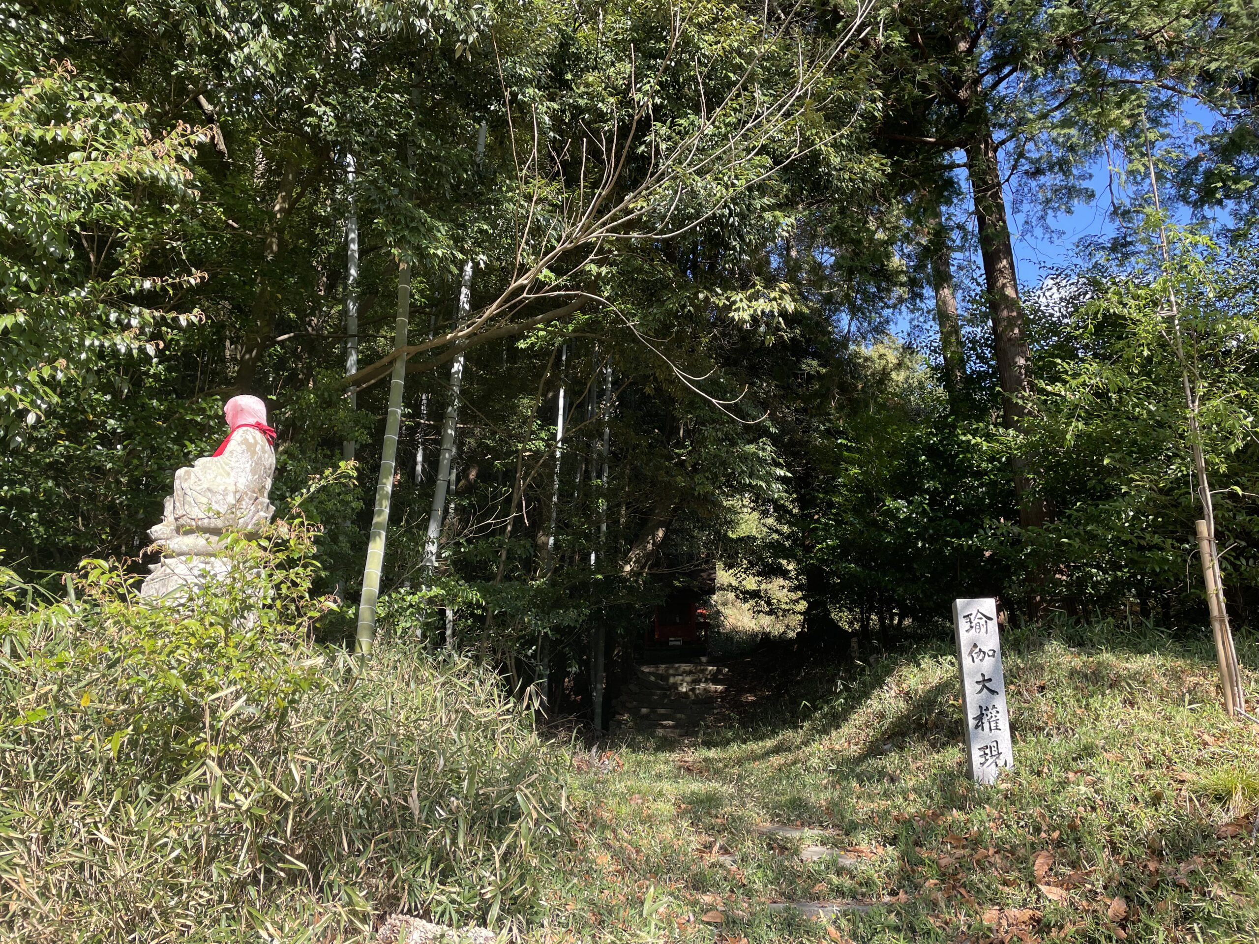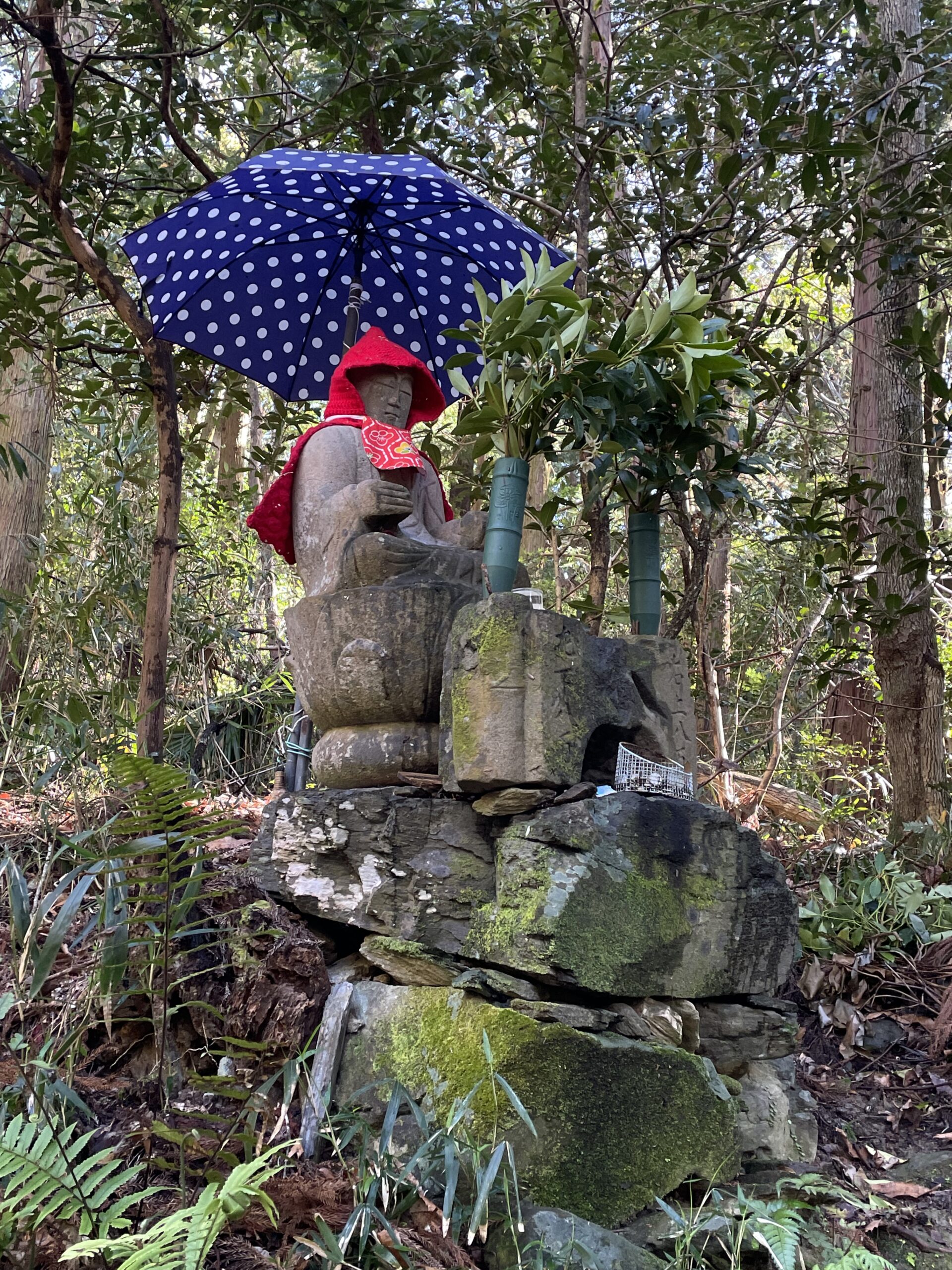 登り始めは明るい林の中なだらかな道が続き、空は青いし風はそよぐし、どこからか沢の流れる音も聞こえてきて、快適なトレッキング気分を楽しむ。ここぞとばかりに山谷袋から取り出したお鈴も軽快に鳴る。先程の雨で道は少しぬかるんでいたが、地元の方がこまめにお手入れしてくれているのか、落ち葉はきれいに払われていて歩きやすい。水玉模様の傘を差したお地蔵さまがいて、かわいい頭巾と前掛けがとってもおしゃれ。どんなおばあちゃまが着付けをしてるのかしら、などとほっこりした気持ちになる。