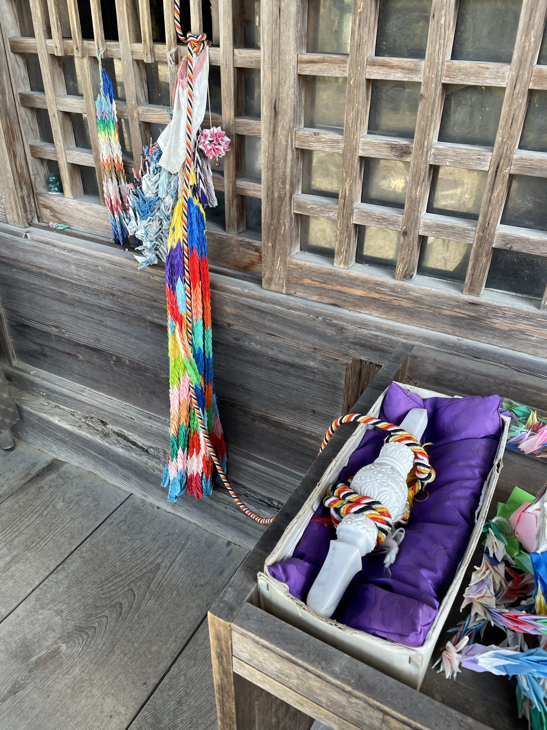 大師堂にはカラフルな四色の紐で彩られた独鈷杵が置かれていた。これは空海が中国(唐)で修行を終えて日本に帰国する際に、「日本で密教を広める拠点を置くのに適した土地はどこ〜?そーれっ」と3本の杵を投げたところ(実際はこんなにポップではなかったと思うが笑)、五鈷は京都東寺、三鈷は高野山、独鈷は四国に飛来したとされている伝説に基づくものだ。このため四国霊場ではこの独鈷杵はよく出てきて、「南無大師遍照金剛」と唱えながら触れると弘法大師と同行二人の結縁ができるとされている。