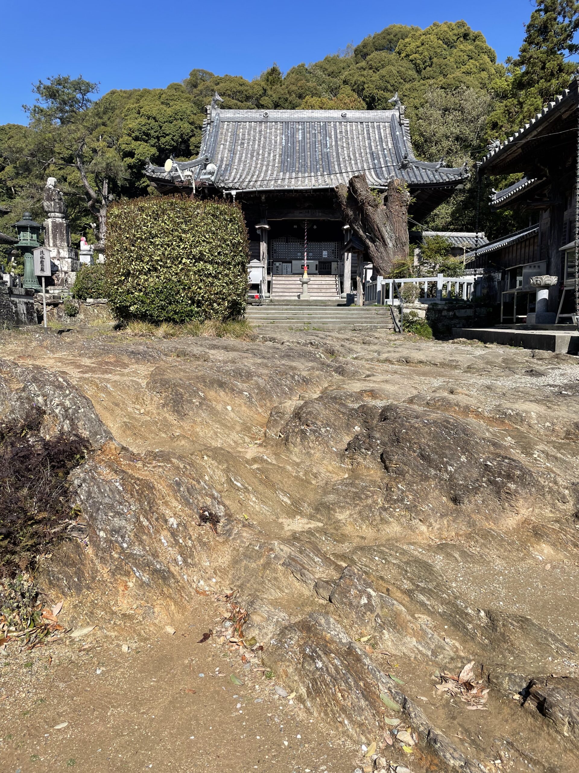 階段を上りきると、境内一面ががごつごつとした岩に覆われているさまが目に飛び込んでくる。断層が露わになった様子が流れる水のようにも見える、「流水岩の庭」と呼ばれる特徴的な境内だ。江戸後期(1818年)にそれまでお寺が建っていた谷地に灌漑用池を造り(多分さっき通ってきたため池)、その50mほど上に岩肌を削って移転したことで、この景観ができたらしい。相当固い岩盤に思われるが、よくここを削って造成したものだ。誰が思いついたんだろう、みんな仰天したのでは…などとその時のことを(主に人足になる側の気持ちで)想像してしまう。