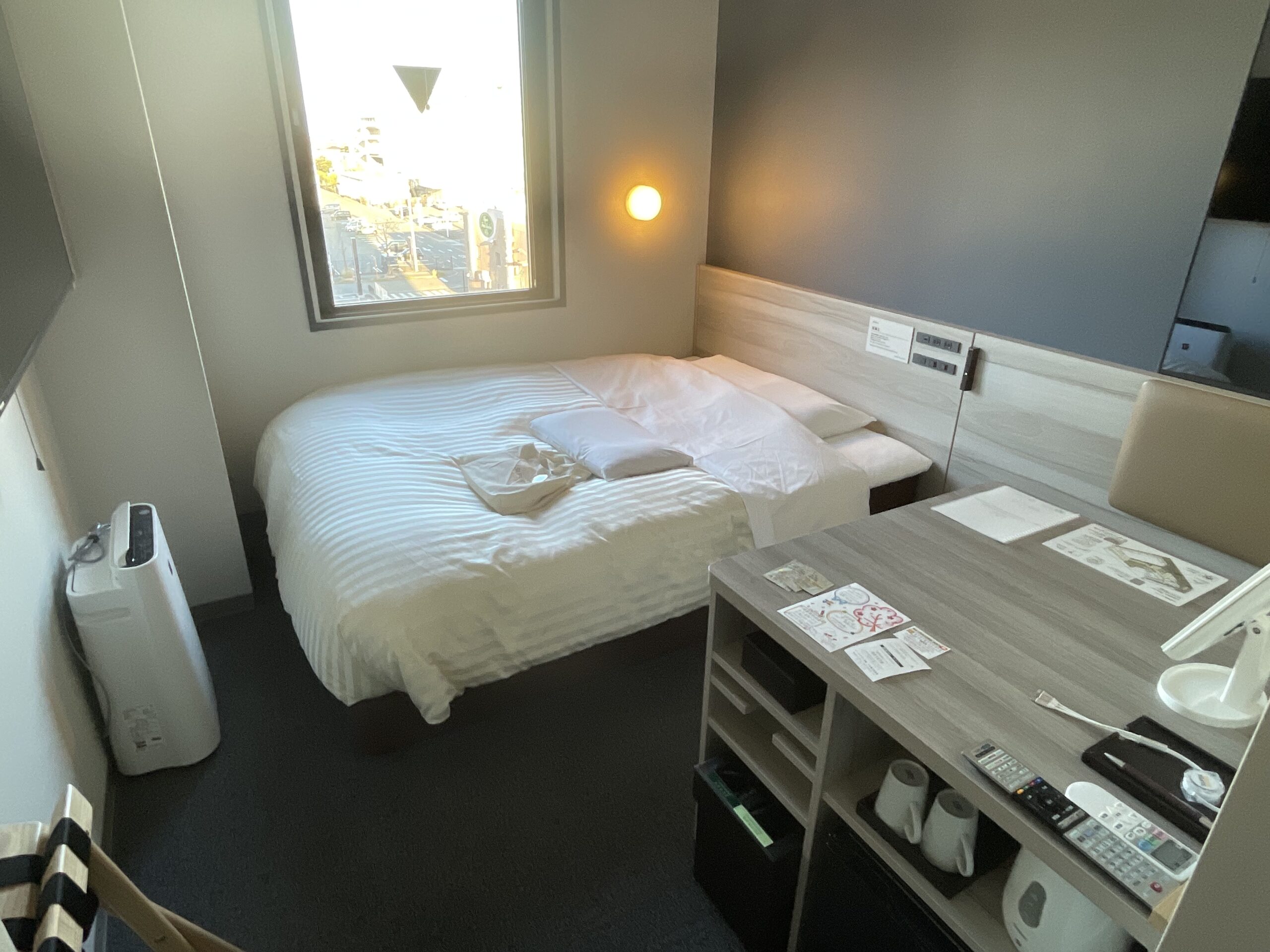 17:40、無事チェックイン。お宿に着いたらまずはお風呂!!このホテルには部屋のユニットバス以外に天然温泉の大浴場があるのだが、普通(?)の観光客やビジネス客は着いて早々にお風呂なんて入らないのか、一番乗りの貸切である。何度も温冷浴をして、よれよれになった脚をほぐす。とにかく膝がだるい。お風呂の次は洗濯だ。洗濯機は1回200円だったが、乾燥機はサービス!しかも洗剤まで置いていてくれていてありがたかった。