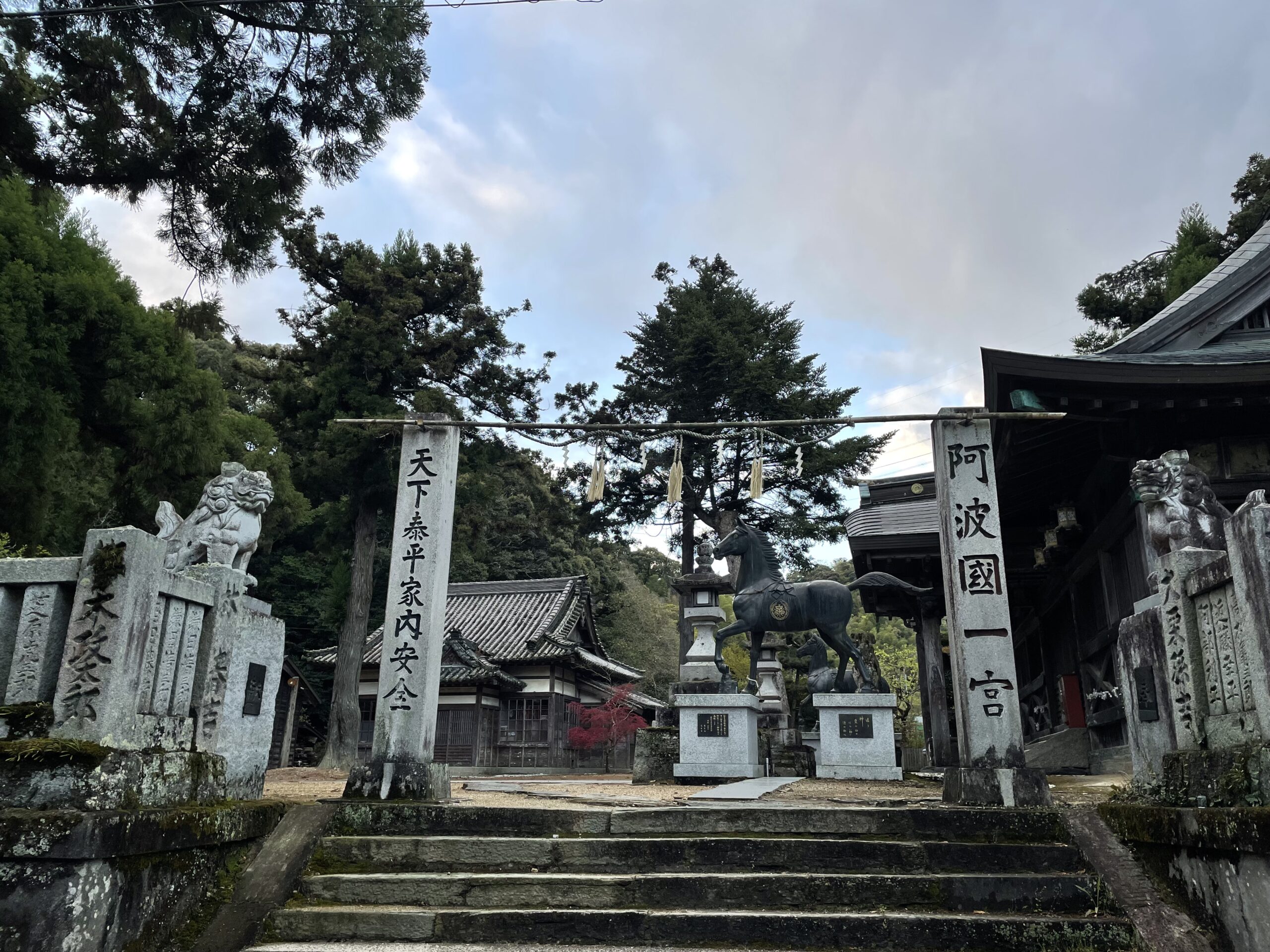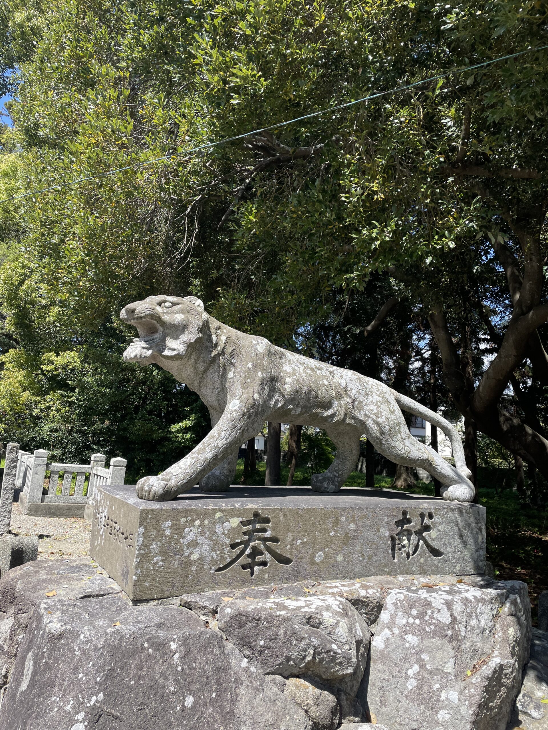 今はその時季ではないようだったが、この神社は花手水やライトアップなど四季折々にさまざまな意匠を凝らしており、それを目的に県内外からの参拝者も多いようだ。本殿の前には狛犬ならぬ狛虎もいて、ネコ科特有のしなやかさが彫刻にもしっかり現れていた。狛犬ちゃんはにっこり笑顔。境内はとても静かで、さわさわと揺れる木々の葉っぱの音が心地よかった。神社の向かいのお寺(大坊千輻寺)にはまさしく歩き遍路の心を示すような格言が掲げられていたが、解脱しきれない身としては耳が痛いところ。