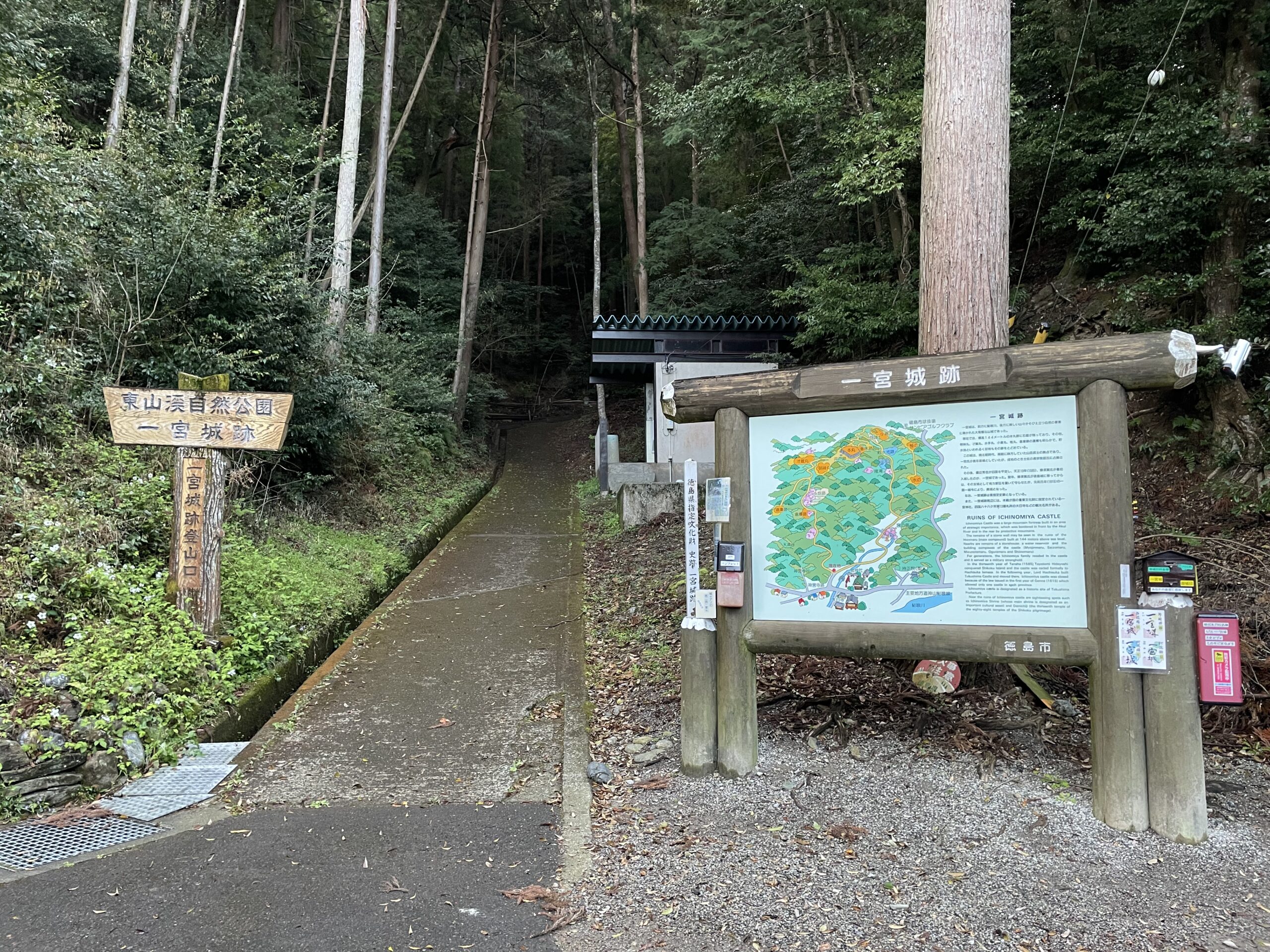 お城の説明板曰く、「一宮城は1338年に小笠原(一宮)氏により築城されたが、天正十年(1582年)、長宗我部元親の侵攻を受けた。その3年後、豊臣秀吉の四国征伐時には、鮎喰川を挟んだ辰ケ山に陣を構えた豊臣秀長と長宗我部元親との攻防の舞台となった(要約)」とある。