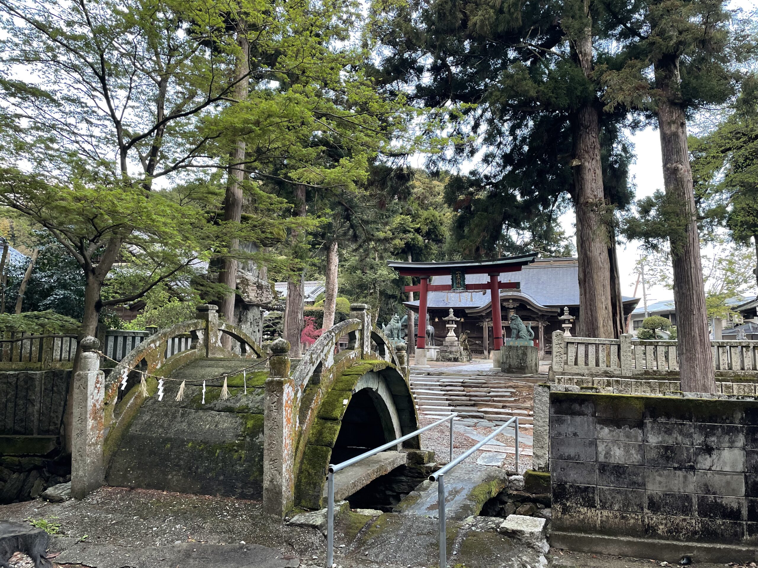 本殿の正面は一宮城跡の入口へと続いており、敷地の境に苔むしたまんまるの太鼓橋があった。老朽化していることもあるが、角度が急すぎてさすがに装飾用とみえ、実際に渡ることはできない。
