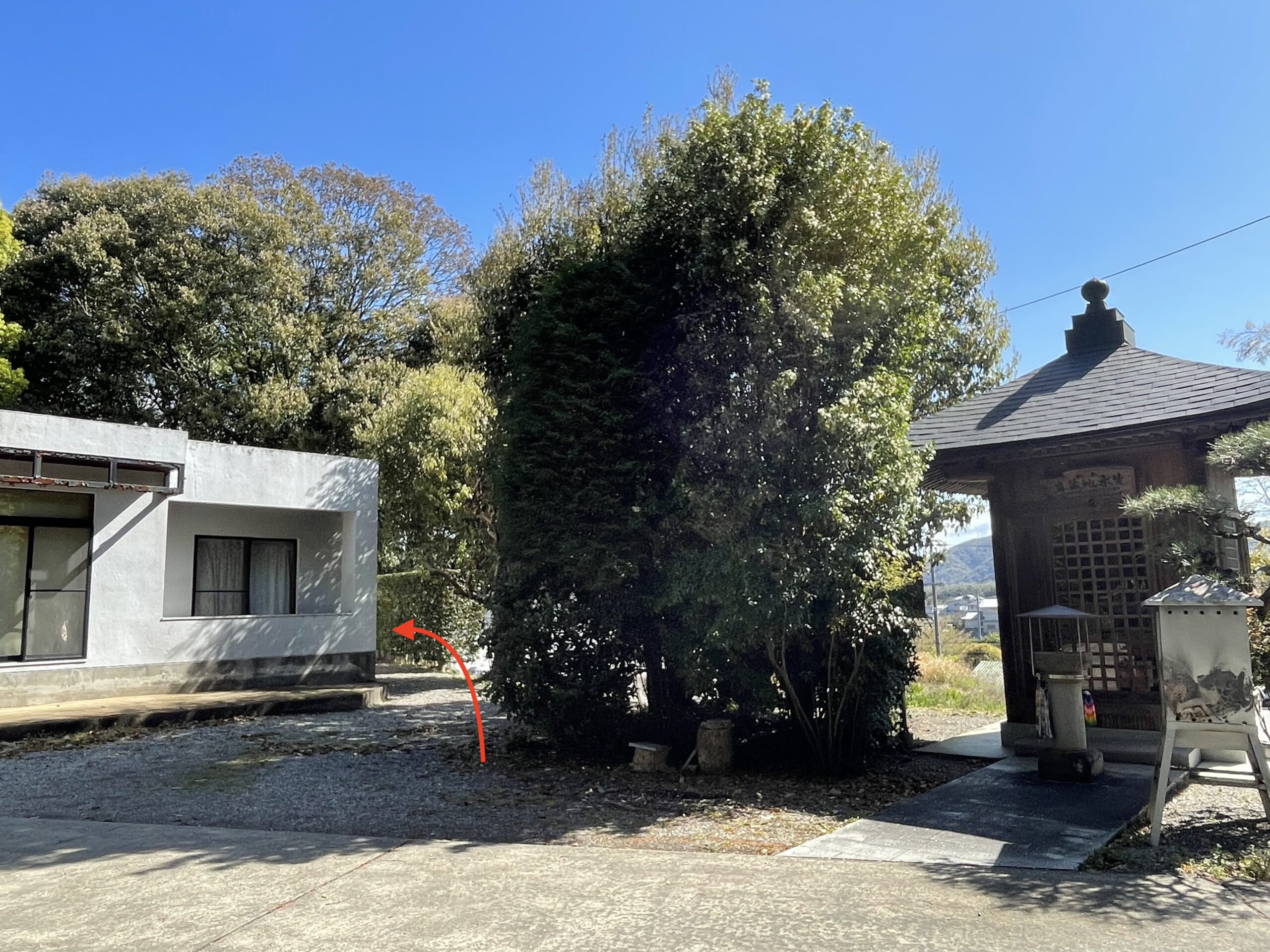 常楽寺は5番地蔵寺と同じく奥の院が隣接しているタイプ。その慈眼寺でお参りをしたところまではよかったのだが、ぱっと境内を見渡したところ、どうやらこの敷地は行き止まりのように見える。道を間違ったかと思ってさっきの神社のあたりまで戻ってみたりとウロウロした結果、お堂の隣の寺務所と思われる建物と生け垣の間に奥に抜ける道を発見した。この建物が人の住んでいる住宅っぽく見えたので、始めはそこまで入り込むのを躊躇ったのだ。生け垣に近づくと、ひっそりと「順路」と書かれた札がかかっていた。