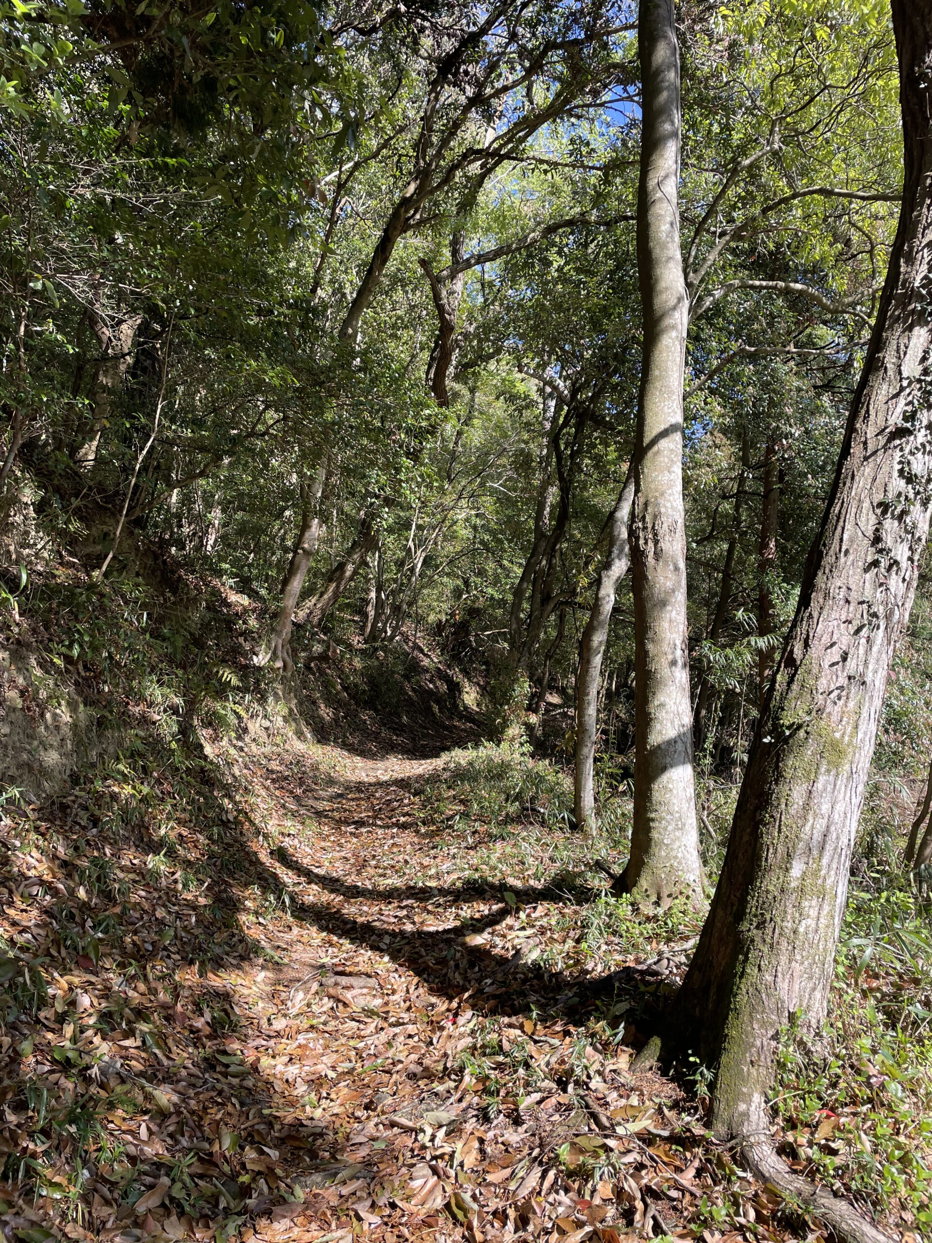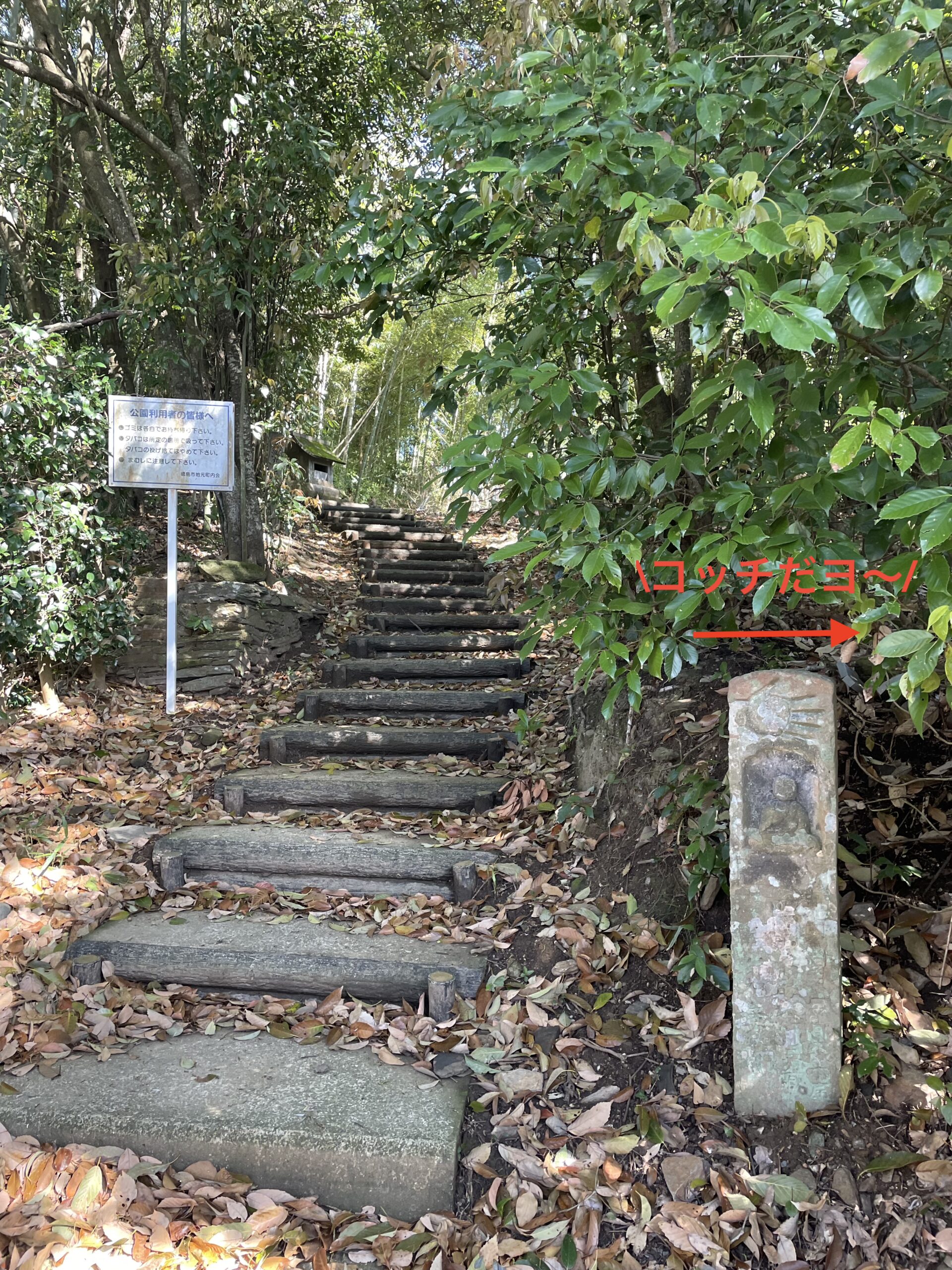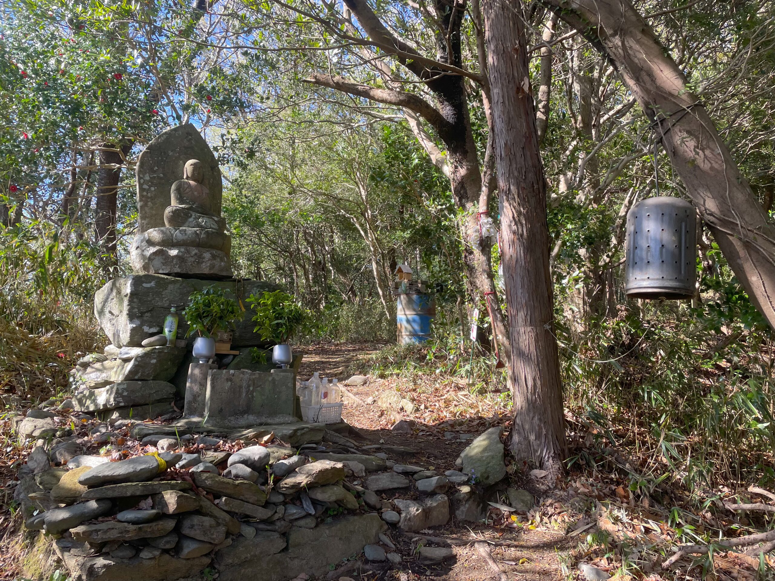 そこからの下り道は一面の椿に彩られた道で、再びロープのお世話になりながら下る。岩ごろごろの道も躓かないよう気を使うが、土だけの道もそれはそれでとっかかりがなく滑りそうで神経をすり減らす。5分ほどで車道に下りた。これでさすがに終わりかな、と思ってカーブの先に視線をやると、ほんの10mほど先にまた山道への入口が。まだあるのか…!峠道が好きで踏み込むくせに、車道に出てくるとやたらホッとするし、何度も山道が出てくると「もう早く終わって…」と思うこともある、複雑な歩き遍路ごころである。