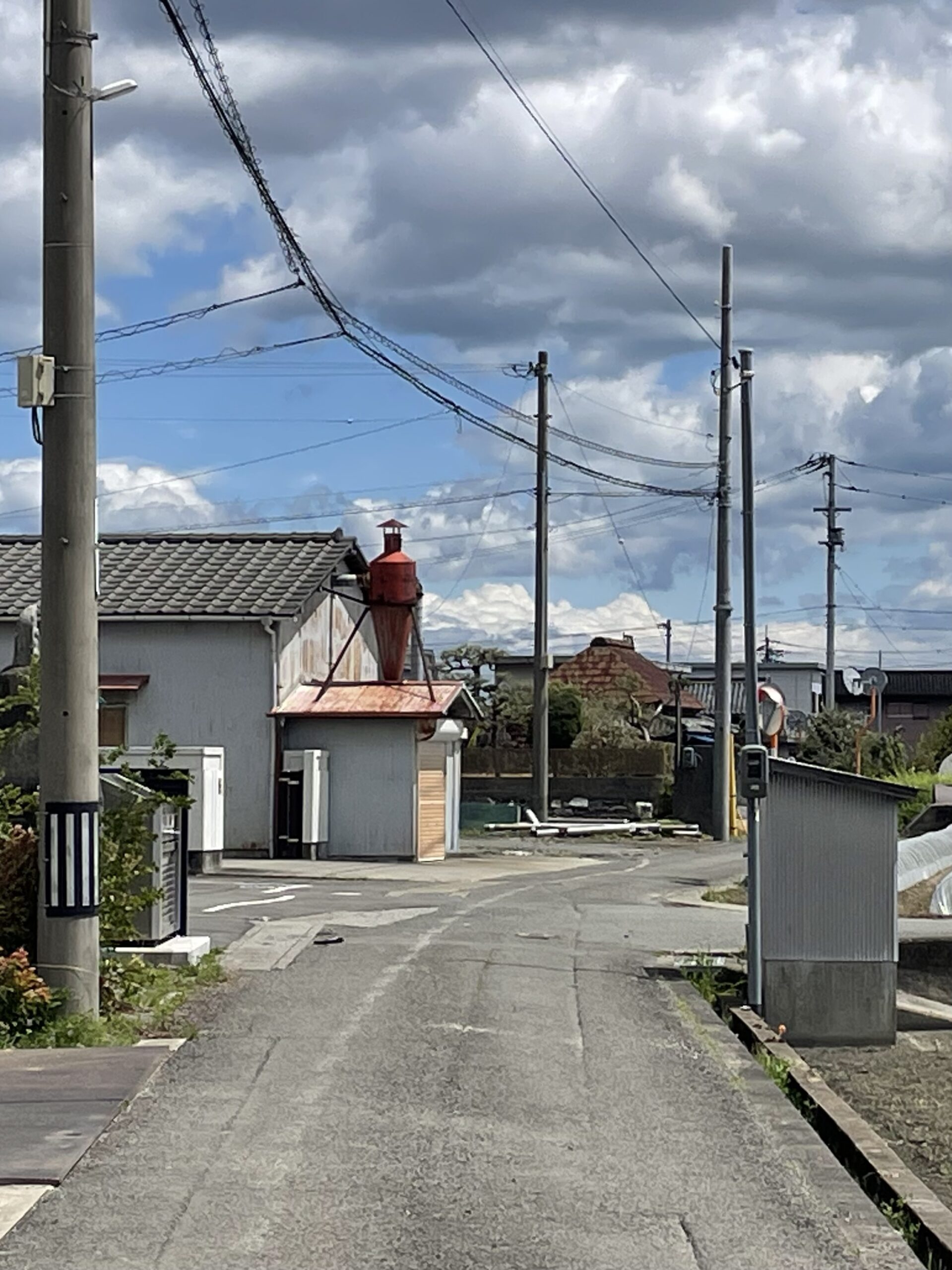 神社を出て30分ほど歩いたあたりから、風が強くなってきた。今日の道はいつにもましてお地蔵さまが多かったのだが、そのお召し物も風に煽られてはためいている。赤い頭巾と前掛けのお地蔵さまがあまりにたくさんいたものだから、ついに遠くに見えてきた赤い煙突?までお地蔵さまに見間違ってしまった。