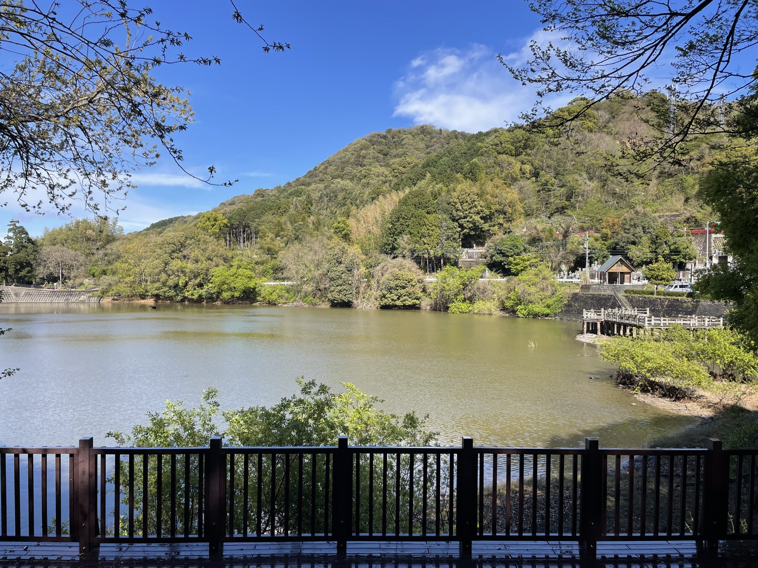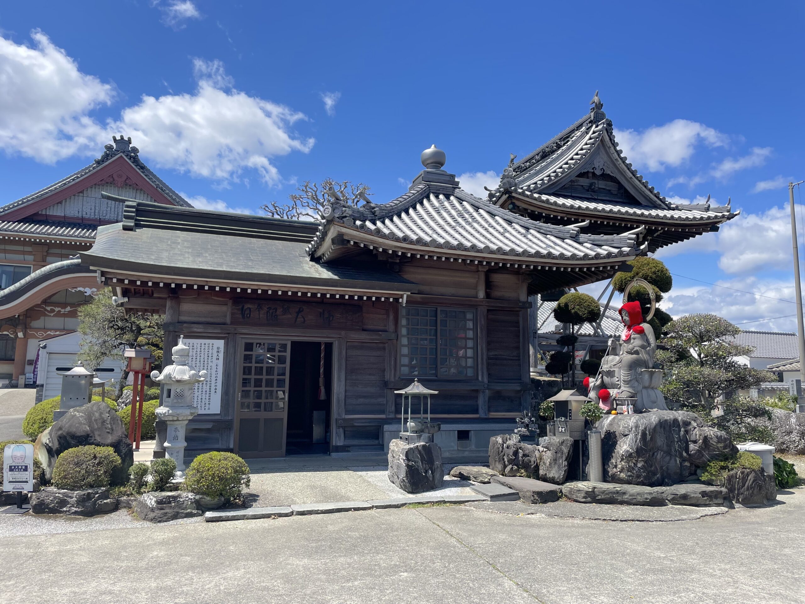 地蔵院は弘法大師が女性の安産を願って開いたのが始まりとされており、境内には7世紀頃の古墳があったり、曼荼羅霊場でもあったりと見どころも多いお寺である。今通ってきた地蔵院池ももともとはこのお寺の放生池であり、藩主の舟遊びなども行われていたそうで、どうりで優美な雰囲気だったわけだ。時間が押していたため外から手を合わせるだけになってしまったが、鮮やかに彩色された本堂の彫刻が道からでもよく見え、それに合わせたようなカラフルな垂れ幕が風にはためいて踊っている様子が楽しげだった。