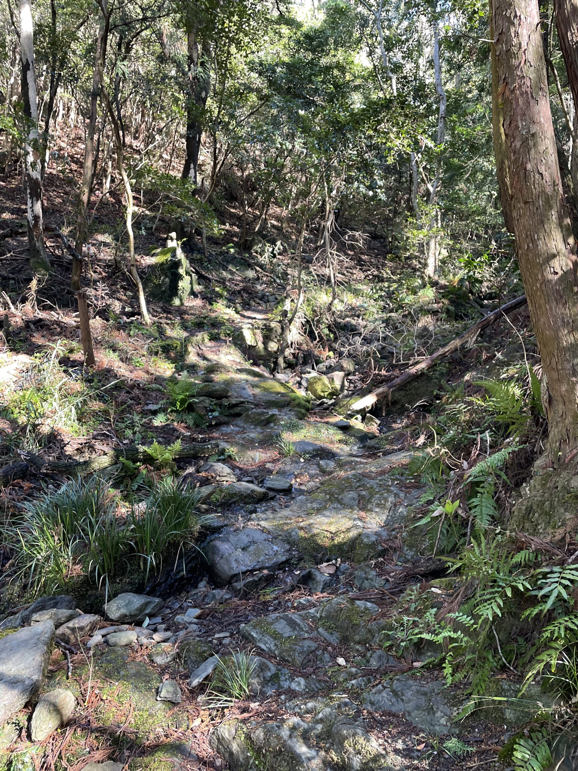 この最後のパートもまた急で、ロープを頼りに登ったり下ったりの道が続いた。しかも峠を越えた先の東の斜面だったため陽が完全に遮られる形になり、急に山の雰囲気がそっけないものに変わったような感じがする。薄暗い森の中、なにか人ならざるものに馬鹿されないようにと、金剛杖の鈴を意識的に大きく鳴らしながら先を急いだ。