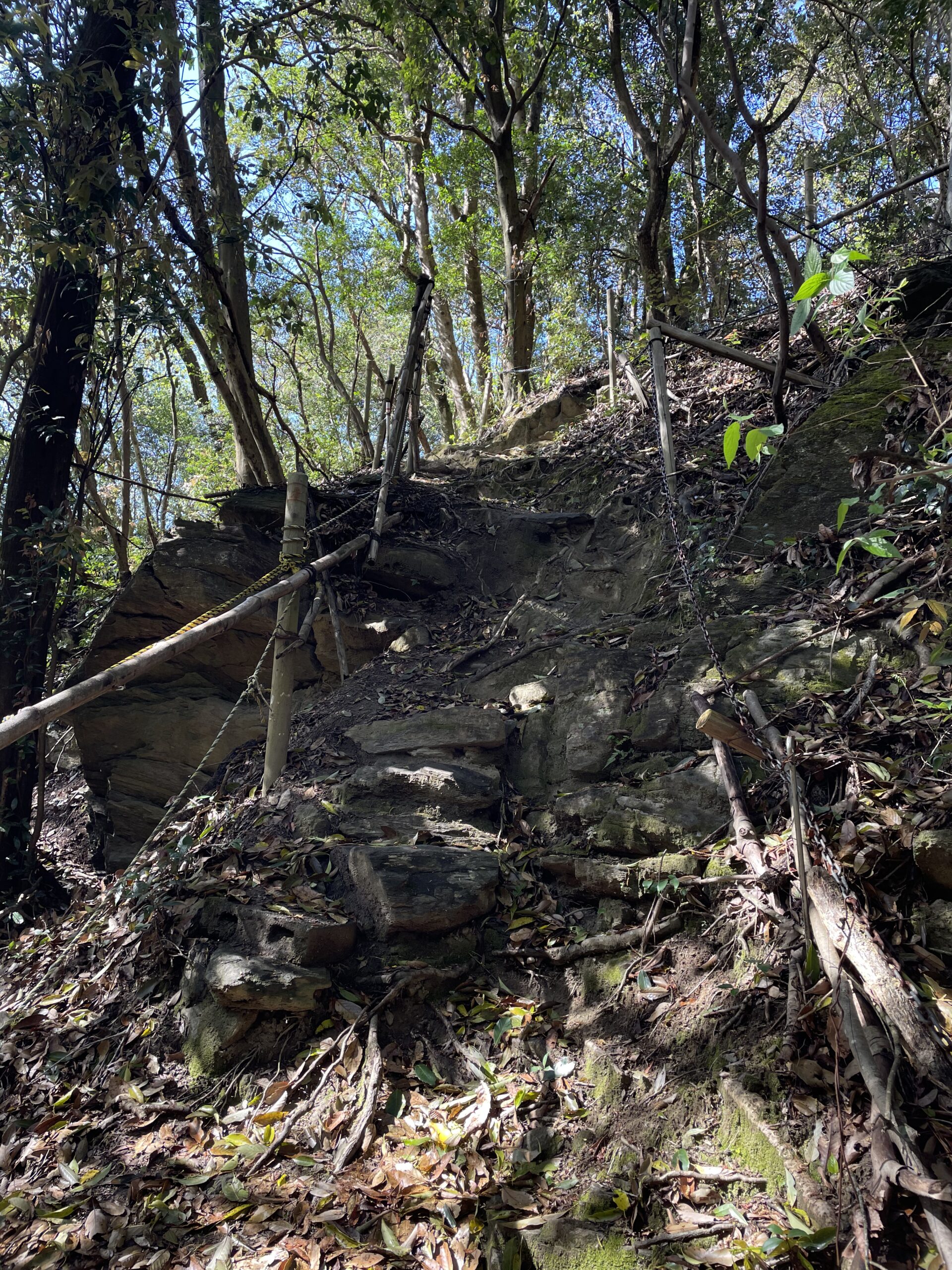 なんとか無事に下り終えてほっとしたのも束の間、今度は登りでロープの連続である。ついに本当の鎖まで出てきて、テンションがあがって動画を撮りながら登っていたら見事にコケた。スマホが谷底に吹っ飛んでいかなくてよかった…。その後は心を入れ替えてマジメに斜面にとりかかる。なんと、地蔵越は標高こそ140m程度とはいえ、瞬間最大風速でいうと焼山寺を超える傾斜だったのだ。