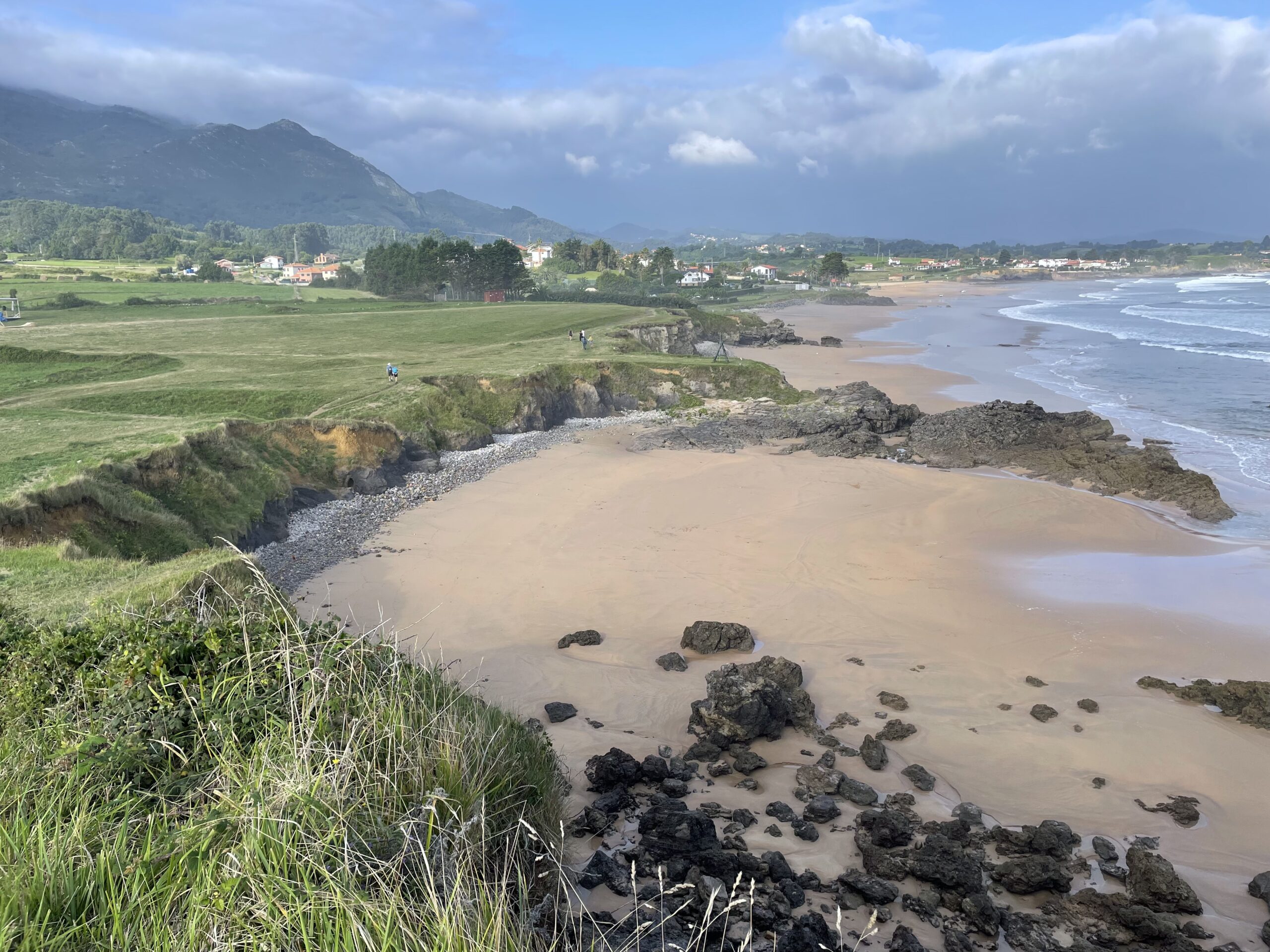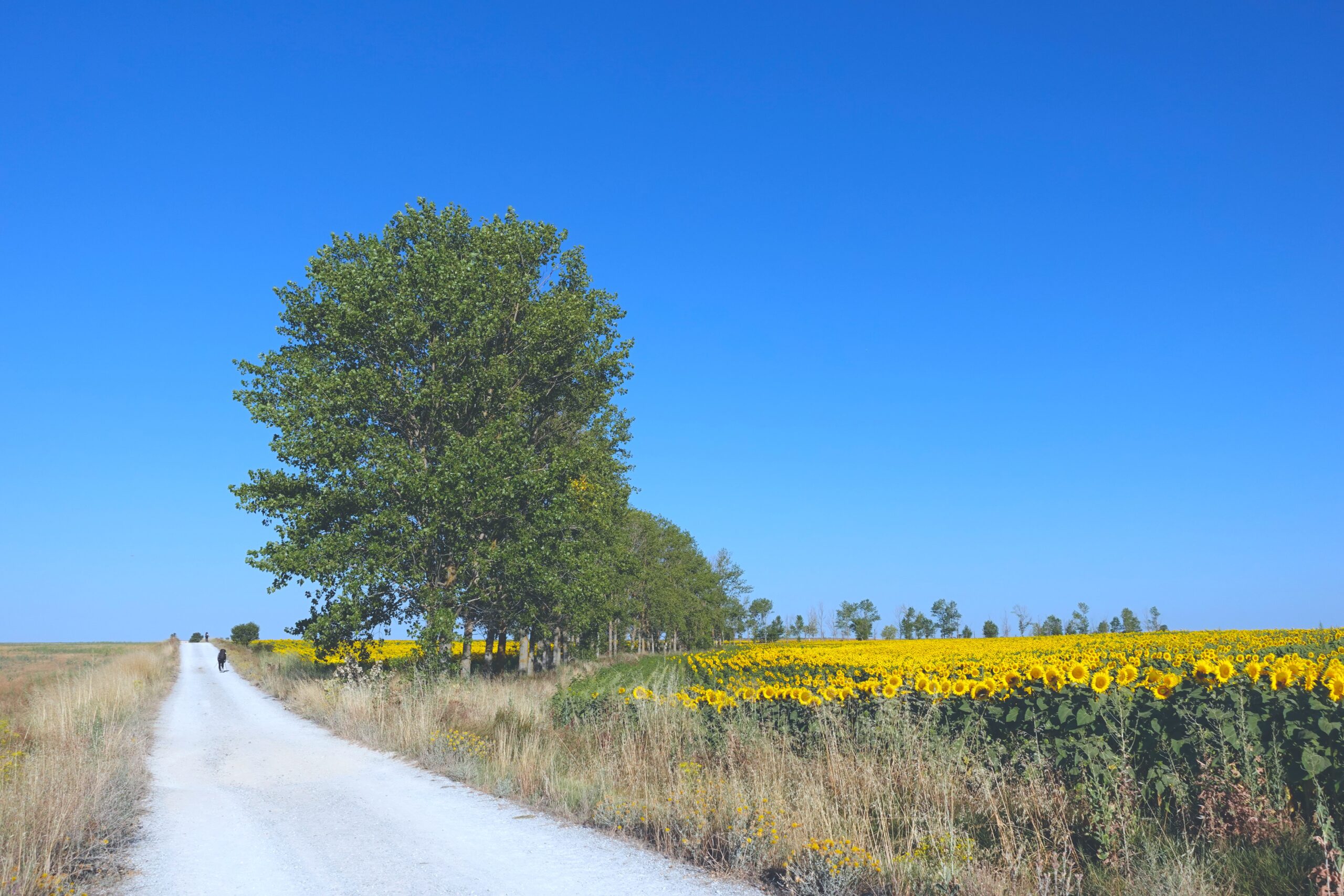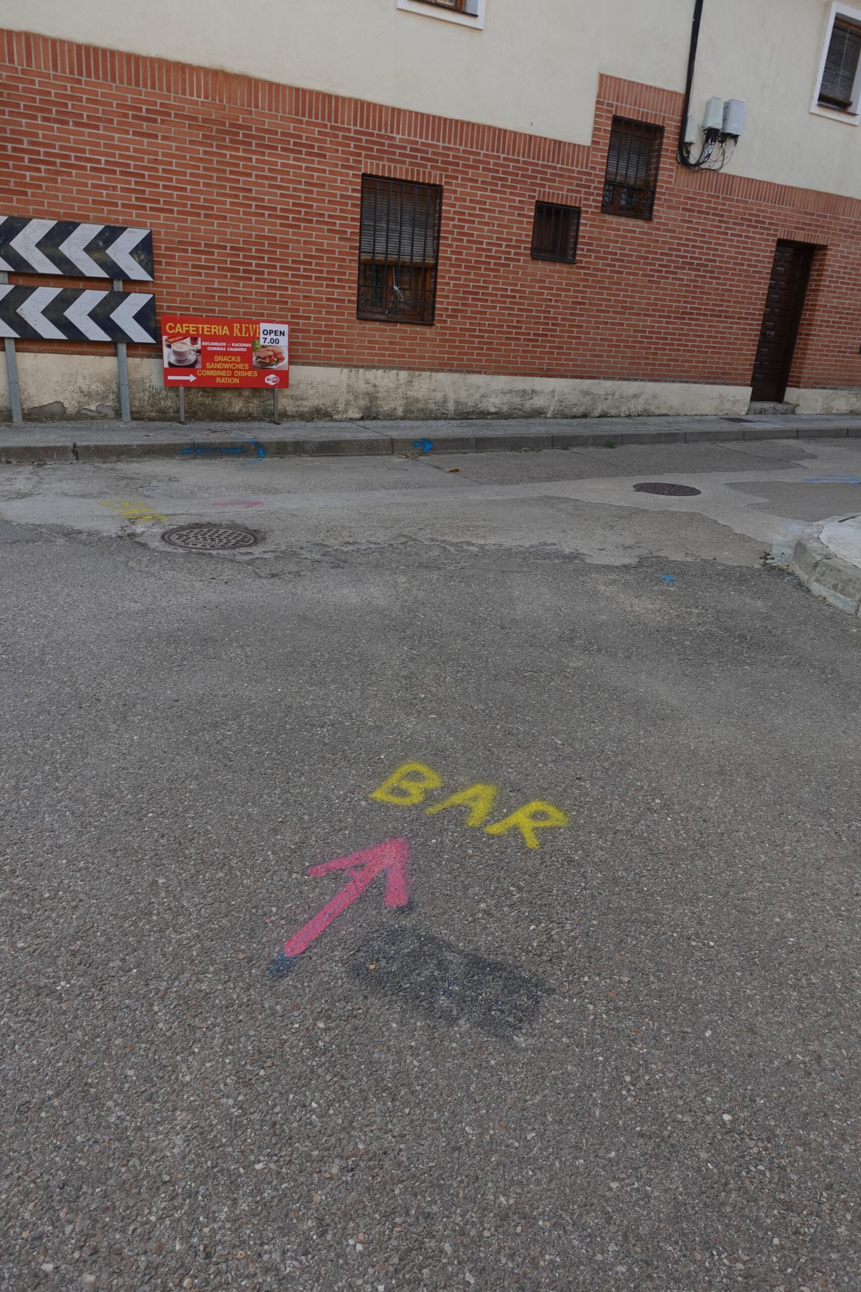 余談だが、道しるべの書き方も四国遍路とスペイン巡礼では少し違っていて面白い。石柱以外では道路標識に矢印が記されていることが多いのは同じだが、大きな違いは、スペインでは個人宅の塀などにもけっこう矢印が書いてあることと、公的・私的に関わらず、足元(地面)に誘導が書いてある場合が多いことだ。アスファルトにスプレーで分岐が書かれているのはざらで、時にはカフェやアルベルゲの案内まで書いてある。公共物とは…(笑)。逆に四国では、最近建てられたと思われる石柱に「土地提供者◯◯」と刻まれていて、それはそれで「ここまでやるか」と驚いた。お国柄が出ていて面白い。