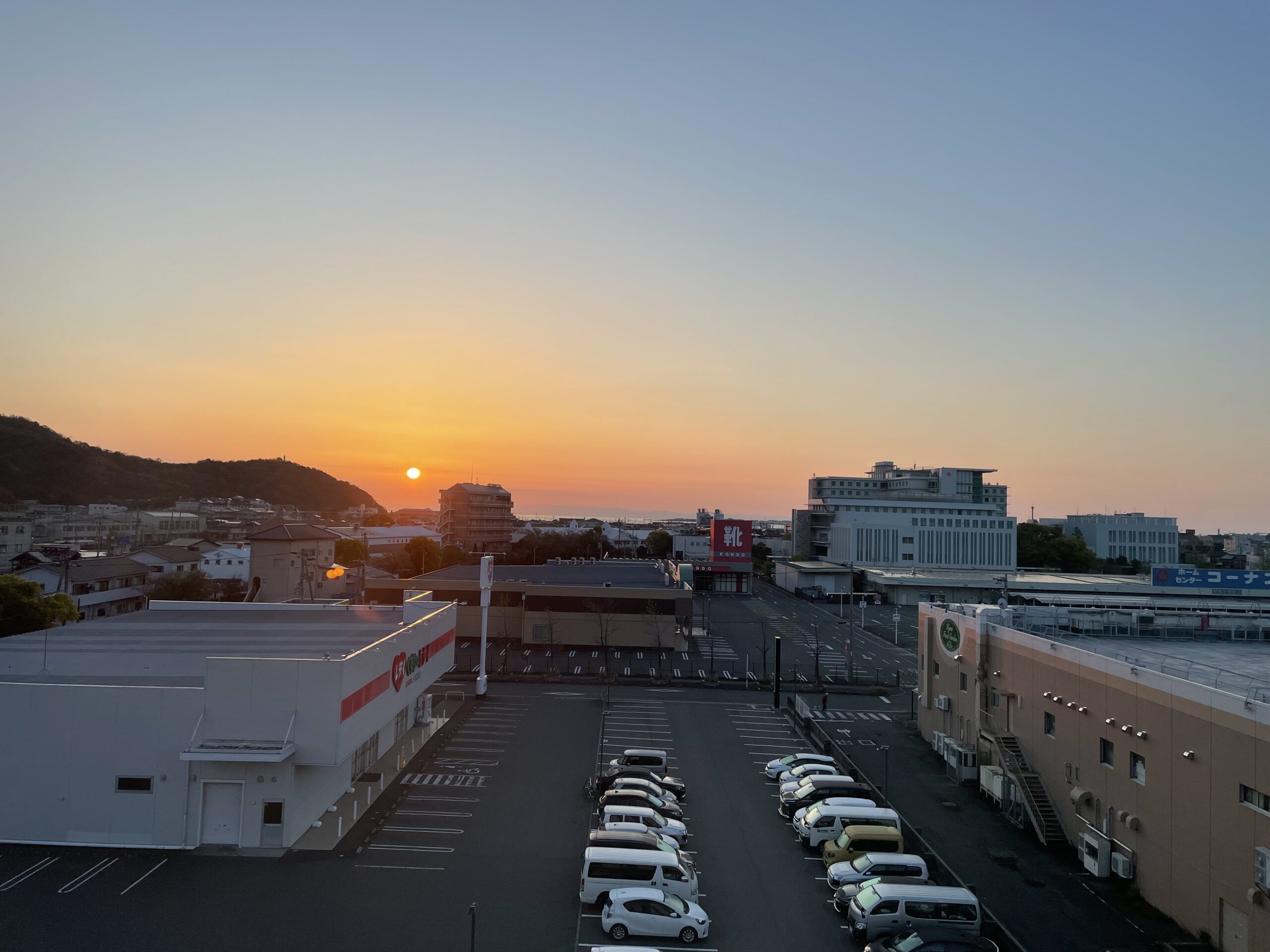5:30、起床。まずは景気づけに温泉に入りに行く。このホテルは一晩中大浴場が使えるタイプなので、チェックイン後は好きな時にお風呂に入り放題なのだ。熱いお湯のおかげで気分はスッキリ、だるかった脚もシャッキリである。部屋に戻ると空が明るんできていて、春霞に朝日がぽっかり浮かんでいた。今日もいい天気のなか歩けそうだ。