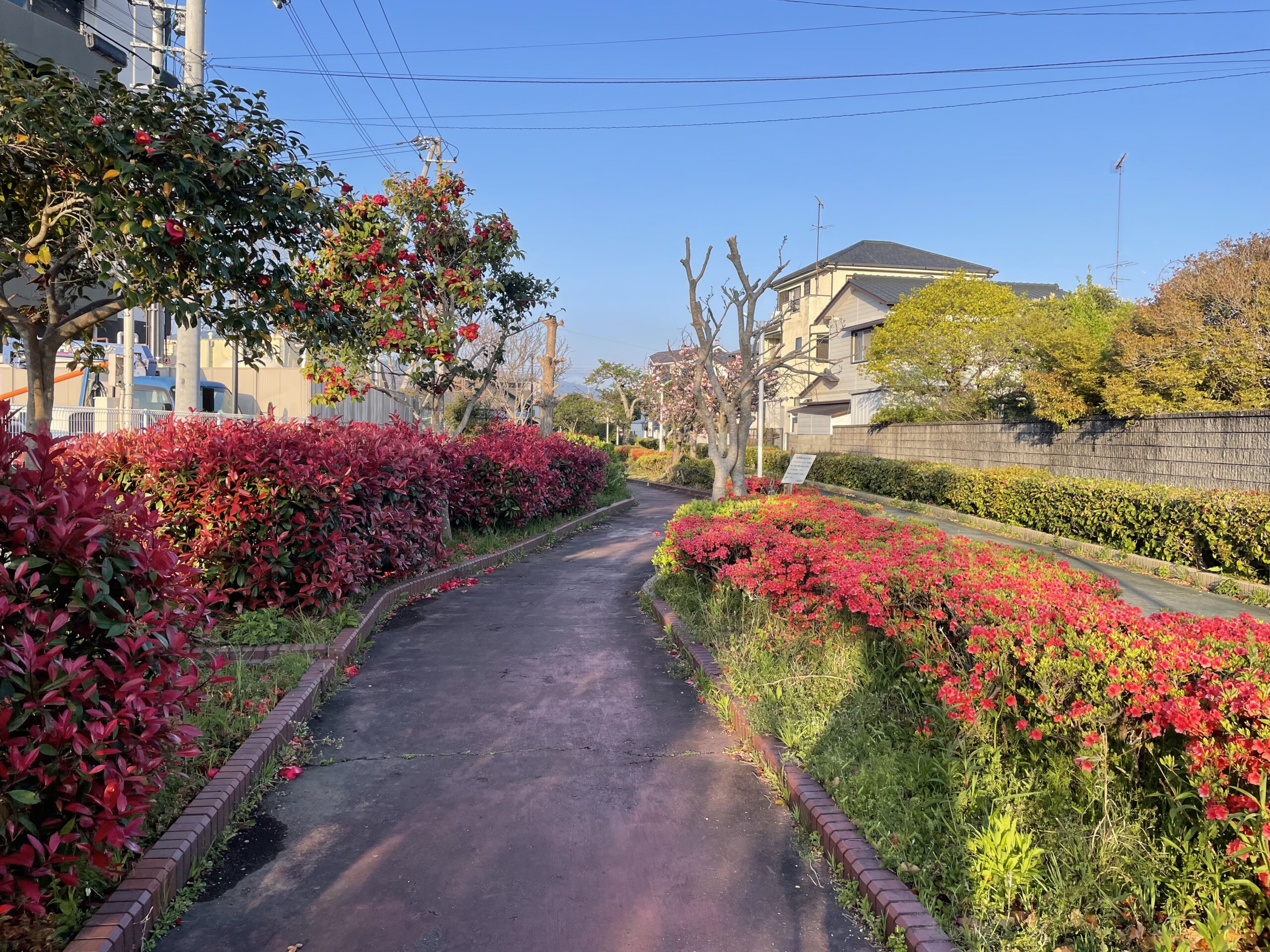 6:30、ちょうどオープンした朝ごはん会場に後ろ髪を引かれつつホテルを出発し、昨日歩いてきた遊歩道を戻って駅に向かう。さすがに登校する生徒はまだいないようだ。歩道はきれいにお手入れされており、片側は萌え出る赤い若葉、反対側は真紅のサツキ?が満開で、早朝の冷たい空気のなか歩いているととても気持ちがいい。遍路道ではないが、密かにお気に入りの道だ。