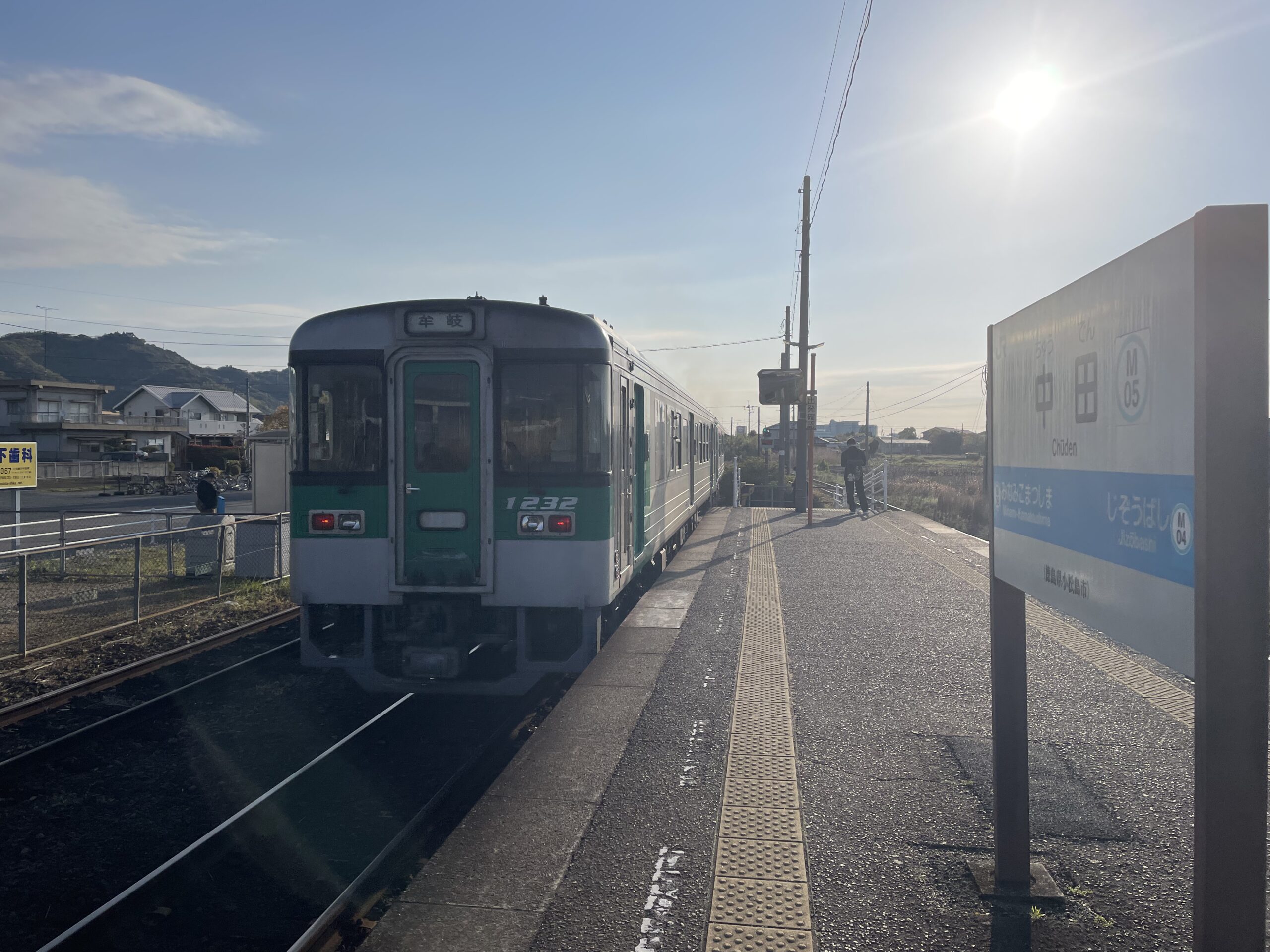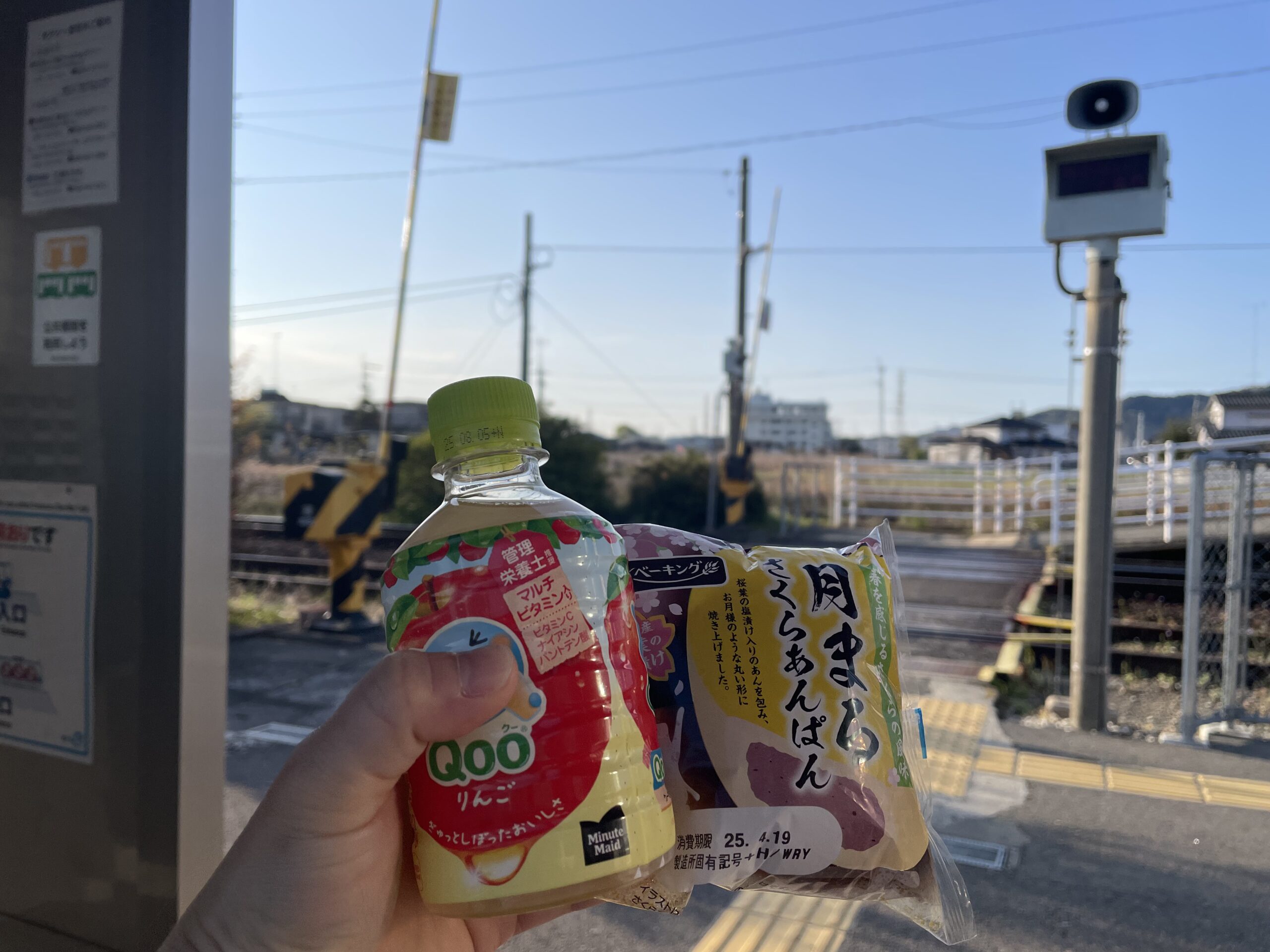 6:45、中田駅に到着。いい具合に回復しているのか、同じ距離を昨日より5分早く歩けている。電車の出発時刻は7:11なので余裕を見すぎたのだが、遅れるよりはいいだろう。駅前の自販機でリンゴジュース(Qooりんご。遍路中、ほぼ毎日飲んでいた)を買い駅舎に向かう。この駅には券売機もあったので、首尾よく切符も購入できた。よしよし、今のところ順調だ。待合室でさくらあんぱんを食べながら電車を待った。