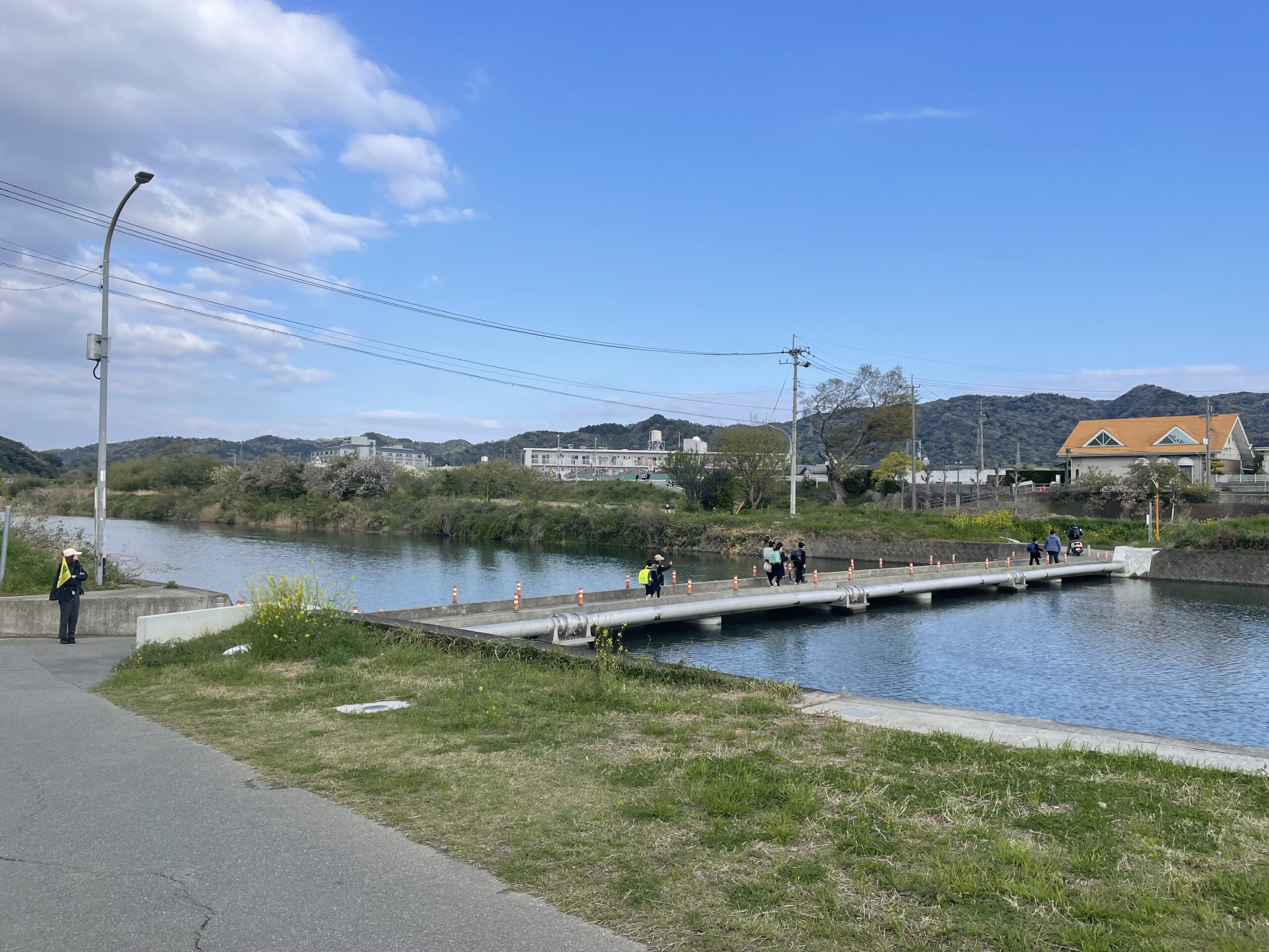 この戻ったところもそうで、ダイレクトに進むとただの県道の橋だが、ちょっと戻って遍路道を行けば、歩行者専用の潜水橋を渡ることができるのだ。ちょうど地元の小学生たちの登校時間だったようで、子供たちや見守りの保護者さんが爽やかに挨拶してくれるなか、春風のそよぐ小さな橋を渡る。四国は素敵だ。