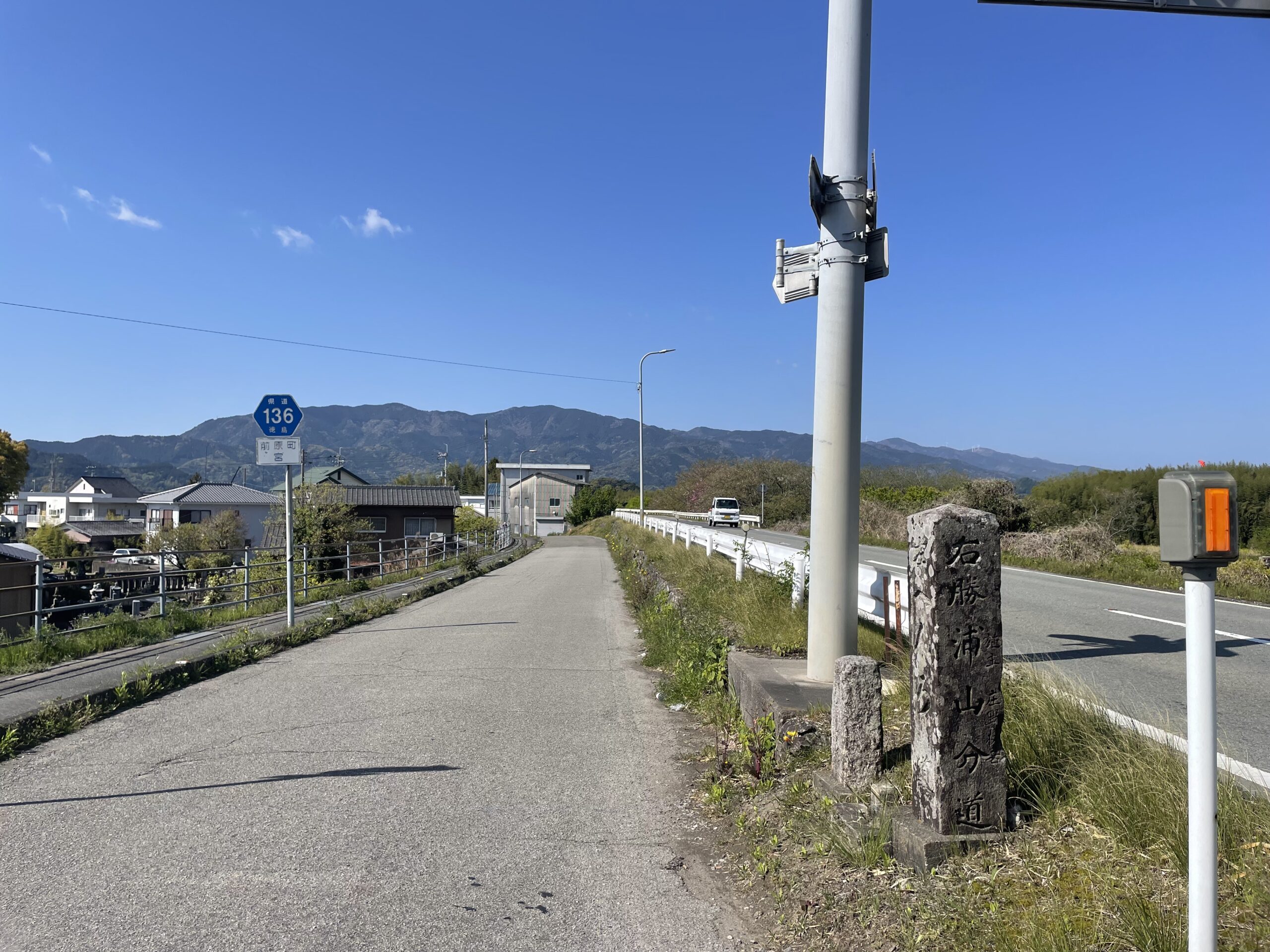 ちょいちょい道を間違ってはリカバーしながら1時間ほど歩いて、やっとしっかりした道しるべ(新しめの石柱)が現れた。丁寧にも「大松川橋へ」と記してくれていたので、指示通り「大松川橋」方向へと道路を渡り、続いて「勝浦川橋」へ向かう。相変わらず川の水は底が見えるほど透き通っていて、晴天のおかげもあってか碧色に輝いて見えた。勝浦川は徳島市と小松島市の市境になっている。次に徳島市に戻ってくるのは、2ヶ月後くらいかな。